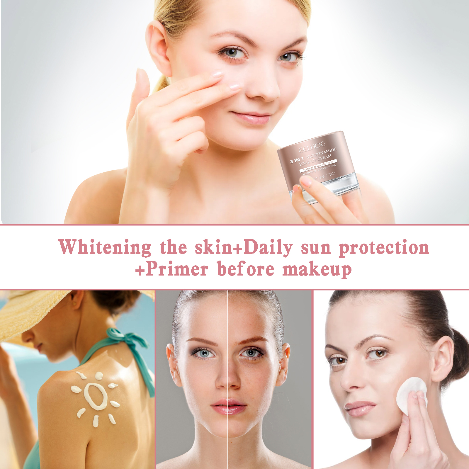 Our 3-in-1 brightening cream contains shea butter, arbutin, and white rose extract. It can effectively increase skin moisture, fully moisturize skin, keep your skin hydrated, shrink pores, reduce wrinkles and delay the aging process of skin, make your skin smooth and firm, fade stains and blemishes. Its use method is very simple: first after cleansing and toning, then apply appropriate amount of this product on the face skin, and finally gently massage with your hand to evenly spread and absorb it. After use, it helps to lighten skin tone, enhance skin elasticity, delay skin aging, add moisturizing ingredients, effectively moisturize skin, and provide long-term moisturizing effect.