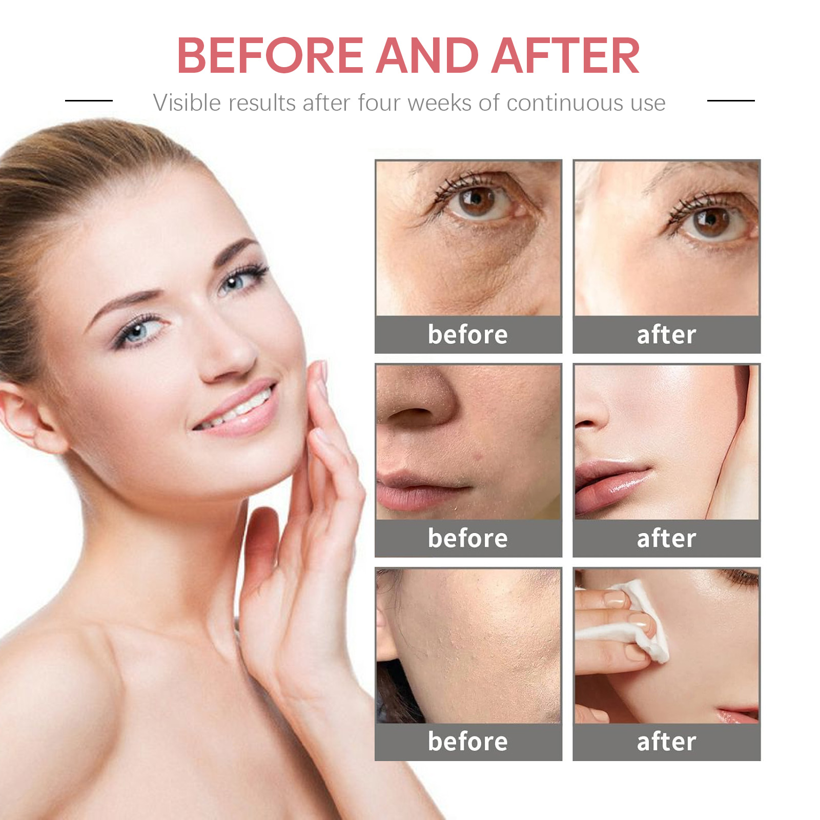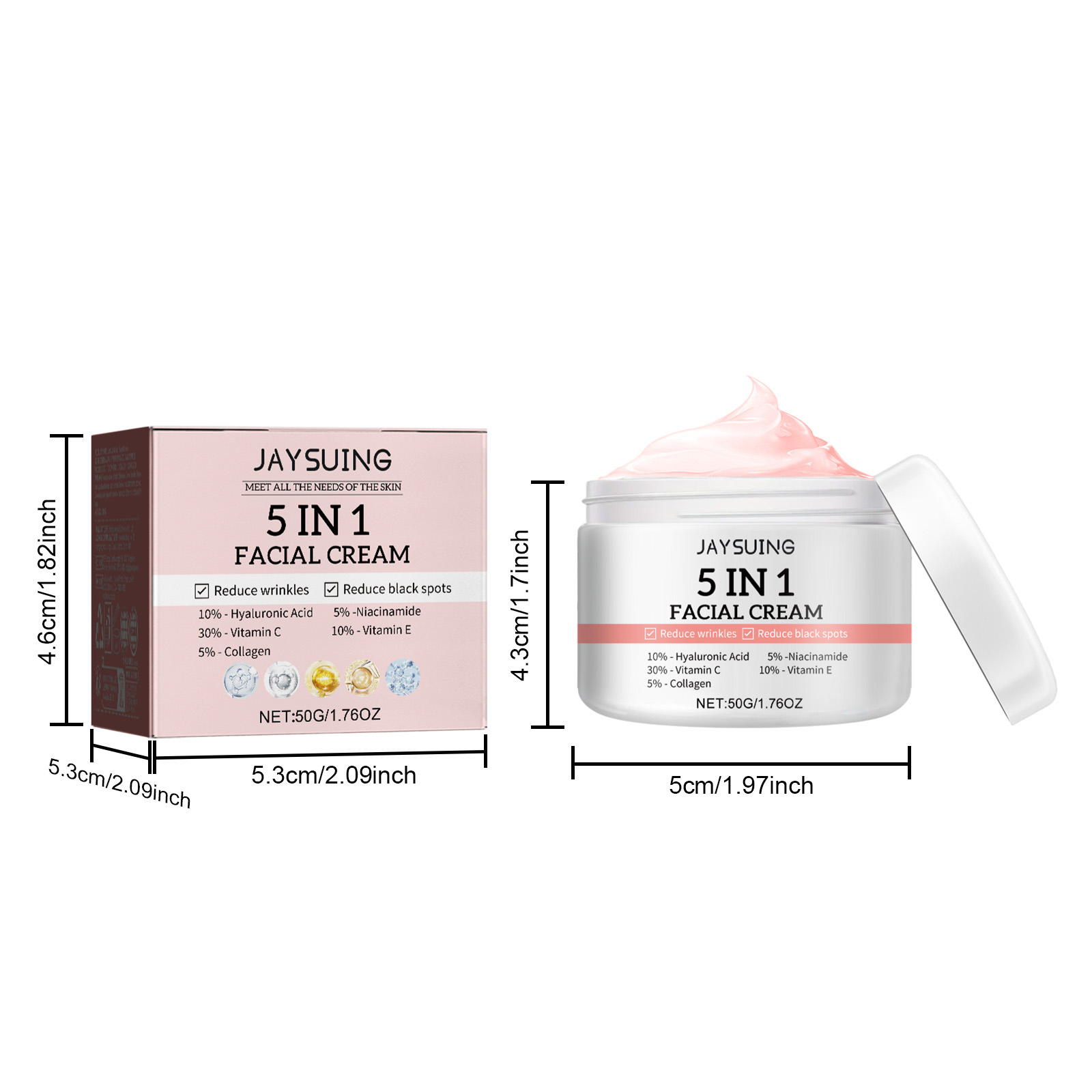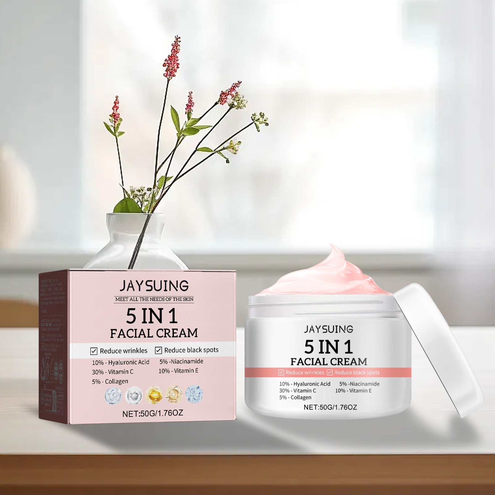 Our 5 in 1 firming cream contains hyaluronic acid, niacinamide and vitamin C. It can effectively smooth wrinkles, nourish and moisturize wrinkles, dryness and other dry, aging skin symptoms; Improving skin tone helps skin stay young, soft and balanced, improving skin tone, dehydration and maturation of aging skin. The way to use it is simple: after cleansing, apply the cream evenly to the face and gently massage until it is completely absorbed. 5 in 1 Firming Cream nourishes skin and deeply hydrates. Leaves skin feeling silky smooth and glowing.