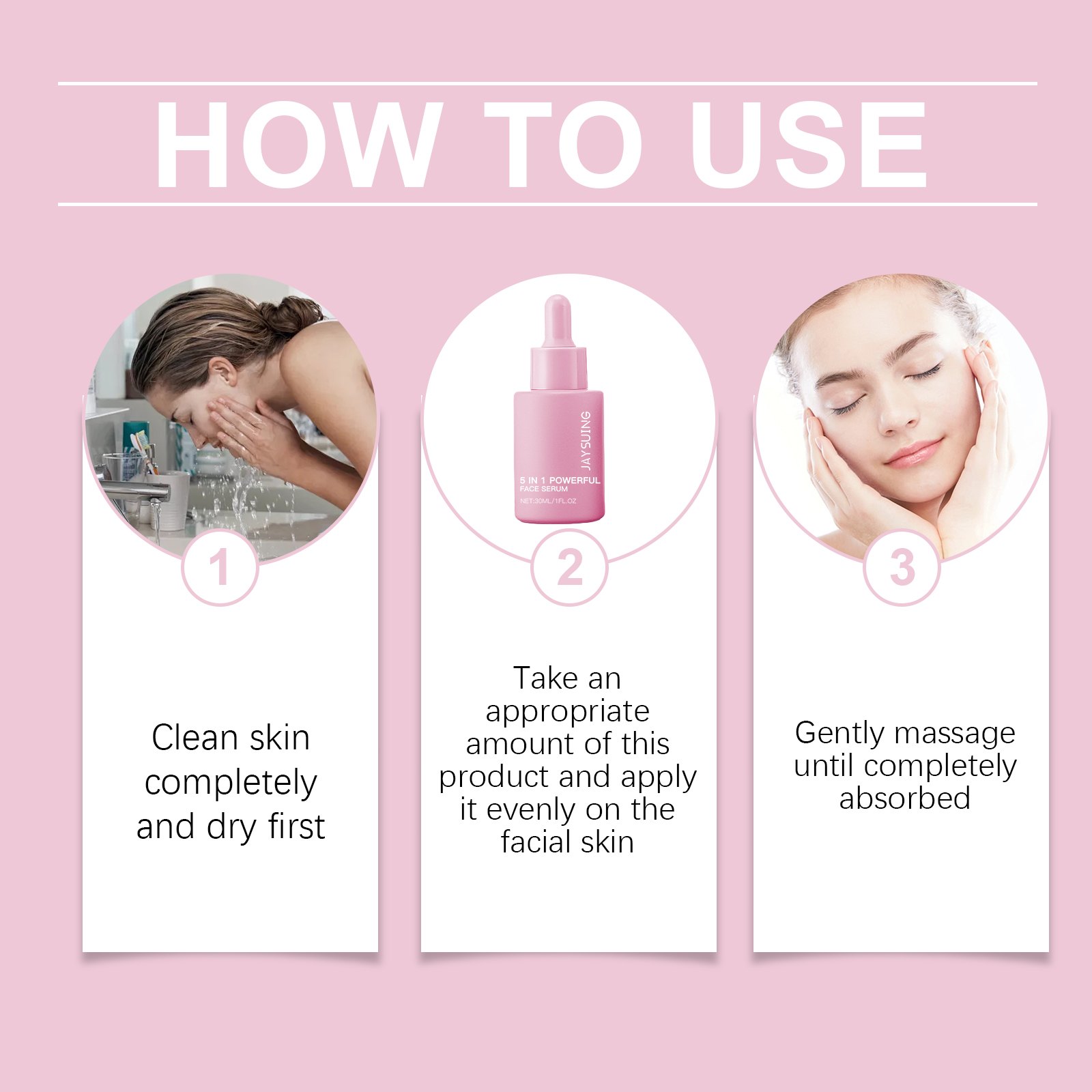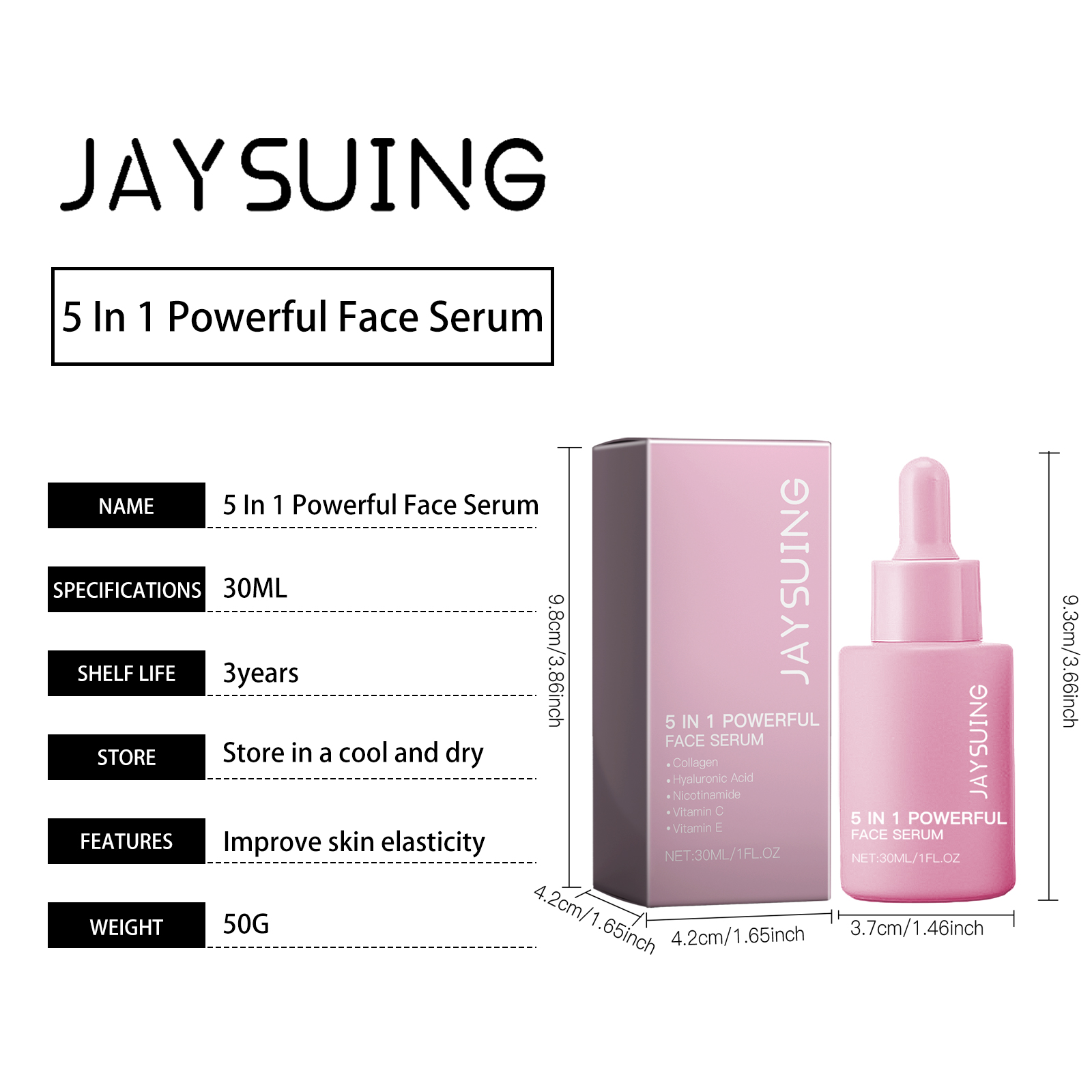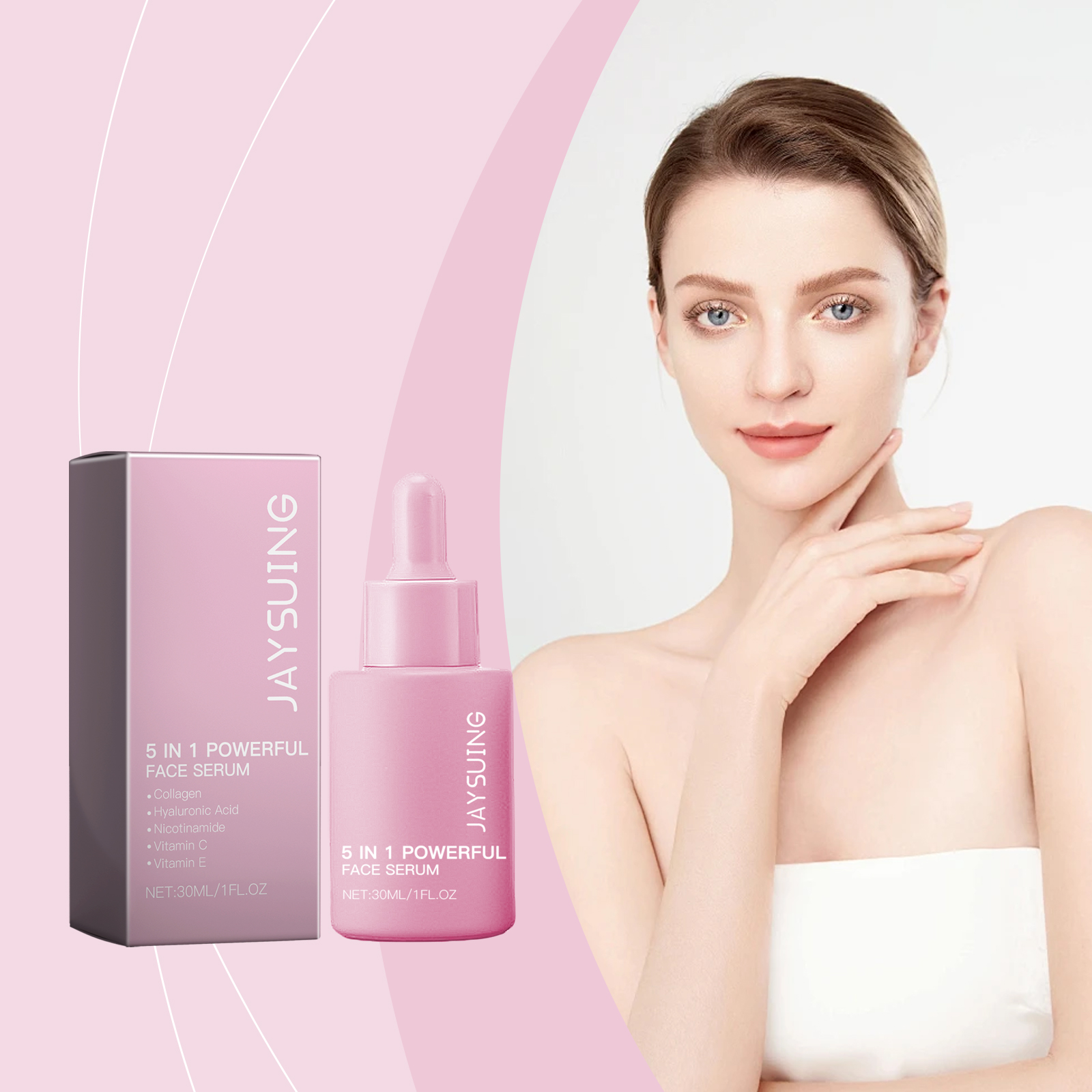 Our 5 in 1 moisturizing serum contains ascorbic acid (vitamin C), tocopherol (vitamin E), and acetyl tripeptide-1. It can regulate skin oil secretion, prevent dullness and dryness, and maintain skin balance. Its application method is very simple: thoroughly clean the skin, dry, evenly apply appropriate amount of this product to the face skin, gently massage until completely absorbed. It can also shape the face, enhance the jaw line and cheek line, and restore firm skin. Easy to absorb, not greasy, not clogging pores.