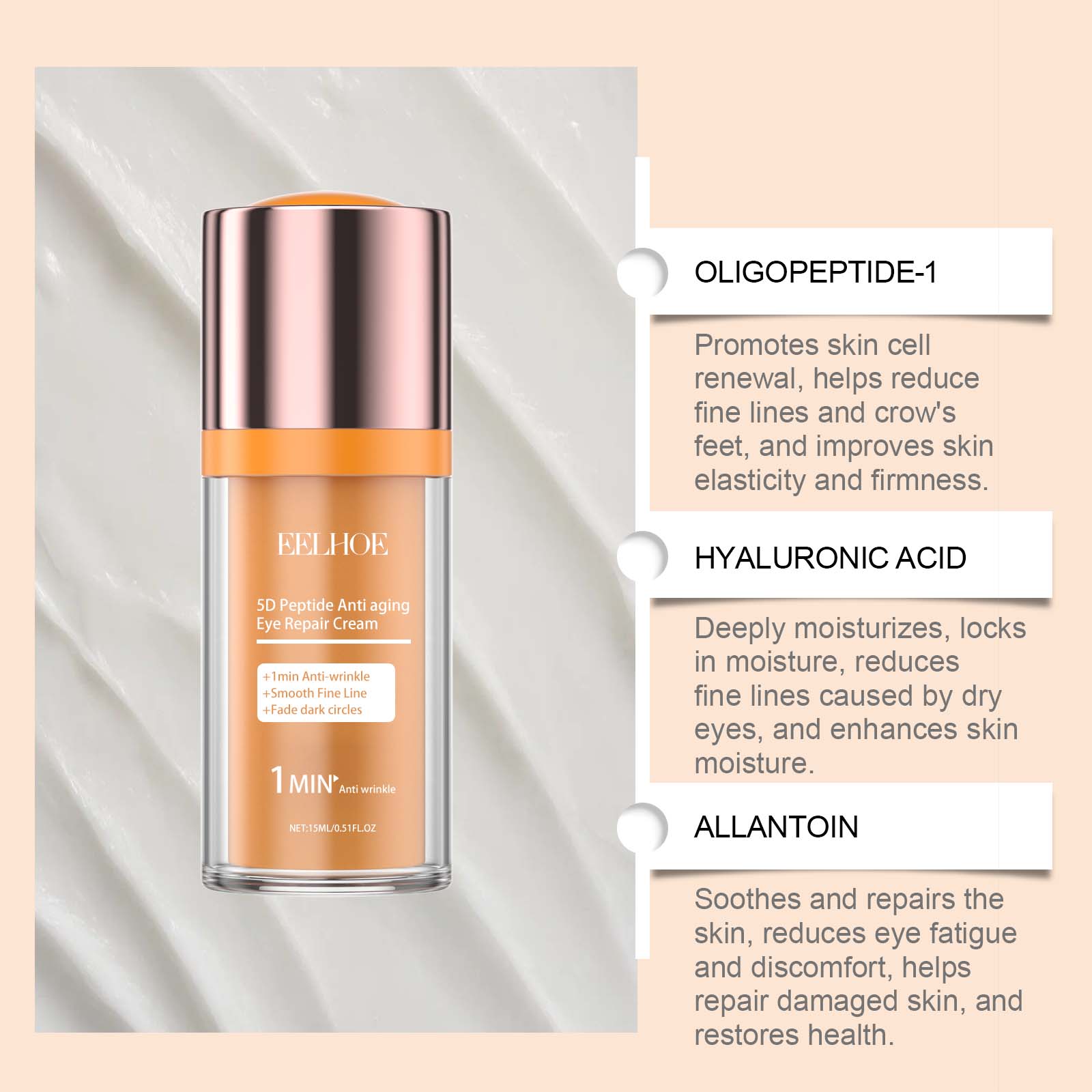 Our 5D Peptide Eye Repair cream contains oligopeptide-1, hyaluronic acid, allantoin. It provides deep moisture to the skin around the eyes, helping to lock in moisture, relieve dryness and tightness, and keep the skin around the eyes hydrated and soft for a long time. Its application method is simple: 1. Clean the skin around the eyes and keep it dry. 2. Apply appropriate amount of the product to the skin around the eyes, gently massage until absorbed. Scientific formula, effectively improve skin elasticity, reduce sagging, tighten eye contour, enhance the smoothness and luster of the skin around the eyes.