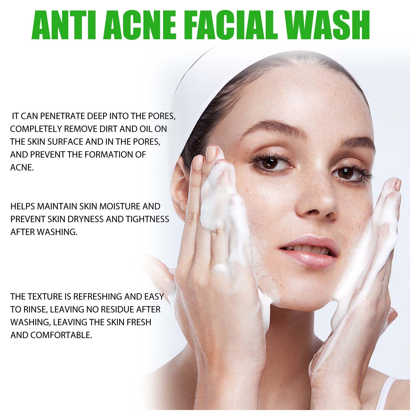 Our Anti Acne Facial Wash contains Hyaluronic Acid, Chamomilla Recutita (Matricaria)Flower Extract, Glycerin. It can penetrate deep into the pores, thoroughly remove dirt and oil on the skin surface and inside the pores, prevent the formation of acne, help maintain skin moisture, and prevent dry and tight skin after washing. Its use method is very simple: take appropriate amount of this product on the palm, apply to the wet face, gently massage for 2 minutes, wash thoroughly with water. This product has a refreshing texture and is easy to rinse, leaving no residue after washing, leaving skin fresh and comfortable.