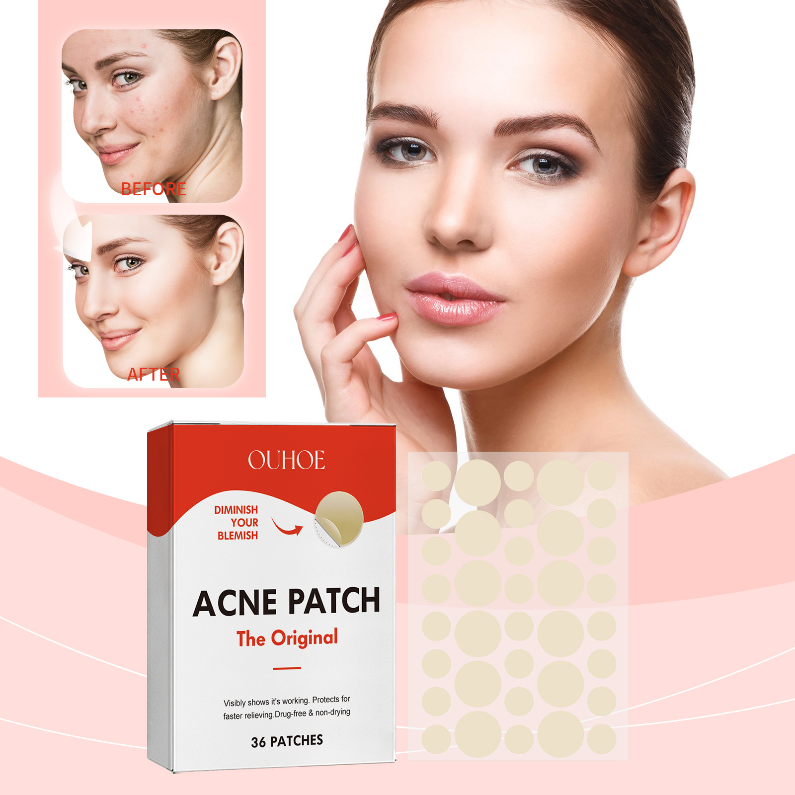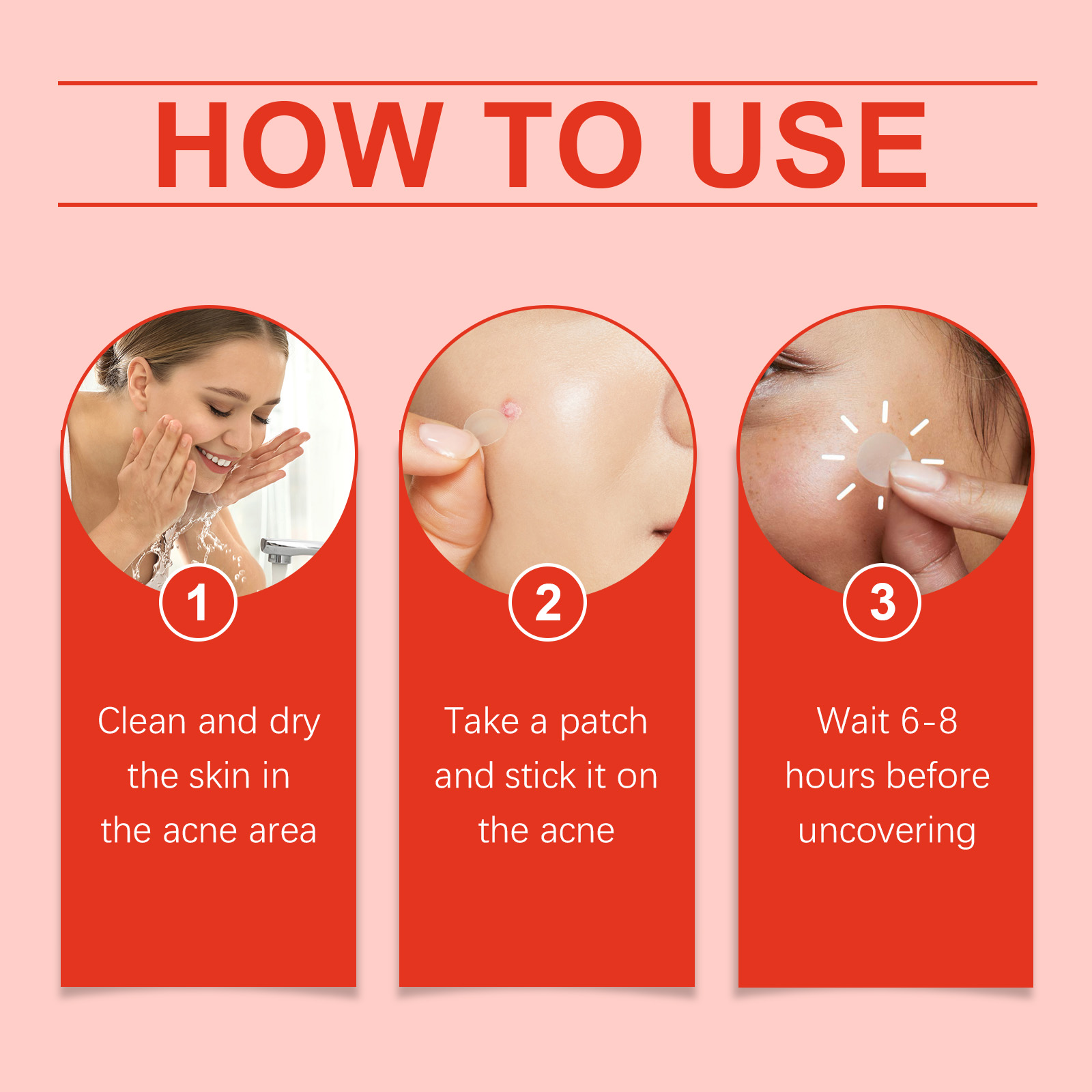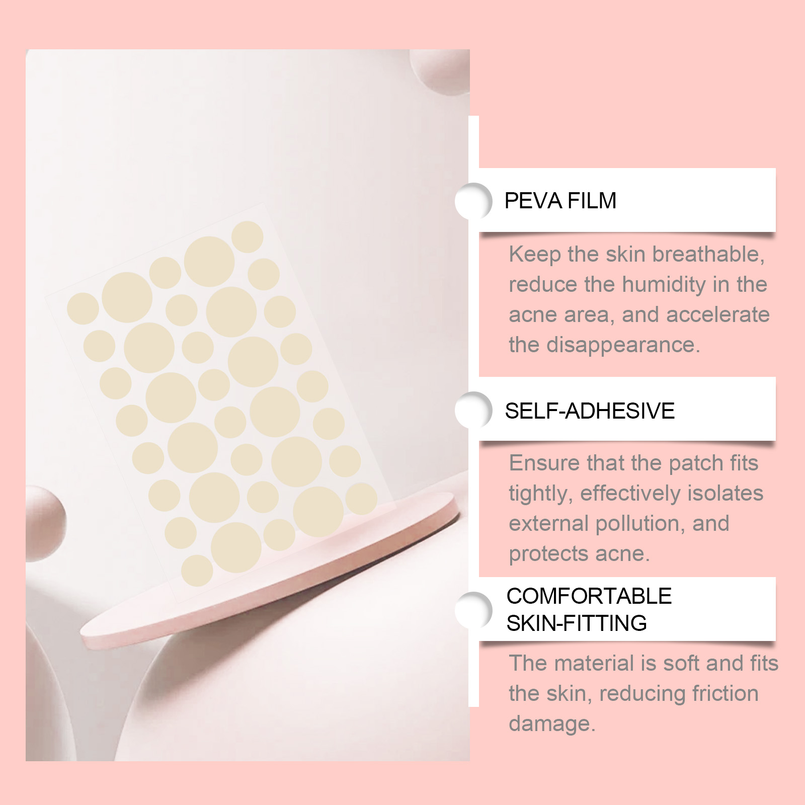 Our Acne Patch contains Peva Film, Self-Adhesive. It can repair damaged skin, prevent scar formation, can fit the skin, directly act on acne, accelerate the maturation and fading of acne, reduce scar formation, regulate sebum secretion, prevent new acne, keep skin fresh. The way to use it is simple: clean and dry the skin on the acne area, apply a patch to the pimple, and wait 6-8 hours before uncovering it. It can directly cover acne, deep repair, accelerate healing, durable adhesion, not easy to fall off, and maintain the continuous release of efficacy.