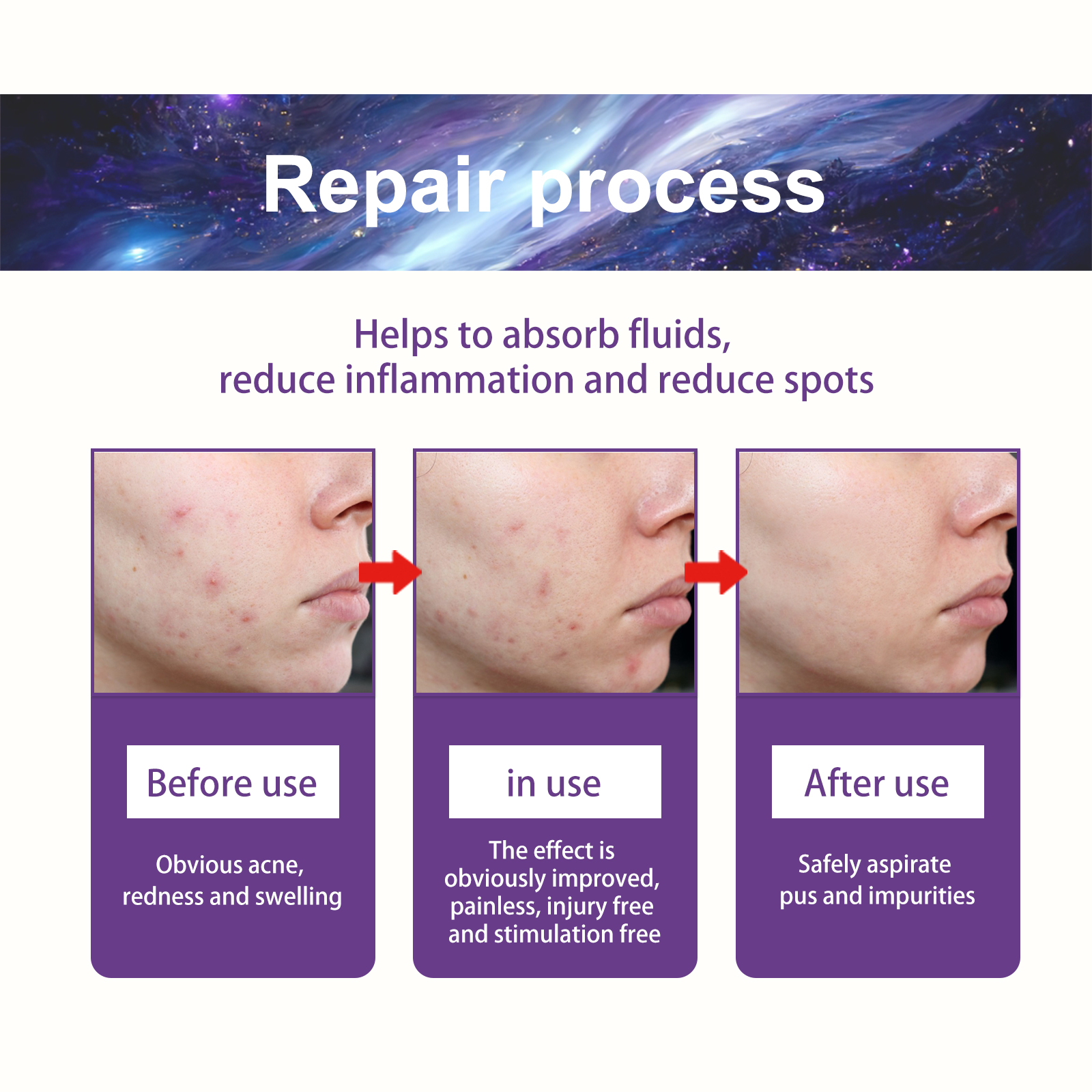 Our acne patches contain salicylic acid and tea oil. It can help eliminate pimples, protect the skin and support natural healing. Its use is very simple: it needs to be cleaned and used. Gently pat with a clean towel, gently tear the package, take out your favorite shape, apply the patch to the affected area, press on the edge of the affected area, 6 hours later, 6 hours, enjoy skin health. And it can get rid of acne.