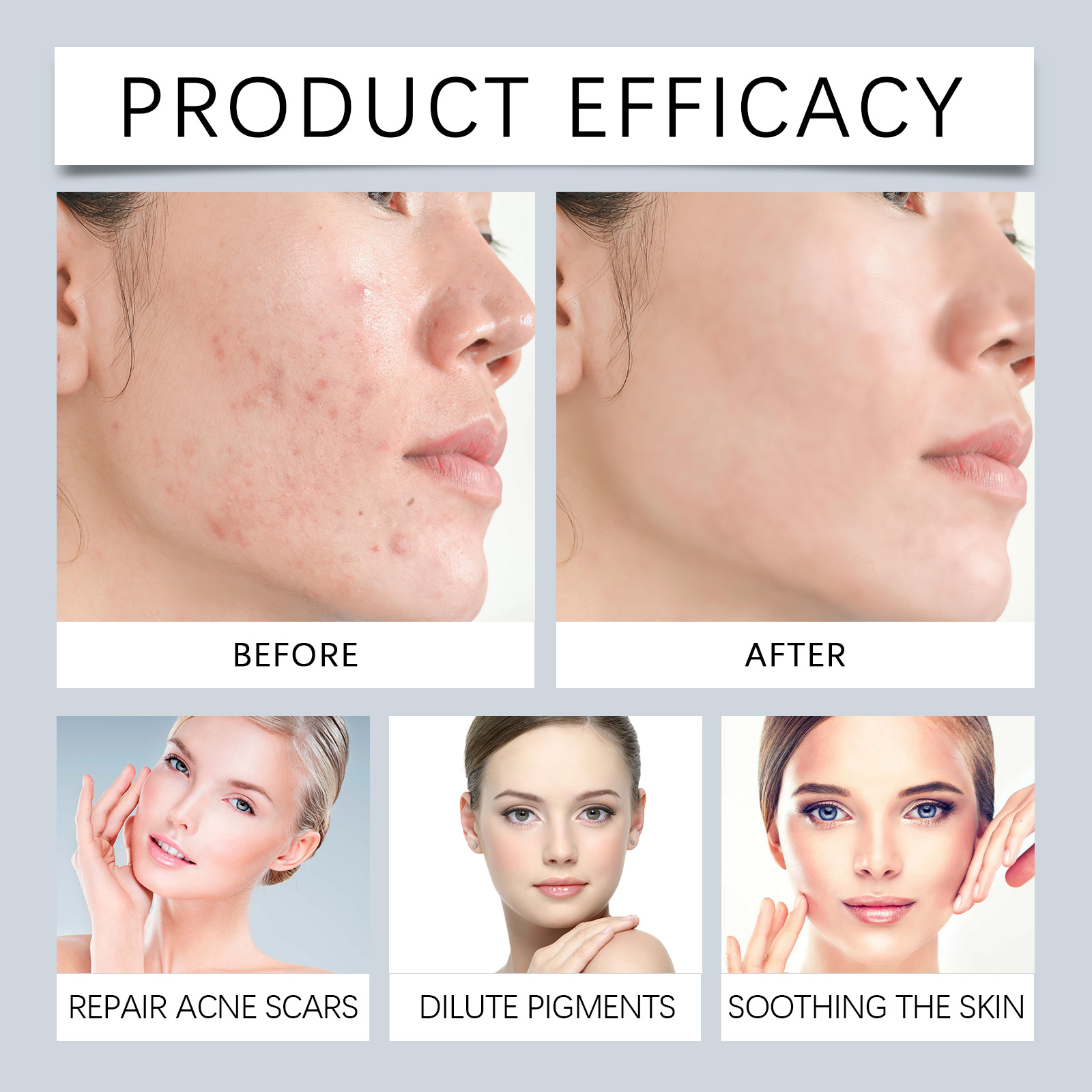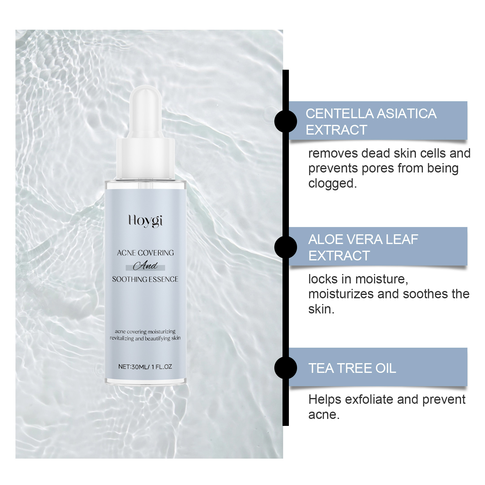 Our anti-acne soothing serum contains Glycyrrhiza glabra root extract, Centella asiatica extract, aloe Vera leaf extract. It can deeply clean pores and prevent acne. Its application method is very simple: thoroughly clean and dry the skin, apply appropriate amount of this product evenly to the face skin, gently massage to promote full absorption. And can effectively remove acne marks, help skin restore luster and smooth.