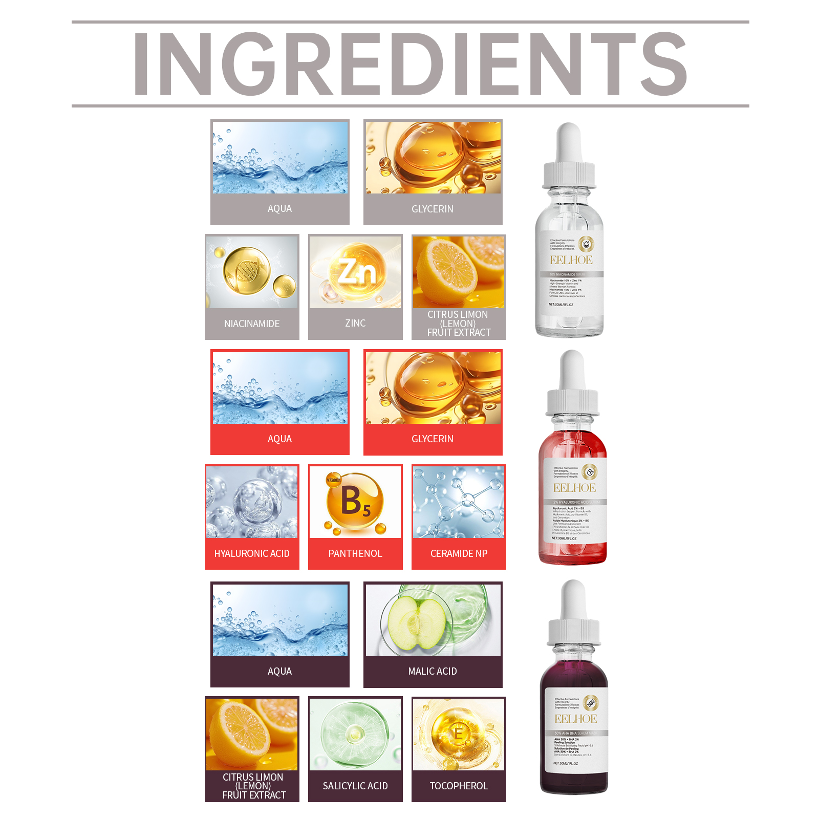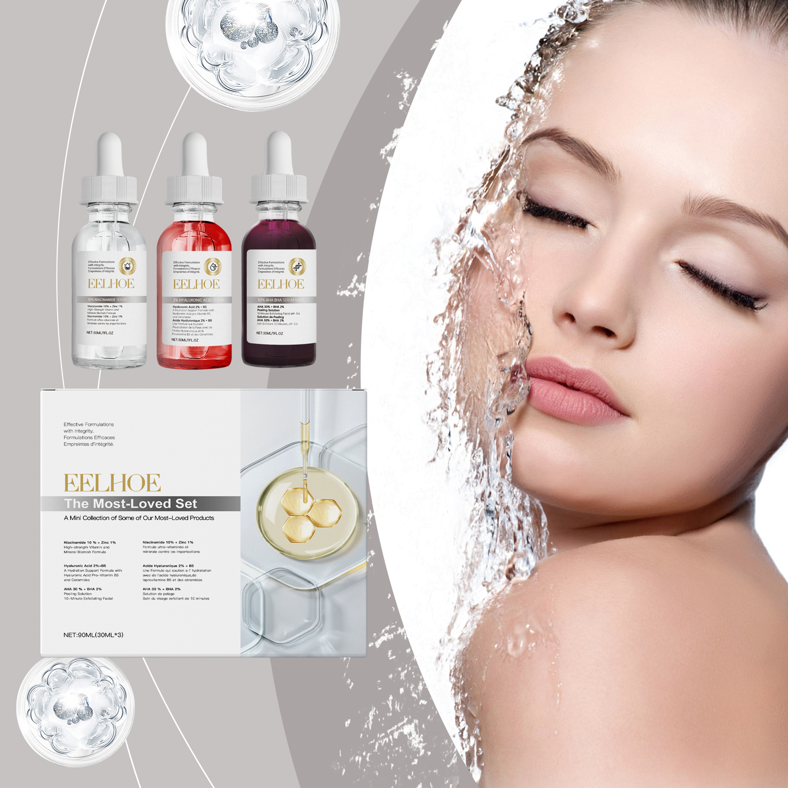 Our acne kits contain glycerin, hyaluronic acid and vitamin B5. It locks in moisture and provides long-lasting moisture; Improve skin transparency and make skin glow. Its use is simple: 10% nicotinamide serum :1. Clean and dry facial skin; 2. Take proper amount of essence and evenly apply it on the face; 3. Gently massage until absorbed. 2% hyaluronic acid serum :1. Cleanse and dry facial skin; 2. Apply proper amount of serum evenly on the face; 3. Gently massage until absorbed. 30% fruit acid salicylic acid Essence Mask 1. Clean and dry facial skin; 2. Take proper amount of essence and evenly apply it on the face; 3. Wait 5-10 minutes, then wash your face with water. Deep repair, relieve skin discomfort.