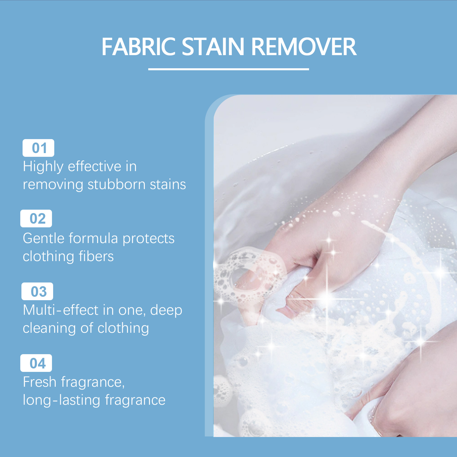 Our all-in-one fabric stain remover contains active enzymes, sodium bicarbonate and coconut oil. It can strongly remove oil, sweat and food stains. Provides deep cleaning while keeping the fabric soft. Prevent dirt from reattaching and keep clothes clean for a long time. Its application method is very simple: use this product directly on the stain, wait 2 minutes, gently rub, rinse off. Quick effect, shorten washing time. Efficient cleaning, prolong the service life of clothing.