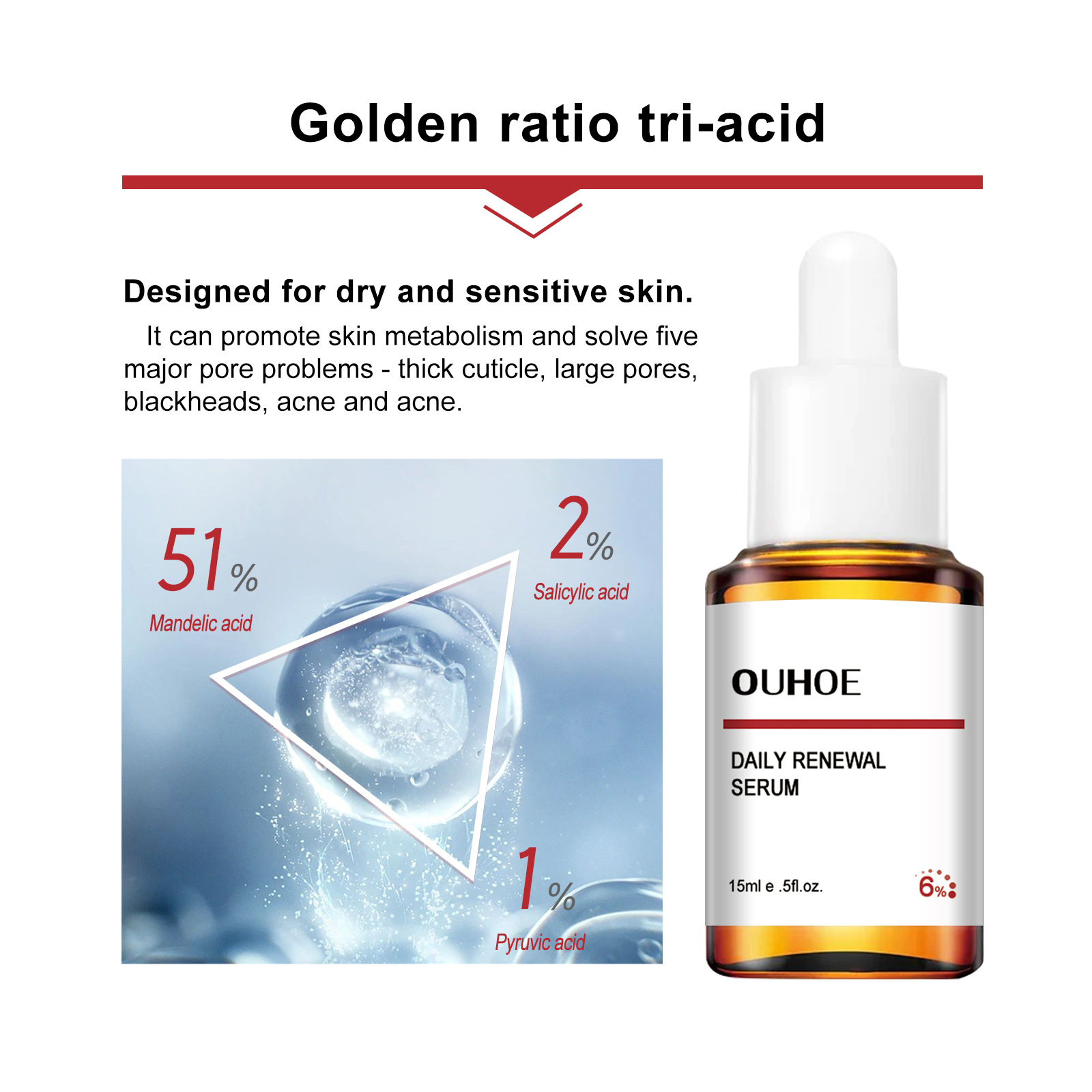 Our daily mandelic acid Update serum contains mandelic acid, salicylic acid and pyruvate. It can boost skin metabolism and solve five major pore problems - thick corneum, large pores, blackheads, acne and pimples. Its use method is very simple: after cleansing, before toning, apply appropriate amount evenly on the face and neck. Use every day, day and night. And can remove blackheads, narrow pores gently, moisturize sensitive skin.