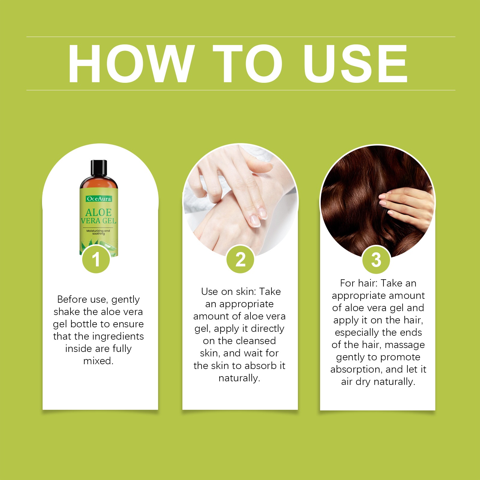 Our aloe vera gel contains aloe vera extract, AGAR, citric acid. It can be used for all aspects of hair and skin care. Nourishes scalp and skin, restores natural shine. How to use it is simple: 1. Before using, gently shake the aloe vera bottle to ensure that the ingredients inside are well mixed. 2. Skin use: Apply proper amount of aloe vera lotion directly on the clean skin and wait for natural absorption by the skin. 3. Hair: Apply proper amount of aloe vera gel to the hair, especially the end of the hair, gently massage to promote absorption, and let the hair dry naturally. Effectively restore and repair common skin problems to help skin regain health and vitality.
