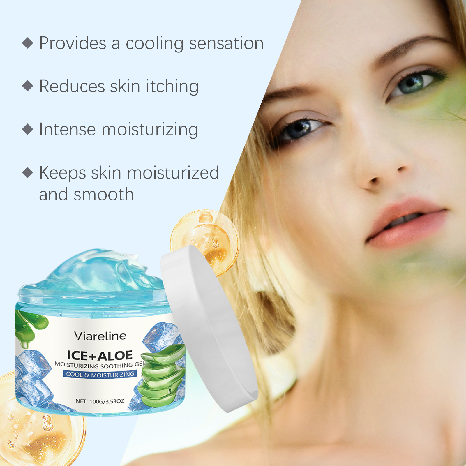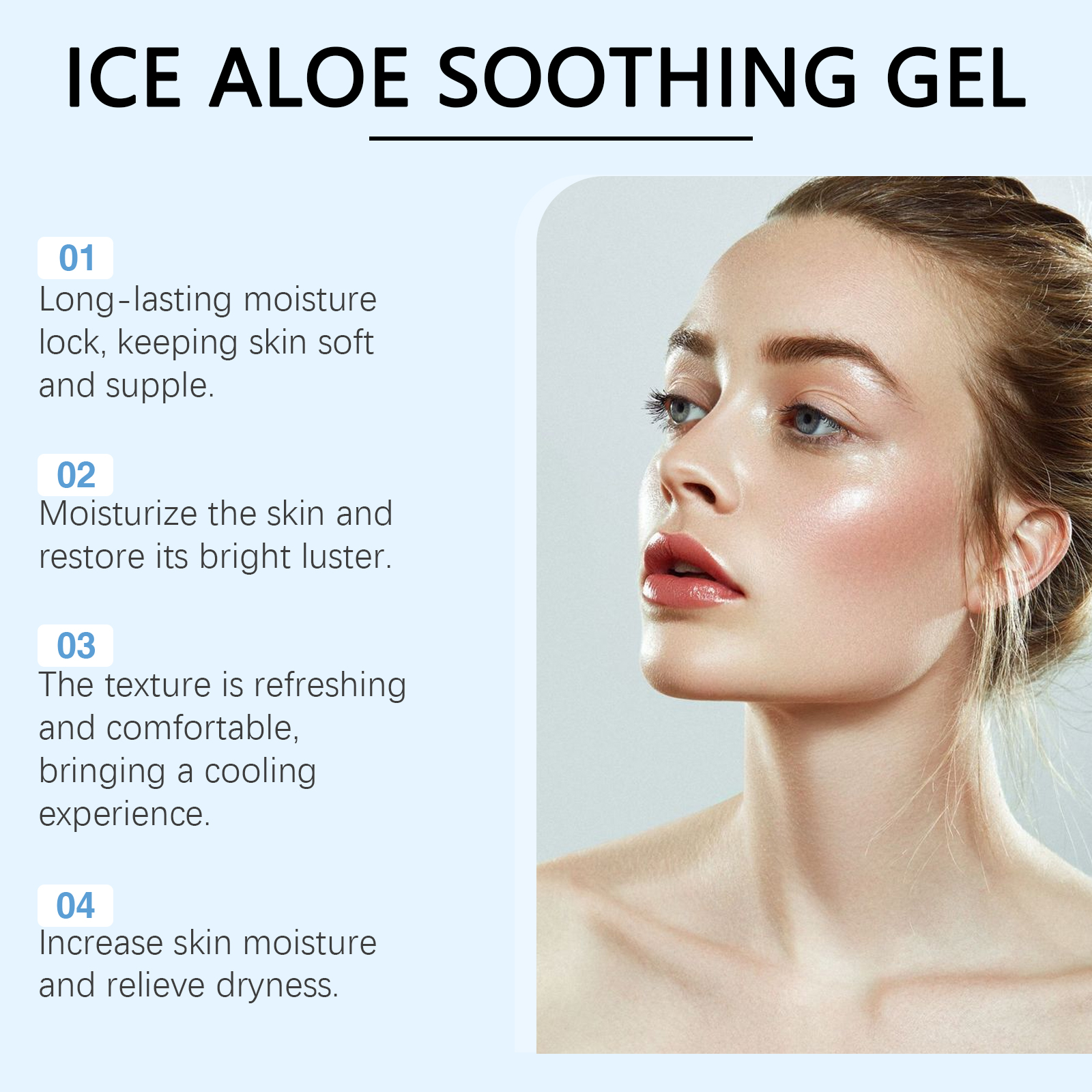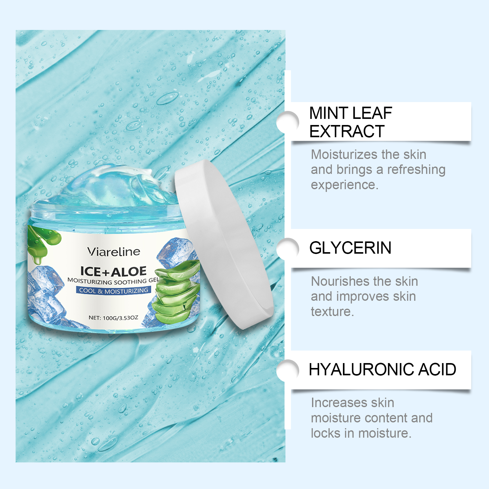 Our aloe Vera moisturizing gel contains aloe vera leaf extract, mint leaf extract. It is easy to use and offers a refreshing, moist texture for all skin types. Relieve dryness and discomfort, improve skin moisture. Helps to lock in moisture, keeping skin soft and smooth, leaving skin more hydrated and shiny after application. The way to use it is simple: clean your face and keep it dry. Apply appropriate amount to face evenly. Massage gently until absorbed. And can be used continuously, the skin feels softer and smoother. The formula is refreshing, non-greasy and suitable for all skin types.