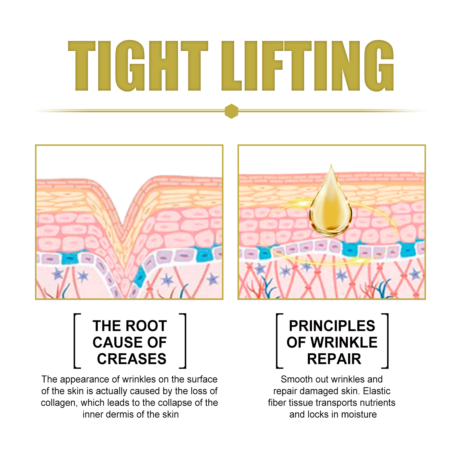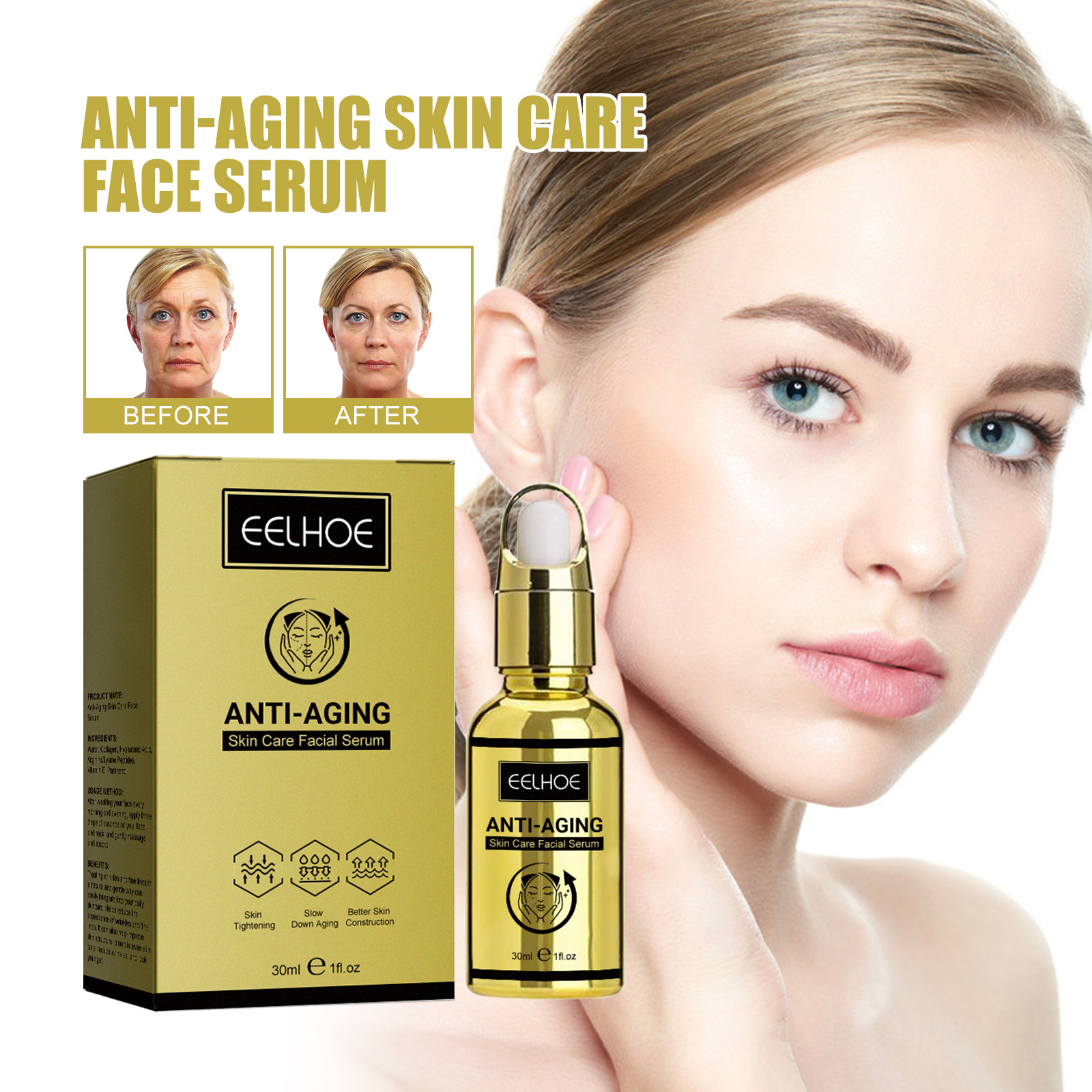 Our anti-aging serum contains collagen, hyaluronic acid and arginine/lysine. It can help reduce the appearance of wrinkles and fine lines. It can also help improve skin structure, promote even skin tone, reduce wrinkles, and look younger. Its use method is very simple: every morning and evening after cleansing, take three drops of essence evenly apply to the face and neck, gently massage absorption. Anti-aging serum smooths wrinkles and restores damaged skin. Elastic fibrous tissue transports nutrients and locks in water.