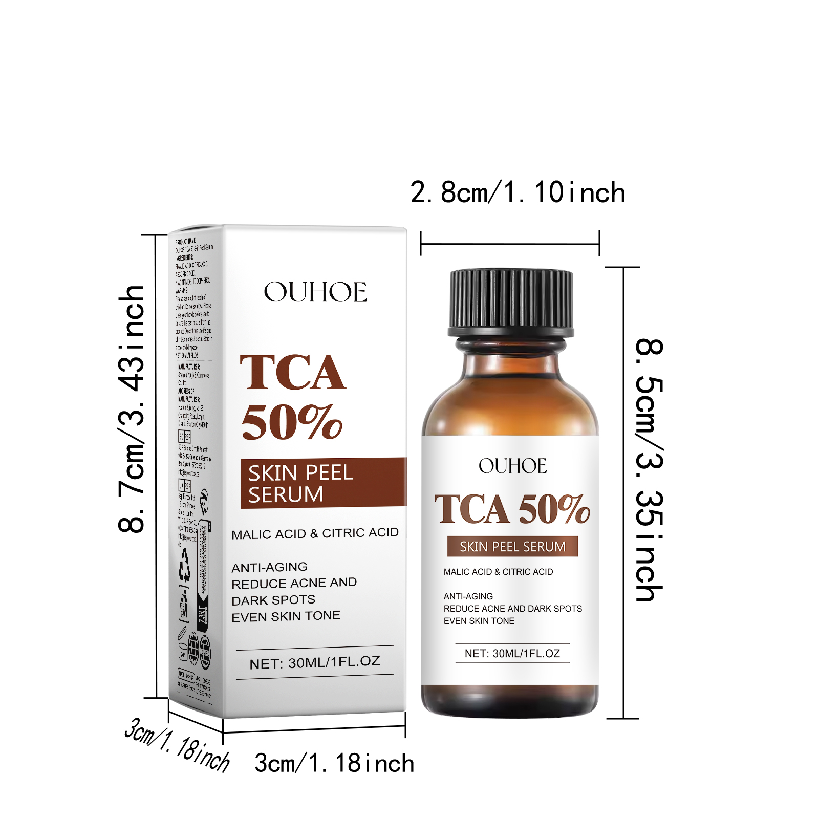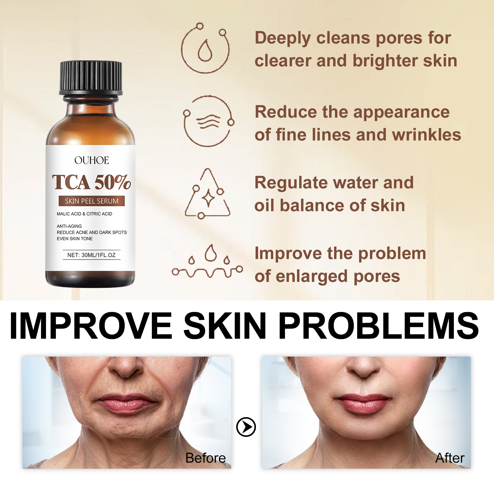 Our TCA 50 Skin Peel Serum contains malic acid, citric acid, ascorbic acid. It can effectively slow the aging process of skin, reduce fine lines and wrinkles, improve skin elasticity, and make skin look younger and firmer. The way to use it is simple: clean and dry the skin, take the appropriate amount of essence on the hand, apply the product to the skin, gently massage until absorbed. It can shrink pores, adjust the balance of water and oil in the skin, improve the problem of coarse pores, and make the skin more delicate and smooth.