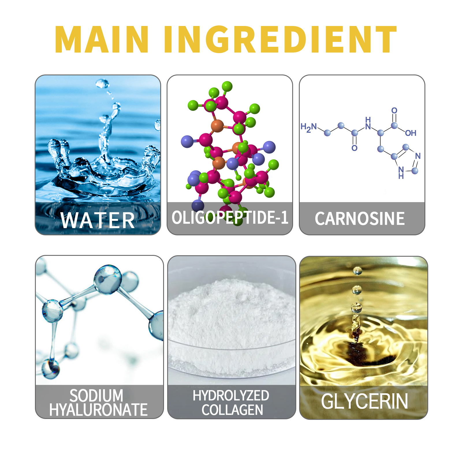 Our anti-aging serum contains sodium hyaluronate, hydrolyzed collagen, and glycerin. It can moisturize and repair the skin, promote skin tone firmness, reduce wrinkles, deep hydration, and make facial skin smooth and soft. Its use method is very simple: first, after cleaning and toning, take 2-3 drops of essence evenly apply on the face, and then massage gently with your fingertips until absorbed. It is recommended to use once in the morning and once in the evening for better effect. After use, it helps collagen production, penetrates deeply, reduces signs of aging and eye skin problems, and makes you look younger and more energetic.