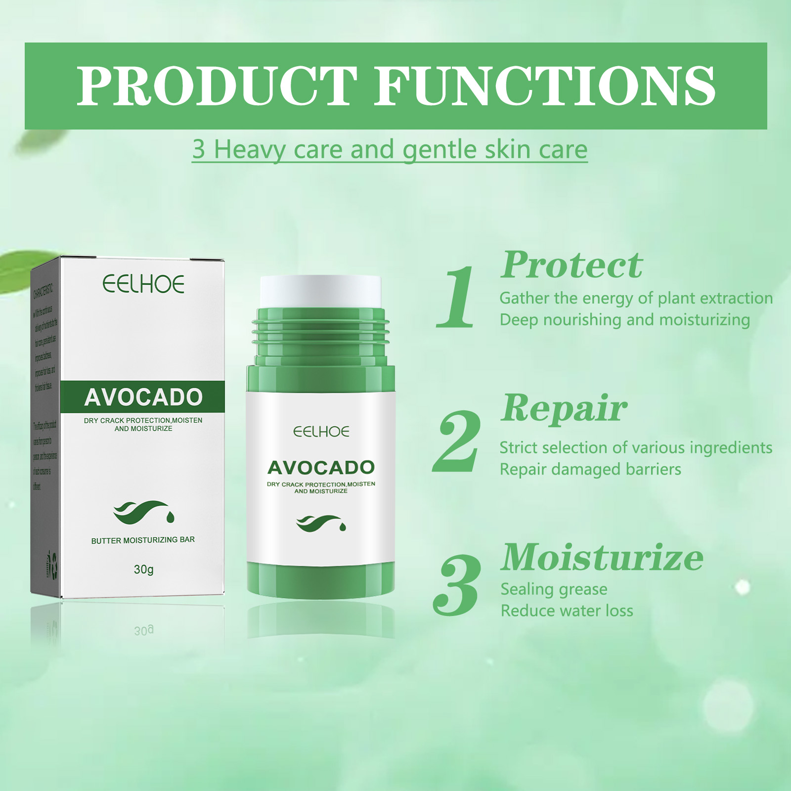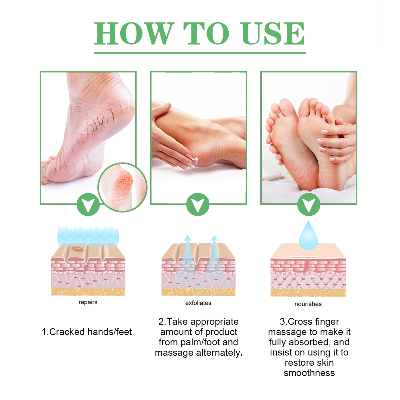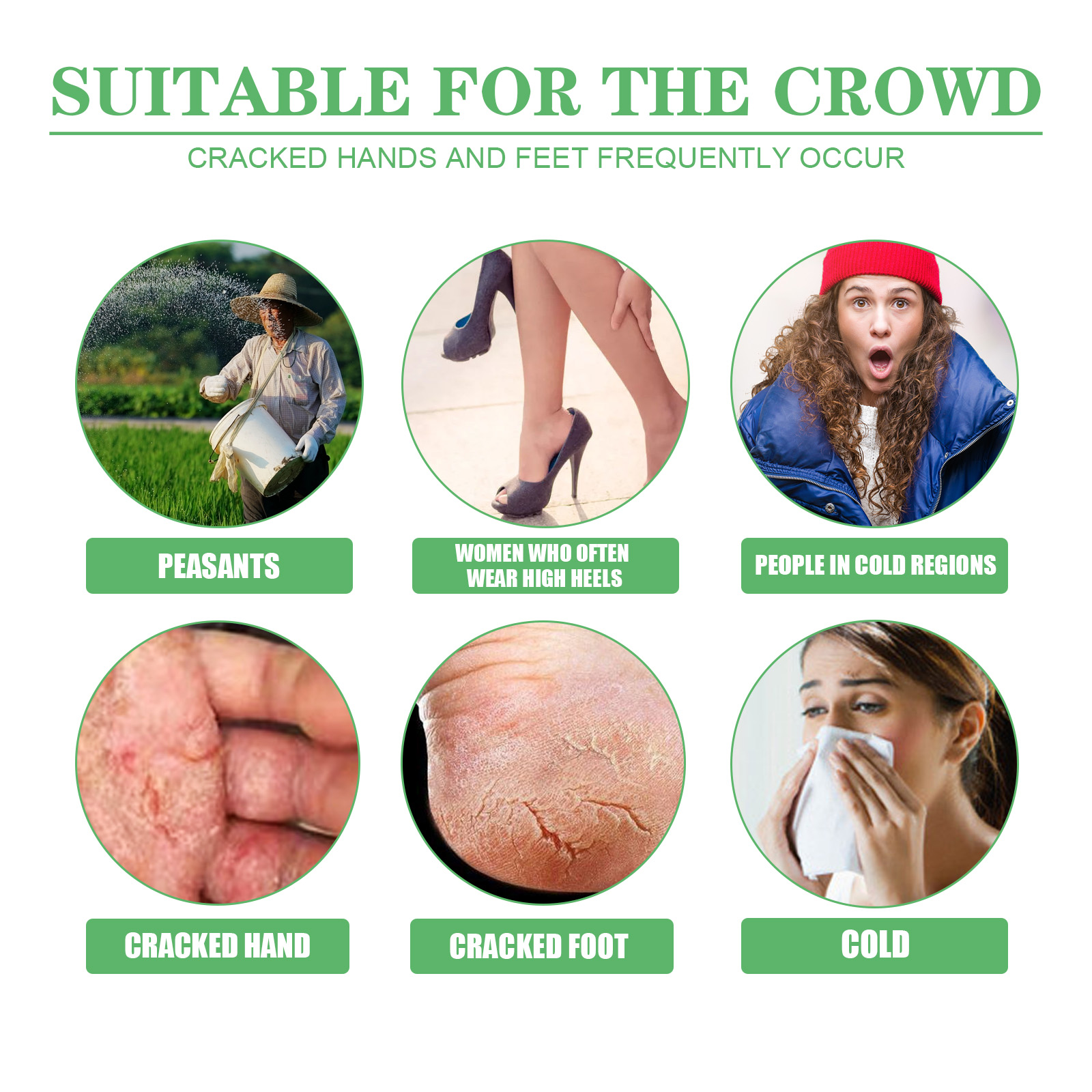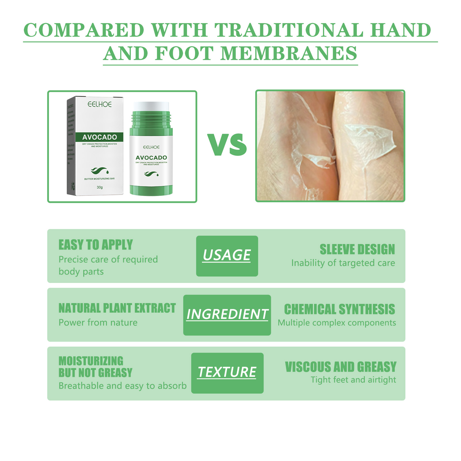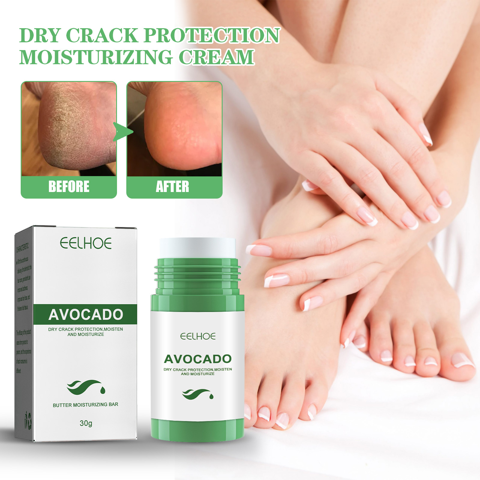 Our anti-cracking balm contains avocado, synthetic wax, and microcrystalline wax. It can deeply nourish and moisturize, repair damaged barriers, and reduce water loss. Its use method is very simple: 1. Crack the hands/feet; 2. Apply appropriate amount to palm/foot massage alternately. 3. Finger cross massage, make it fully absorbed, and adhere to use, restore smooth skin. Dry and Crack Protective Moisturizing Cream prevents cracking and moisturizes hands and feet.