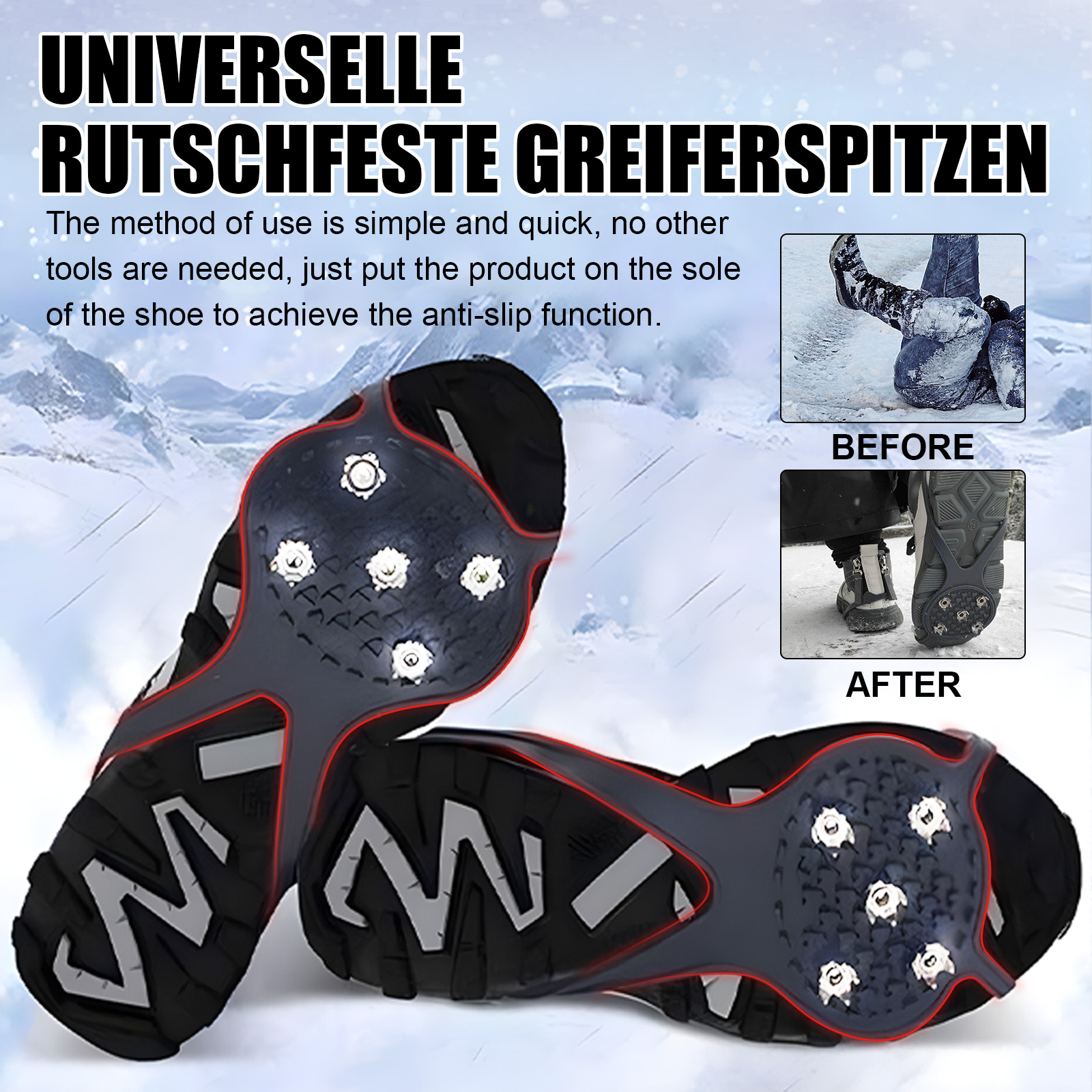 Our Universelle Rutschfeste Greiferspitzen contain rubber. It can be used with a variety of sports shoes, hiking shoes and alpine boots. Suitable for mountaineering, hiking and other sports, suitable for ice, grass and other environments. Its use is simple: simply turn the cleats out, tie the front end of the crampons to the tip of the shoe, the back end to the heel, and adjust accordingly. Can firmly grasp the ground, not easy to slip.