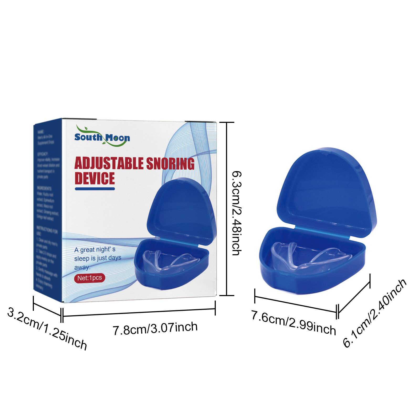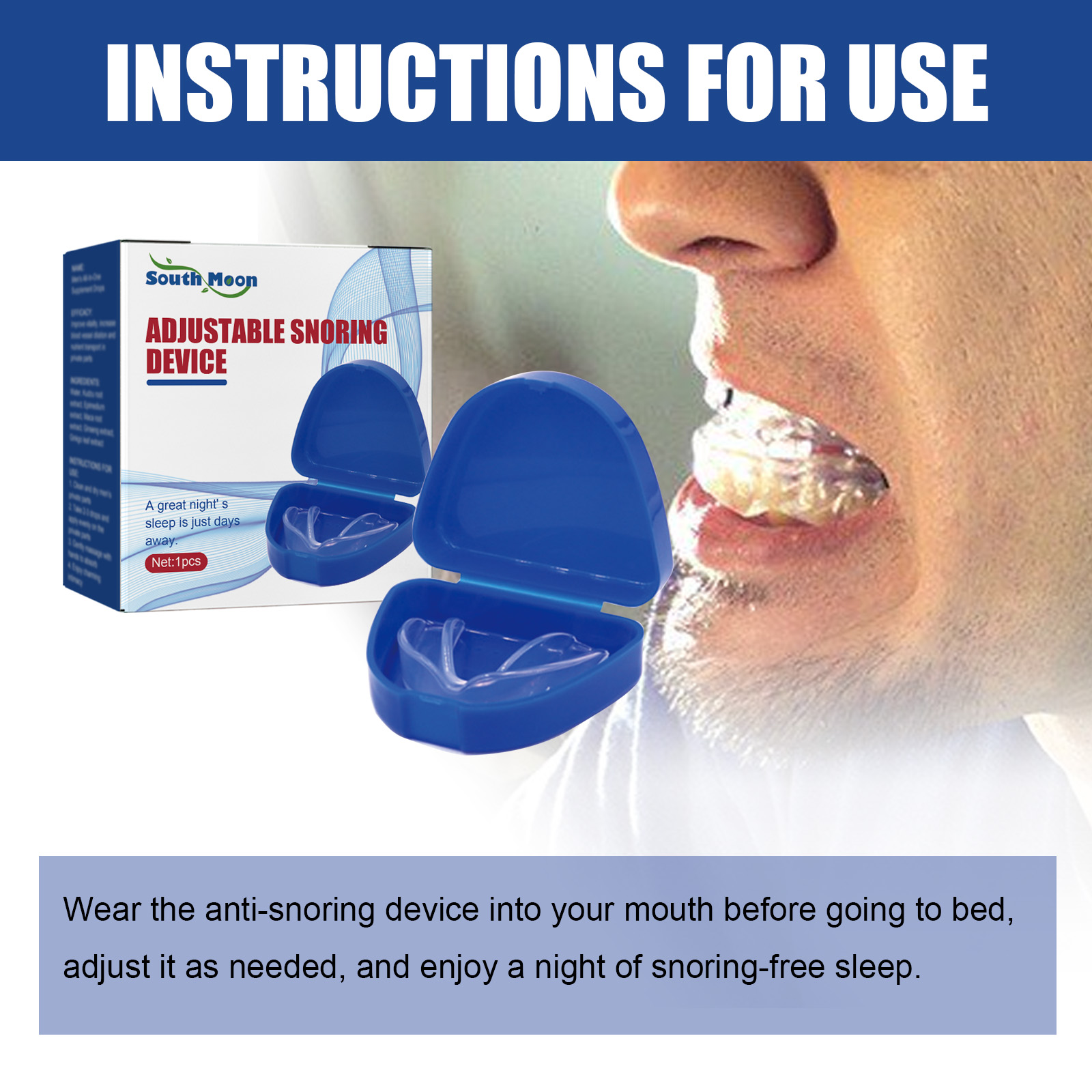 Our Adjustable Snoring Deviceg devices contain resin and silicone. It can help you develop a healthy habit of breathing through your nose, relieve dry mouth, and reduce snoring and sleep talking. The way to use it is very simple: before going to bed, put the anti-snoring device in your mouth and adjust it according to your personal needs. It can effectively reduce snoring and sleep talking, thereby improving sleep quality and making breathing easier.