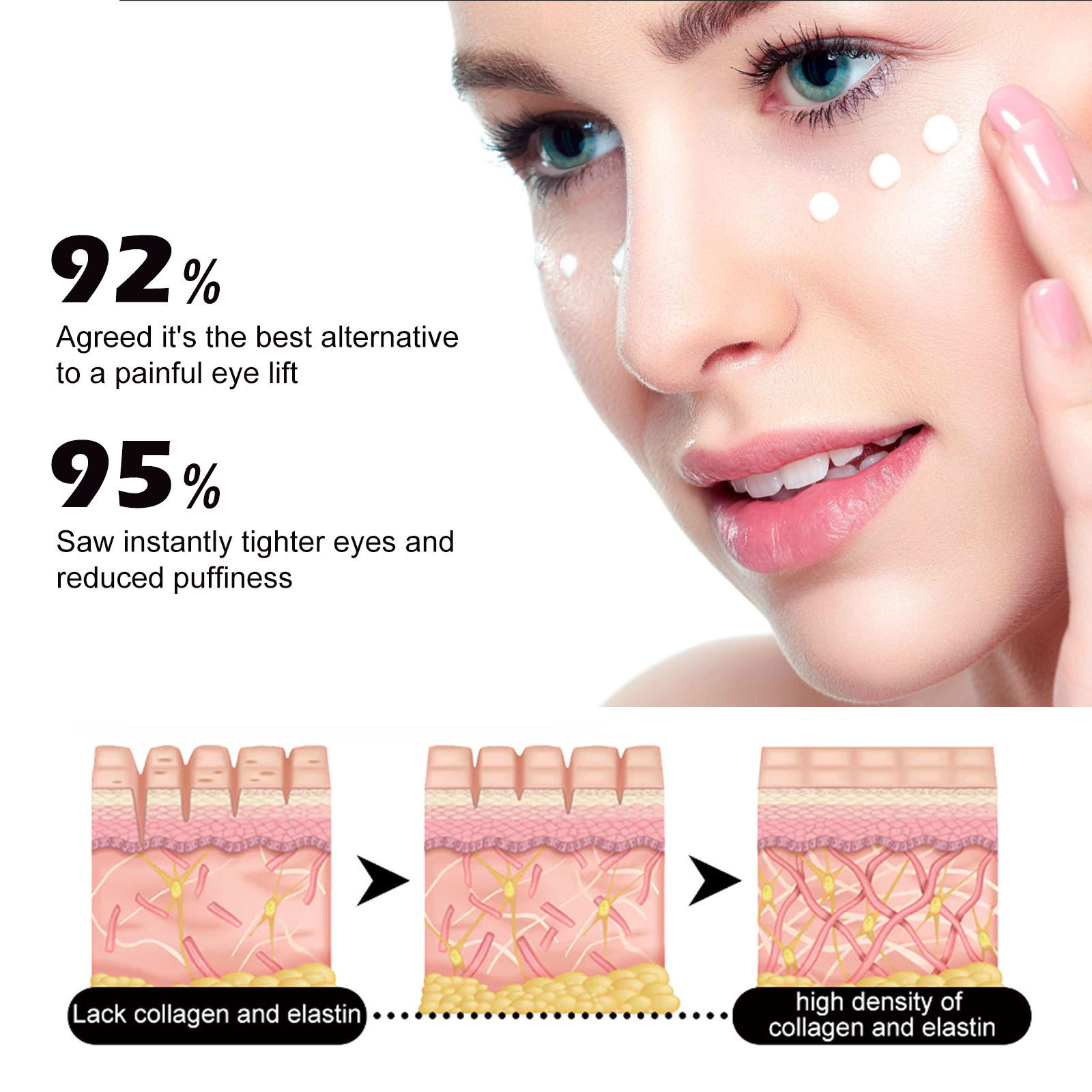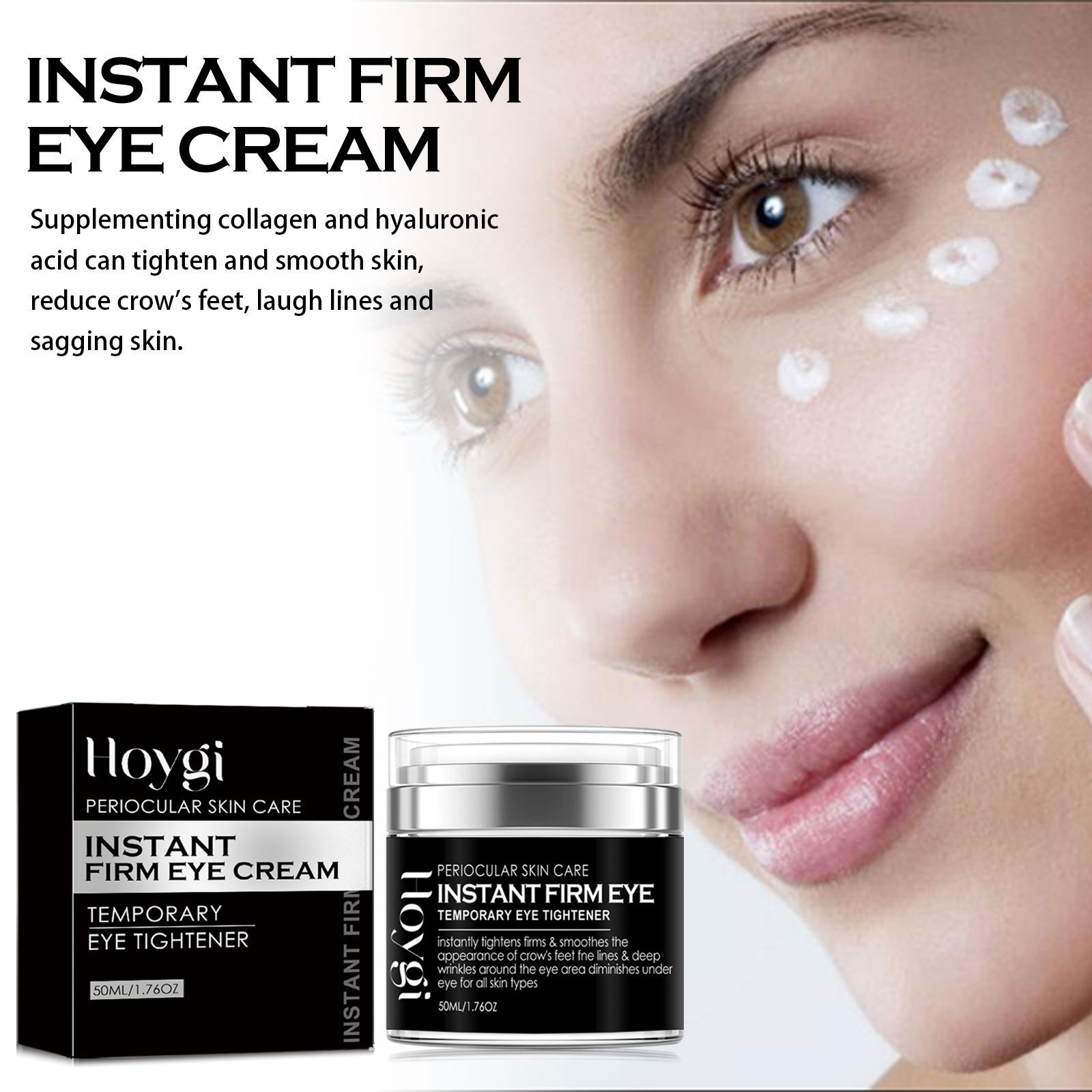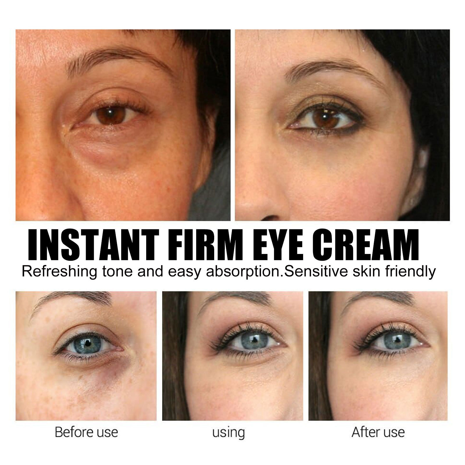 Our Instant Firm Eye Cream contains collagen, hyaluronic acid and vitamin E. It tightens and smoothes the skin, reduces crow's feet, laugh lines and sagging, reduces water loss, and replenishes collagen around the eyes, thereby reducing fine lines and leaving skin glowing. Its application method is very simple: clean the face, take a proper amount of eye cream evenly apply to the skin around the eyes, gently massage until completely absorbed. After use, it can quickly remove the bags under the eyes, tighten the delicate skin around the eyes, smooth the crow's feet, fade the dark circles, puffiness, fine lines, and make your eyes more beautiful.
