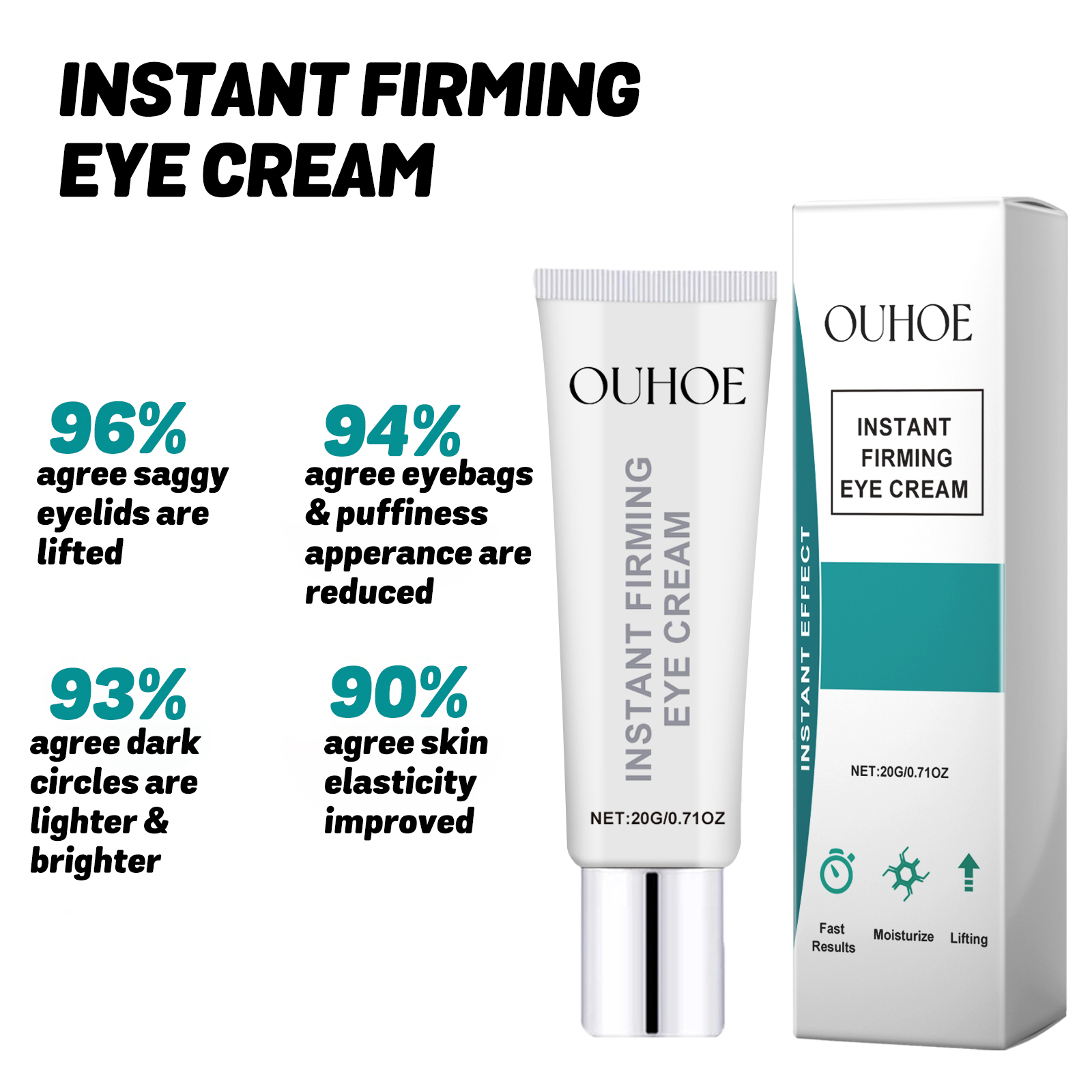Our Instant Firming Eye Cream contains Niacinamide, Hyaluronic Acid, Tocopherol. It can tighten the loose skin around the eyes, reduce wrinkles and fine lines, make your eyes look firm and young, replenish the moisture around the eyes, and make the skin around the eyes more hydrated and soft. Its use method is very simple: after cleansing and toning, take appropriate amount of this product evenly apply to the skin around the eyes, gently massage with fingertips to completely absorb it. This product is lightweight and easily absorbed by the skin, keeping your eye skin fresh, gentle ingredients, suitable for all skin types.
