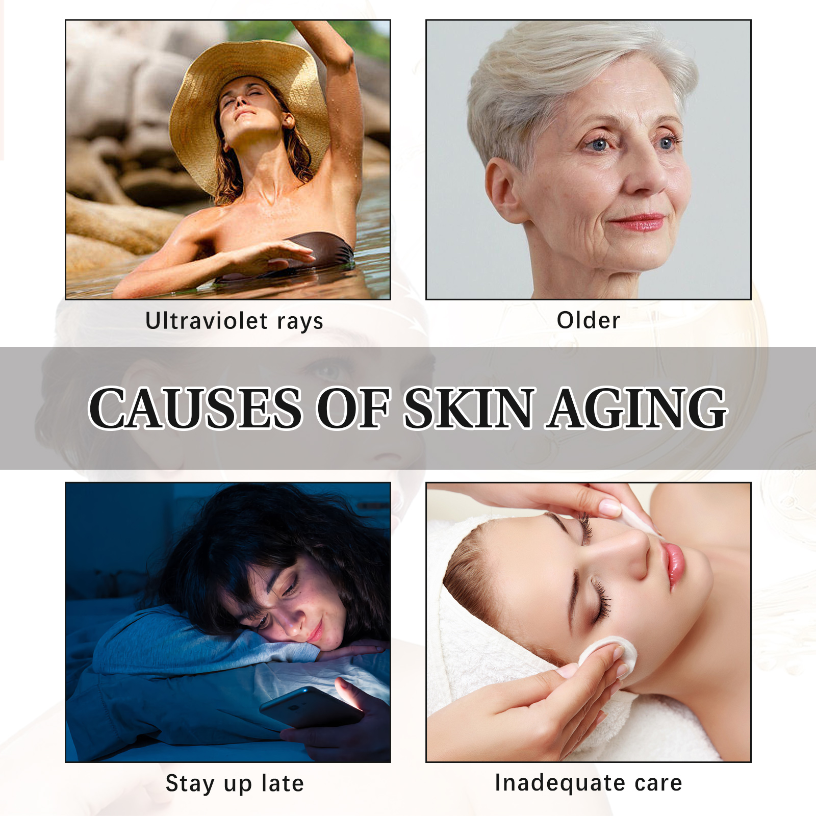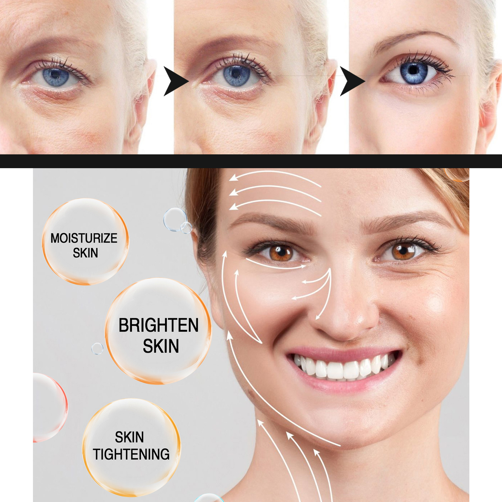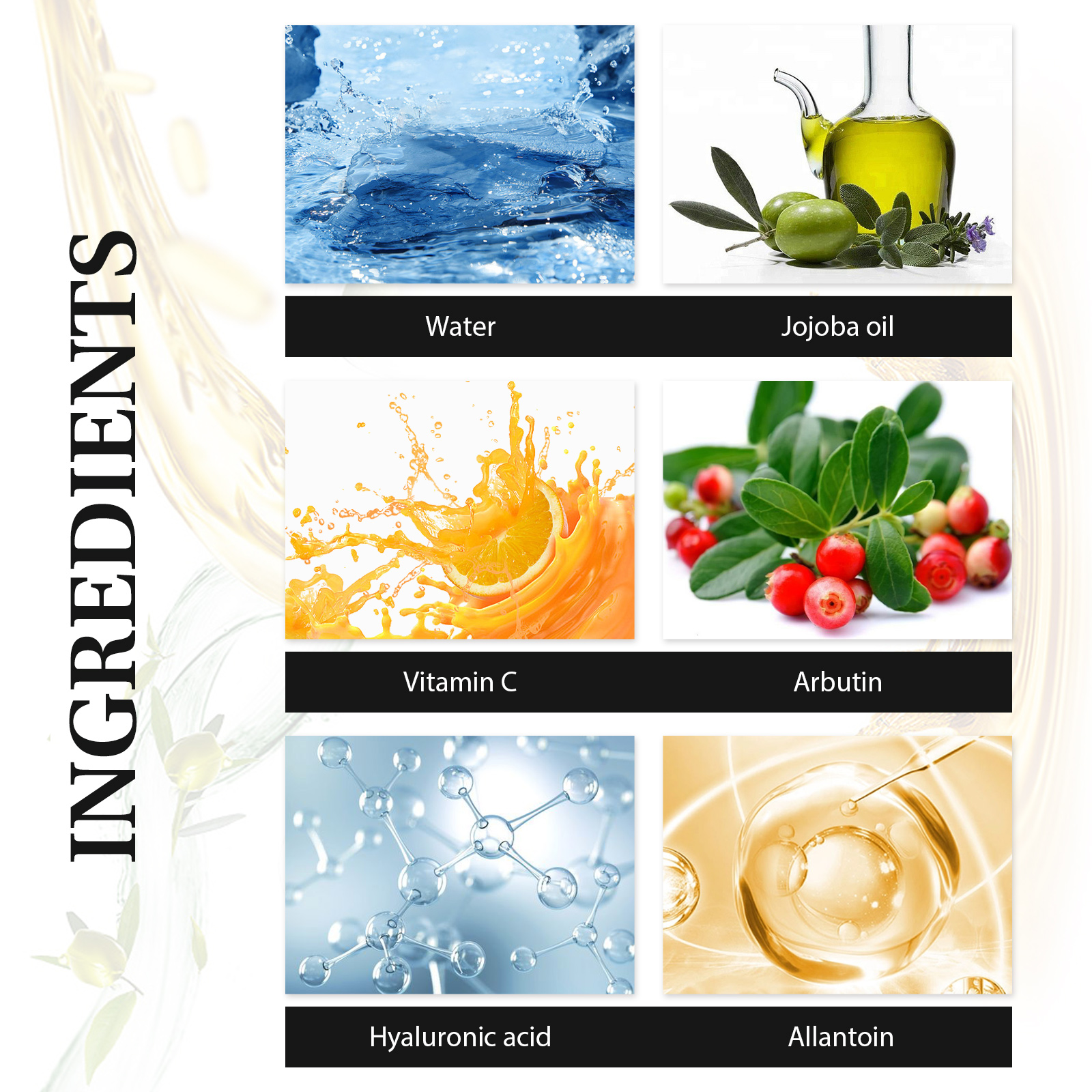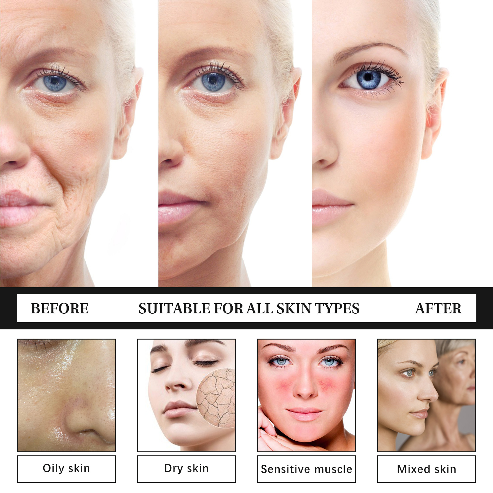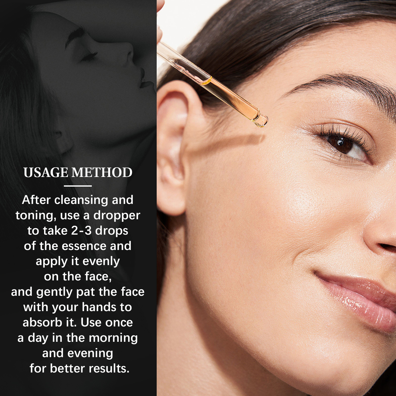 Our anti wrinkle essence contains water, jojoba oil, vitamin C. It can reduce wrinkles, reduce the invasion of foreign substances on the skin, reduce redness, dryness and other conditions. Its use method is very simple: After cleansing and toning, use a dropper to take 2-3 drops of the essence and apply it evenly on the face, and gently pat the face with your hands to absorb it. Moisturize the skin, brighten the complexion, maintain facial firmness and hydration, and brighten dull skin.