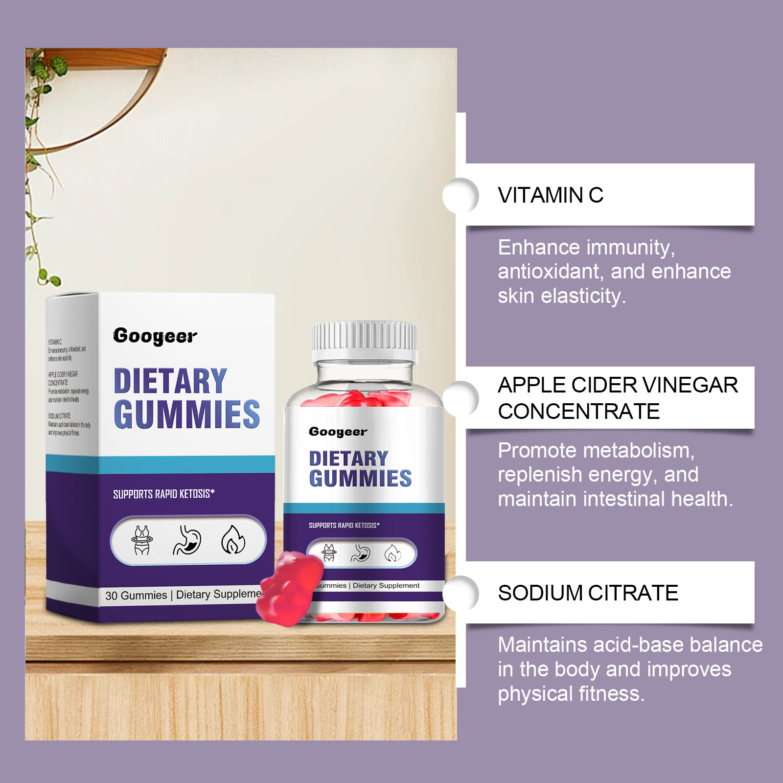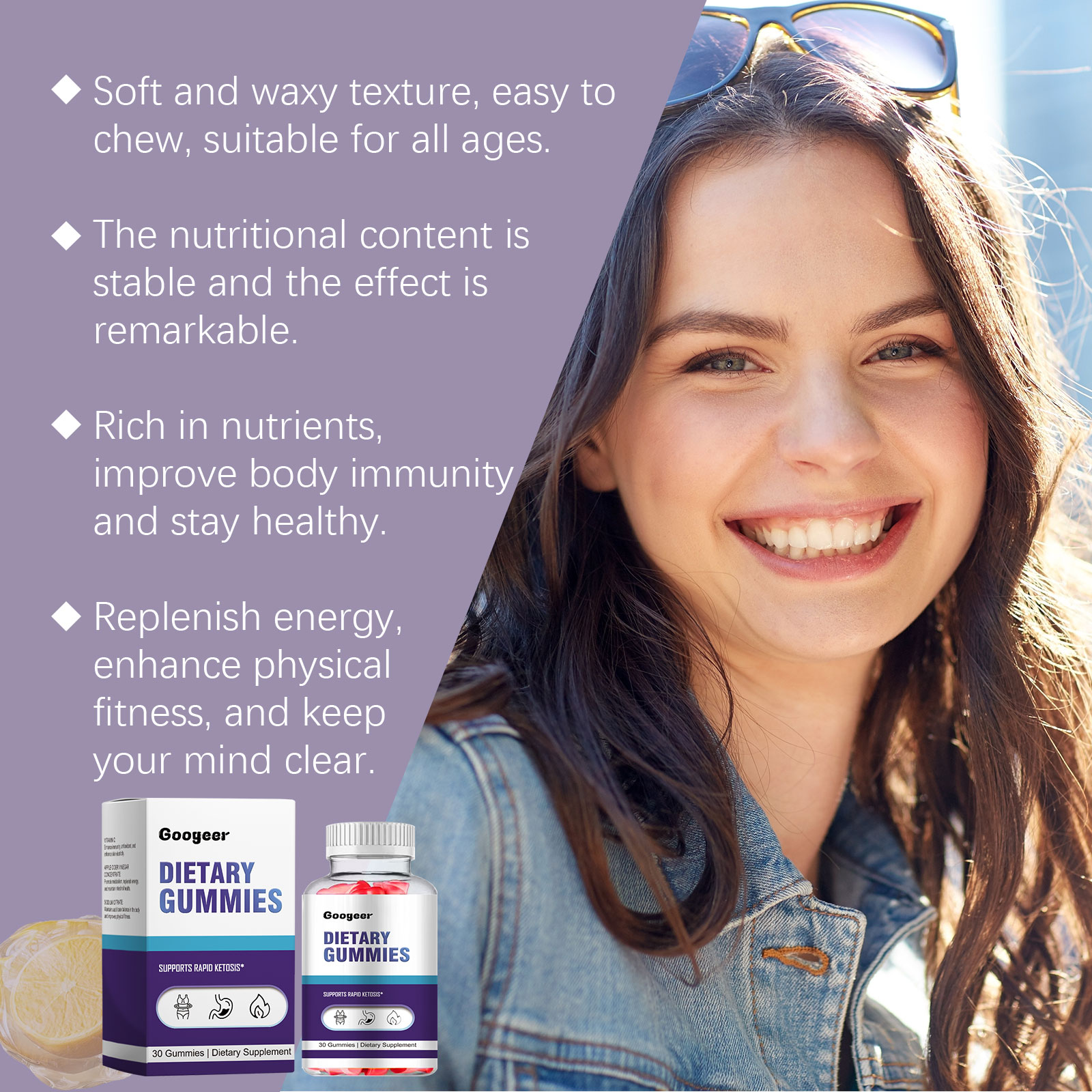 Our Dietary Gummies contains Maltose Syrup, White Sugar Powder, Apple Cider Vinegar Concentrate. It can improve the body's immunity, maintain health, replenish energy, enhance physical fitness, keep a clear mind, easy to consume and replenish energy anytime and anywhere. Its use is very simple: 2 times a day, 1 to 2 capsules each time. It can boost metabolism, reduce appetite and prevent overeating.