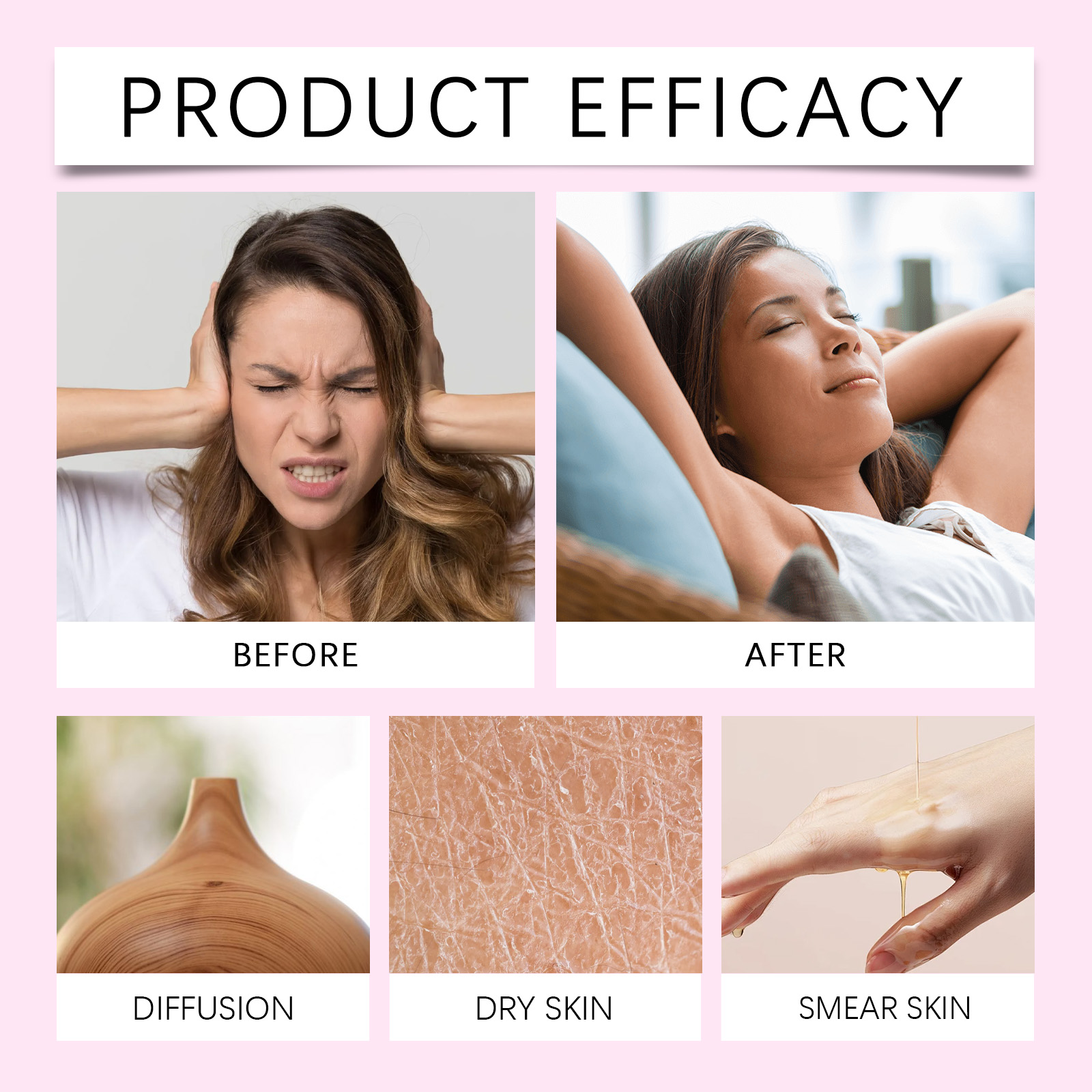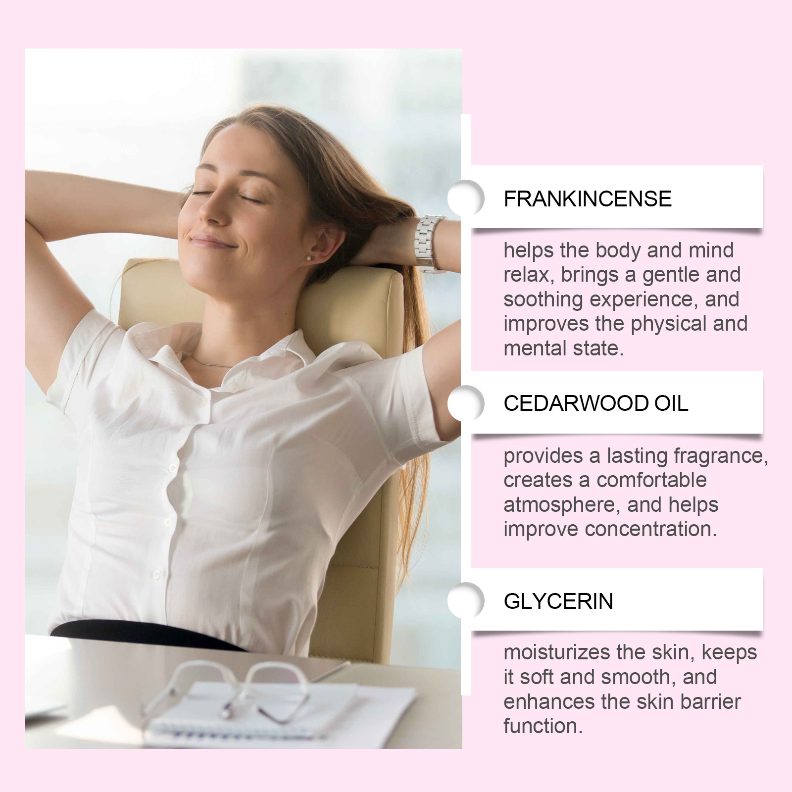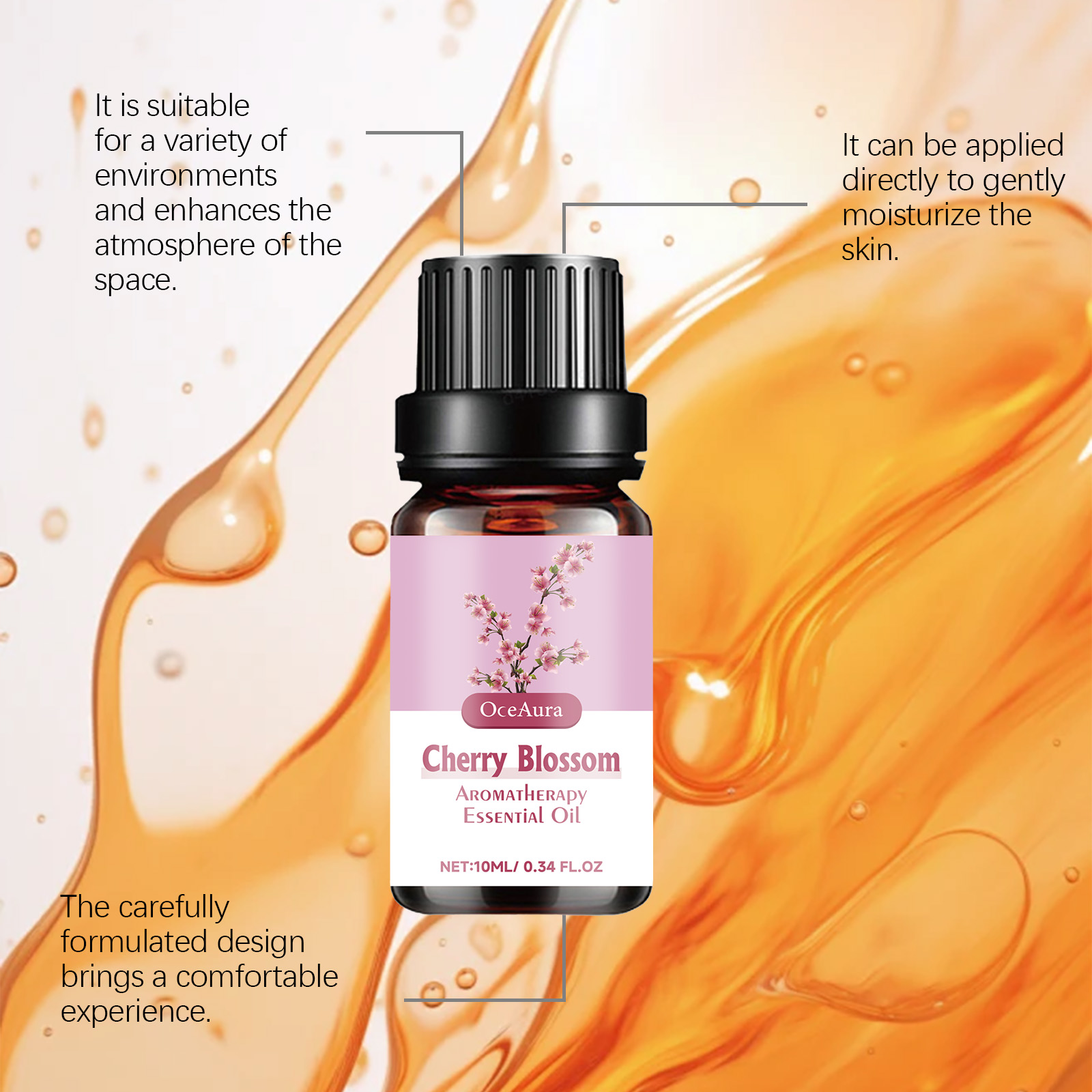 Our massage oils contain cherry blossom extract and North African cedar bark oil. It can help the body and mind relax, bring a gentle and soothing experience, and improve the physical and mental state. Provides a long-lasting fragrance. Creates a comfortable atmosphere and helps to improve concentration. Its use method is very simple: 1. Aromatherapy: open the bottle cap, take the appropriate amount of this product into the diffuser. 2. Body use: After cleansing, apply appropriate amount of the product evenly on the body skin, gently massage around the skin to promote absorption. Helps relieve stress and improve emotional calm through wood aromas. Suitable for office, conference room, study room and other occasions.