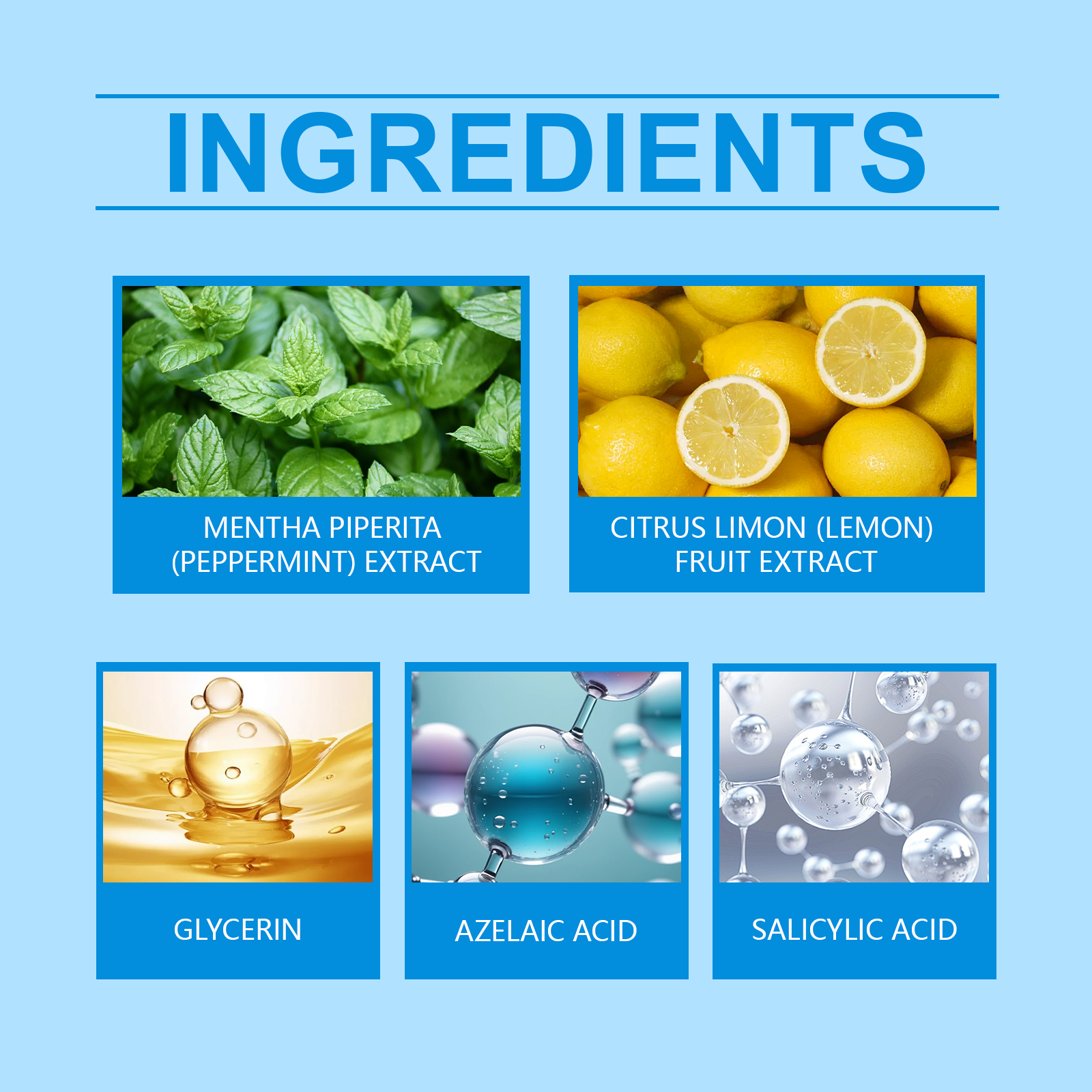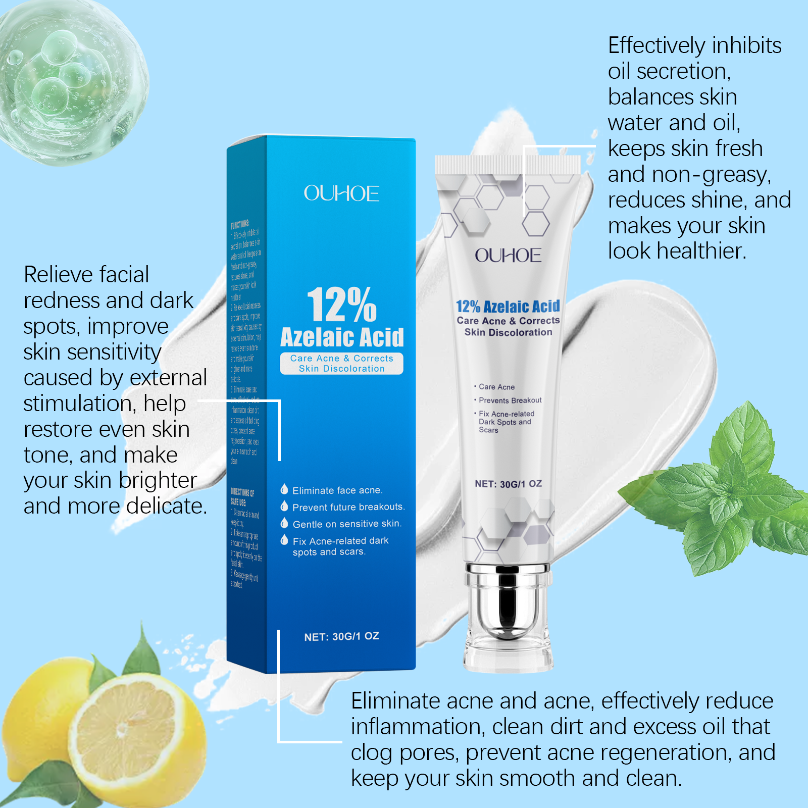Our azelaic acid cream contains lemon extract and salicylic acid. It reduces excess oil production to keep skin fresh and prevent clogged pores. Its application method is very simple: clean facial skin, keep skin dry, apply appropriate amount of this product evenly on facial skin, gently massage until absorbed. It can also reduce oil production, antibacterial and anti-inflammatory, and prevent acne.