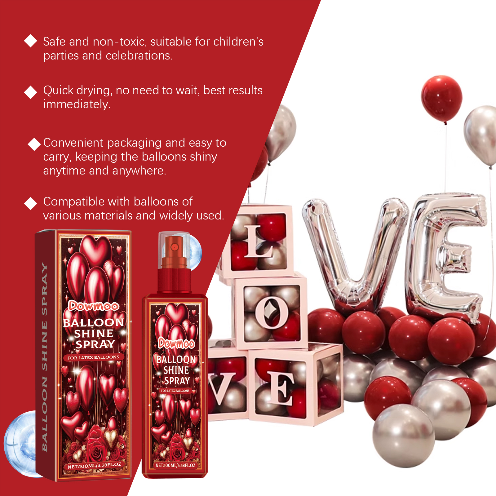 Our balloon gloss spray contains isopropyl alcohol, polyvinyl alcohol. It can effectively prevent oxidation and extend the service life of the balloon. Its use is simple: spray the product evenly on the surface of the balloon. And can be sprayed after the visual effect is very good. The surface of the balloon is smooth and bright, and raised.