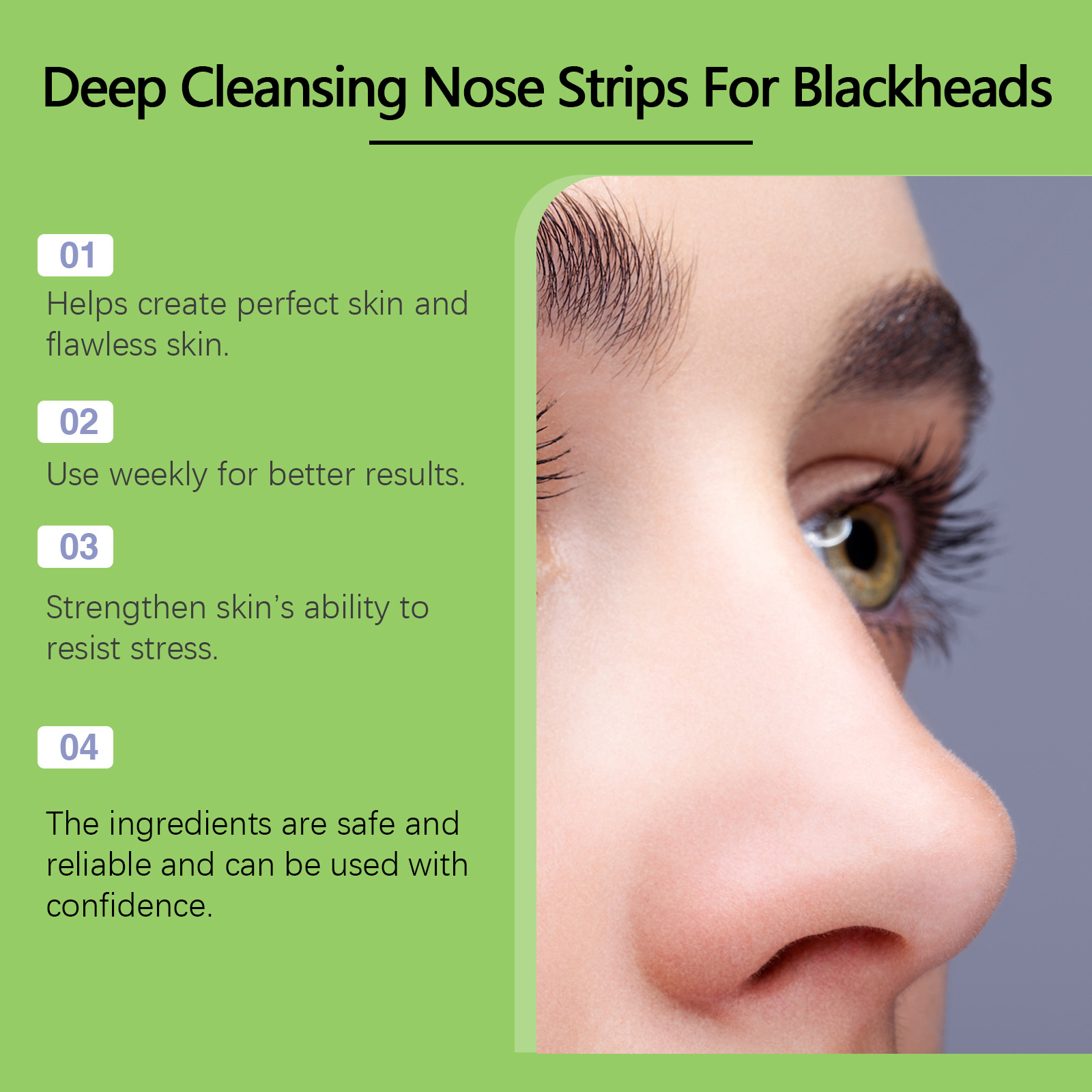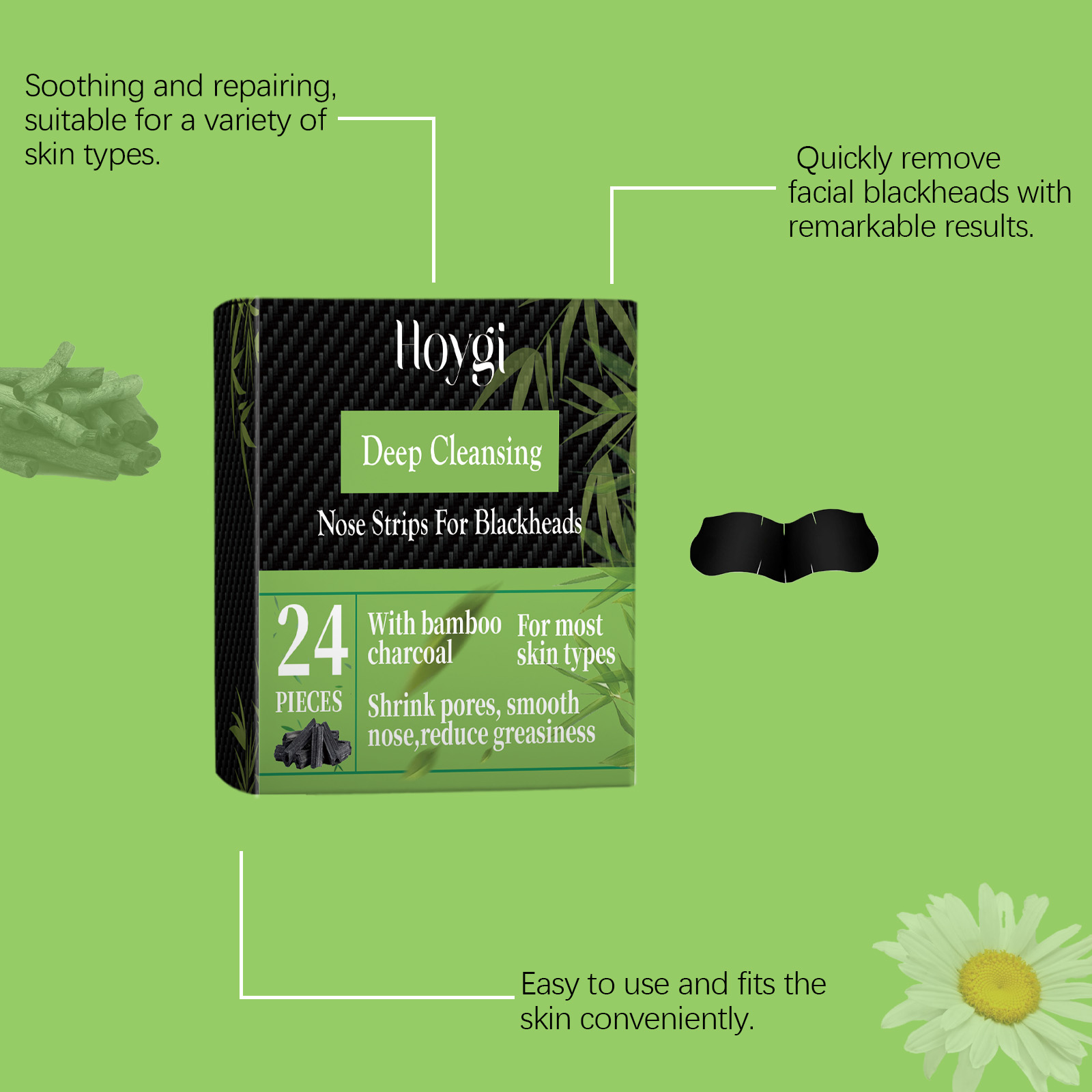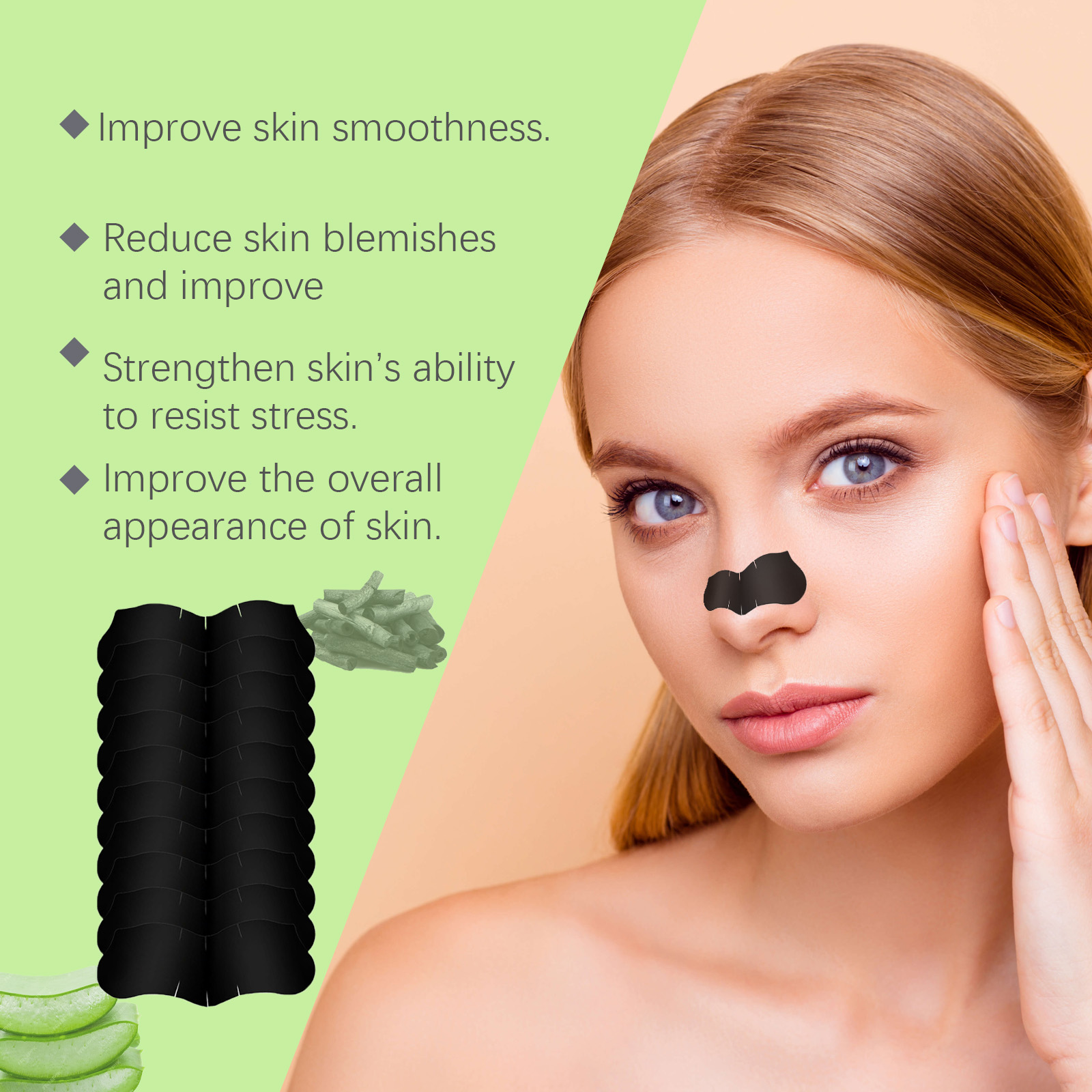 Our bamboo charcoal blackhead patch contains glycerin and mother chrysanthemum extract. It moisturizes for a long time and helps the skin retain moisture. The way to use it is simple: clean your face and keep your nose slightly moist. Take a bamboo charcoal blackhead removal patch, remove the adhesive, stick it on your nose, wait 15-20 minutes, and it will remove blackheads, clean and close pores, it will even help balance oil and leave your skin fresh and smooth.