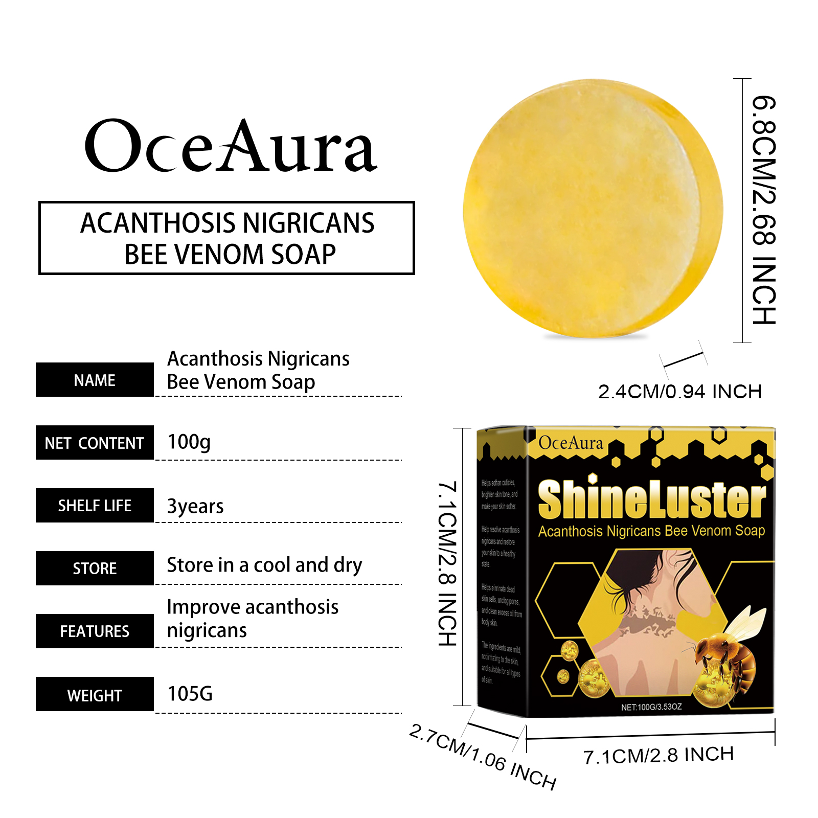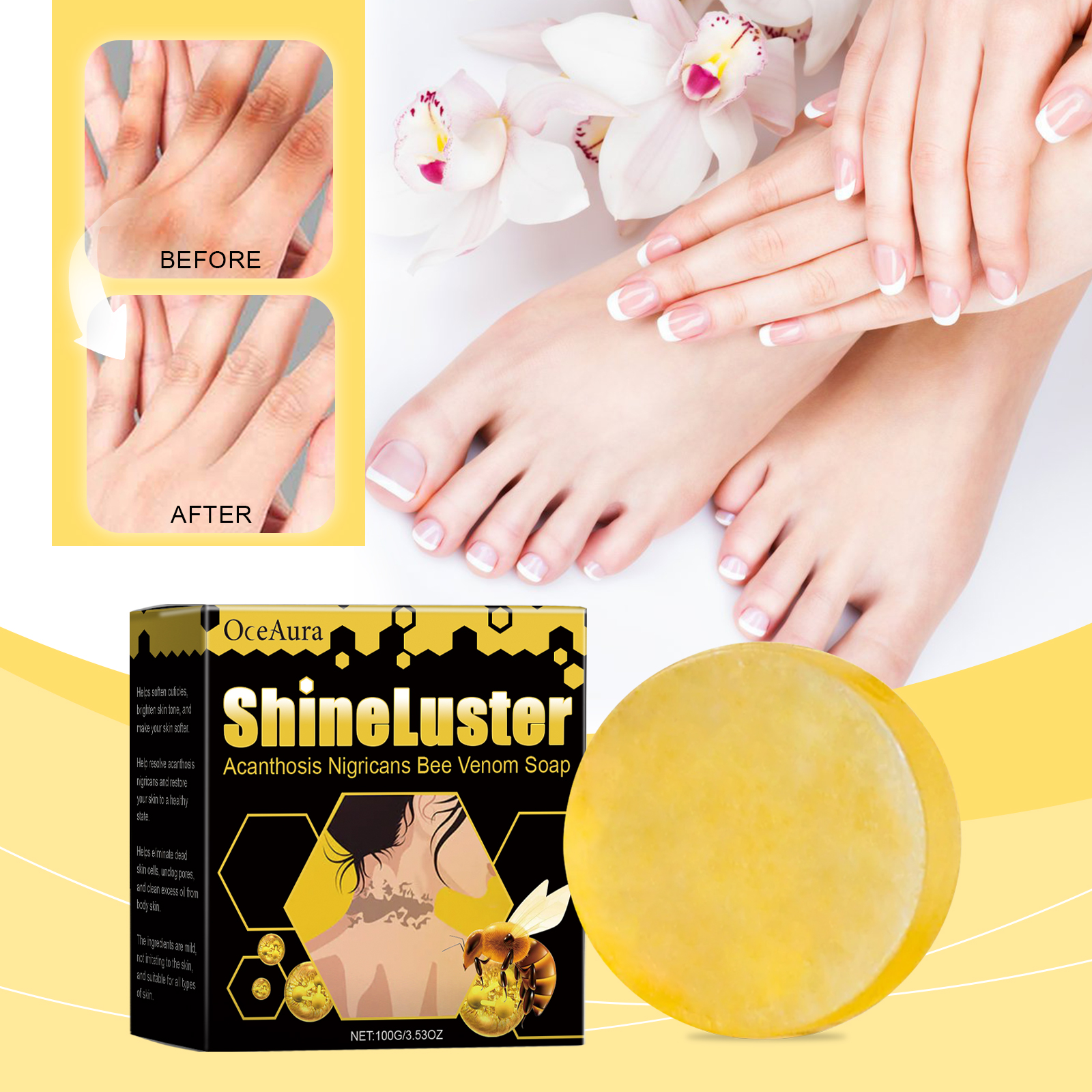 Our Acanthosis Nigricans Bee Venom Soap contains Bee Venom, Beeswax, Zingiber Officinale(Ginger) Root Extract. It deeply cleanses the skin, helps keep the skin healthy, moisturizes and forms a protective film, prevents water loss, brightens and improves skin texture, and is gentle and non-irritating. The way to use it is very simple: put the product in the palm of the hand to gently lather, apply the foam to the body skin, clean, and finally rinse off with warm water. It can help close pores, improve skin firmness and deep cleansing, while helping to keep skin healthy.