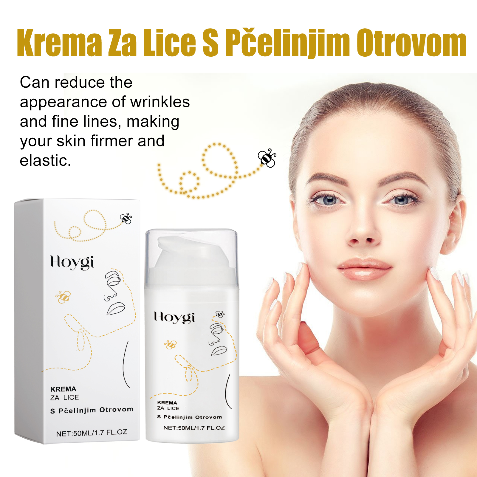 Our Krema Za Lice S Pčelinjim Otrovom contains Glycerin, Bee Venom, Sodium Hyaluronate. It reduces the appearance of wrinkles and fine lines, makes your skin firmer and more elastic, reduces visible signs of aging, and smooths out rough textures. Gives skin firmness and elasticity. Its application method is very simple: clean the face, evenly apply the cream to the face skin, gently massage until completely absorbed. It can deeply moisturize skin and make skin soft and smooth.