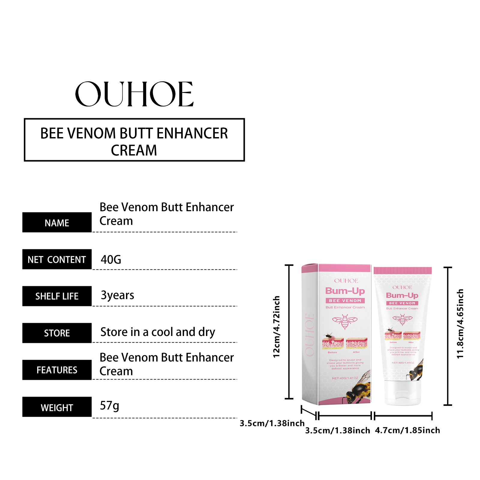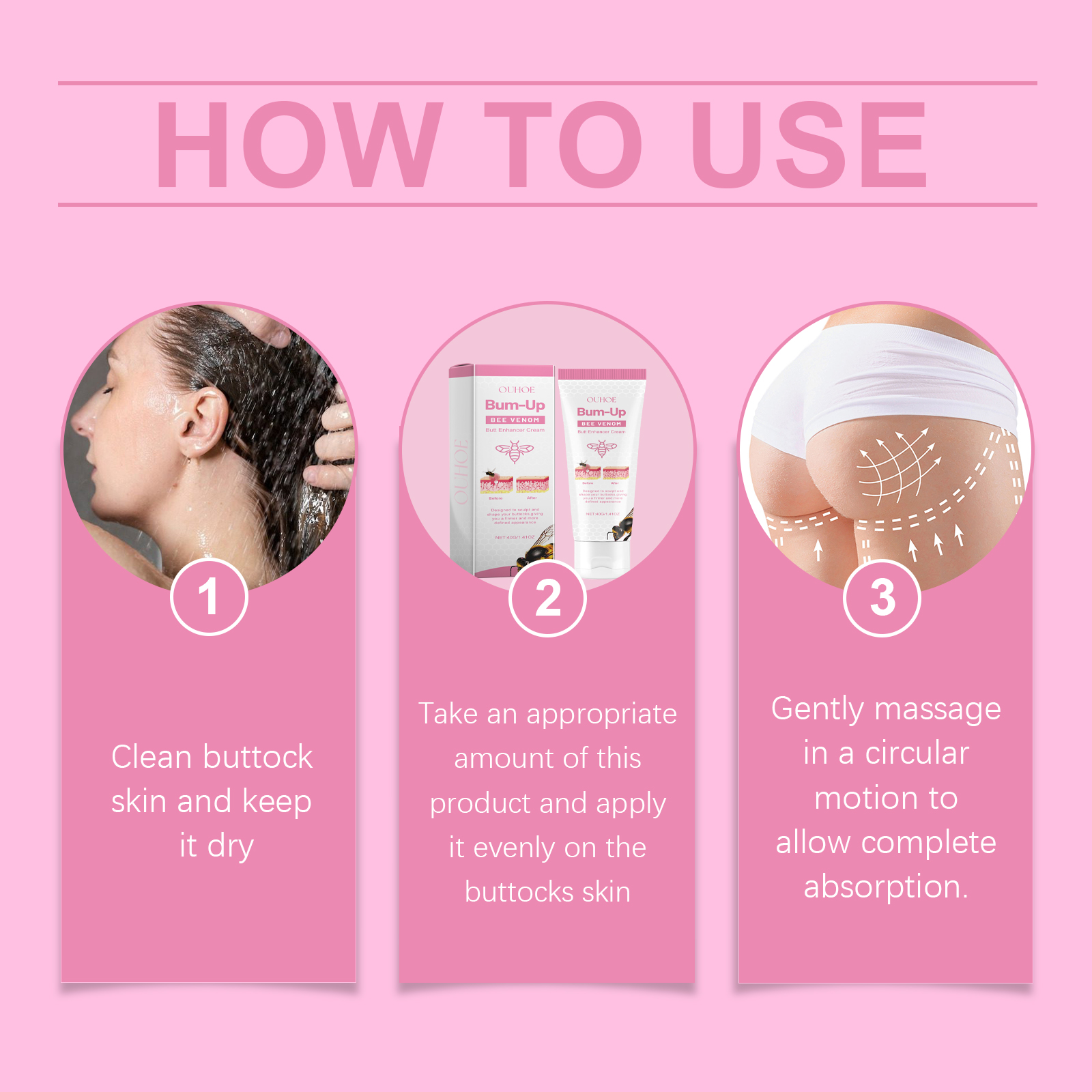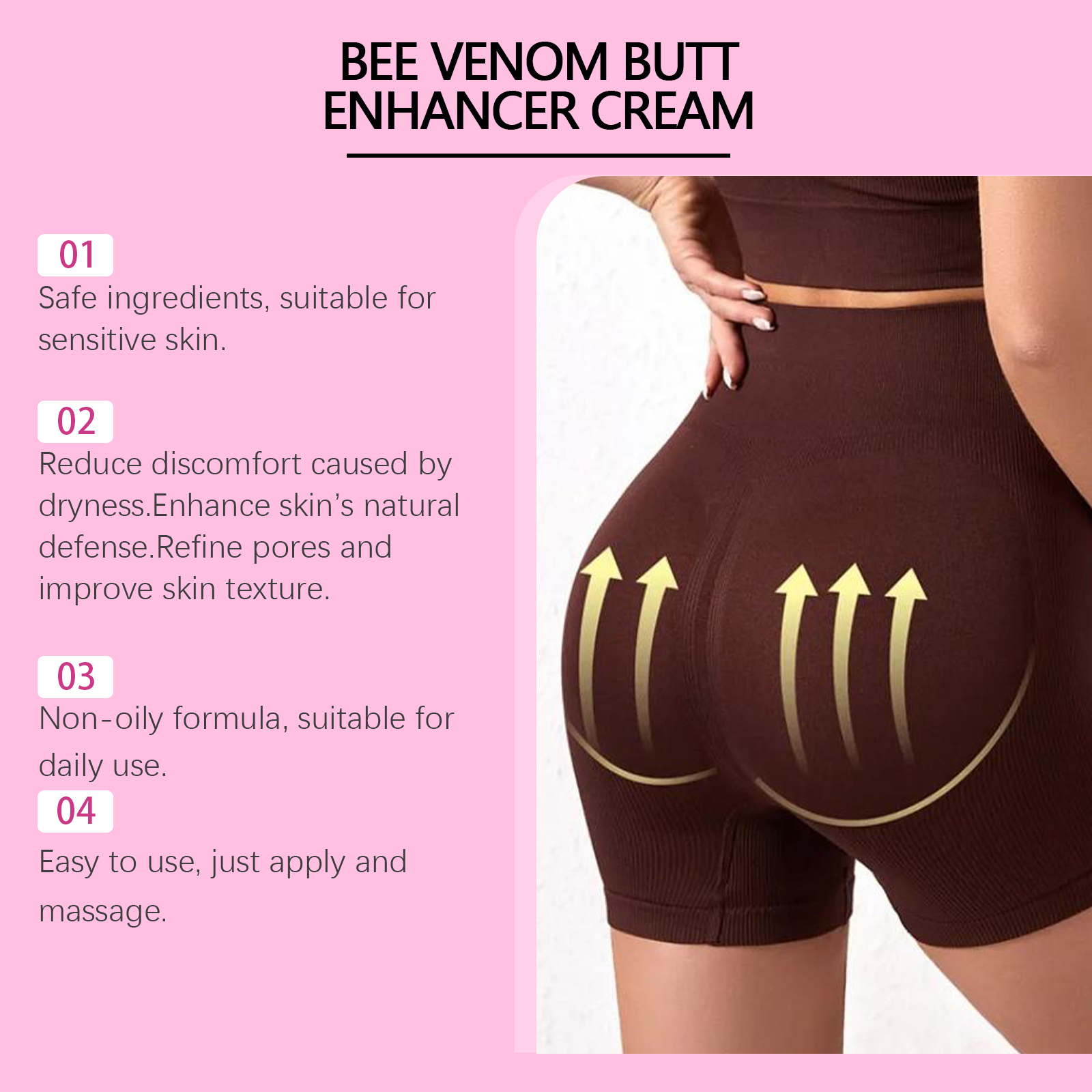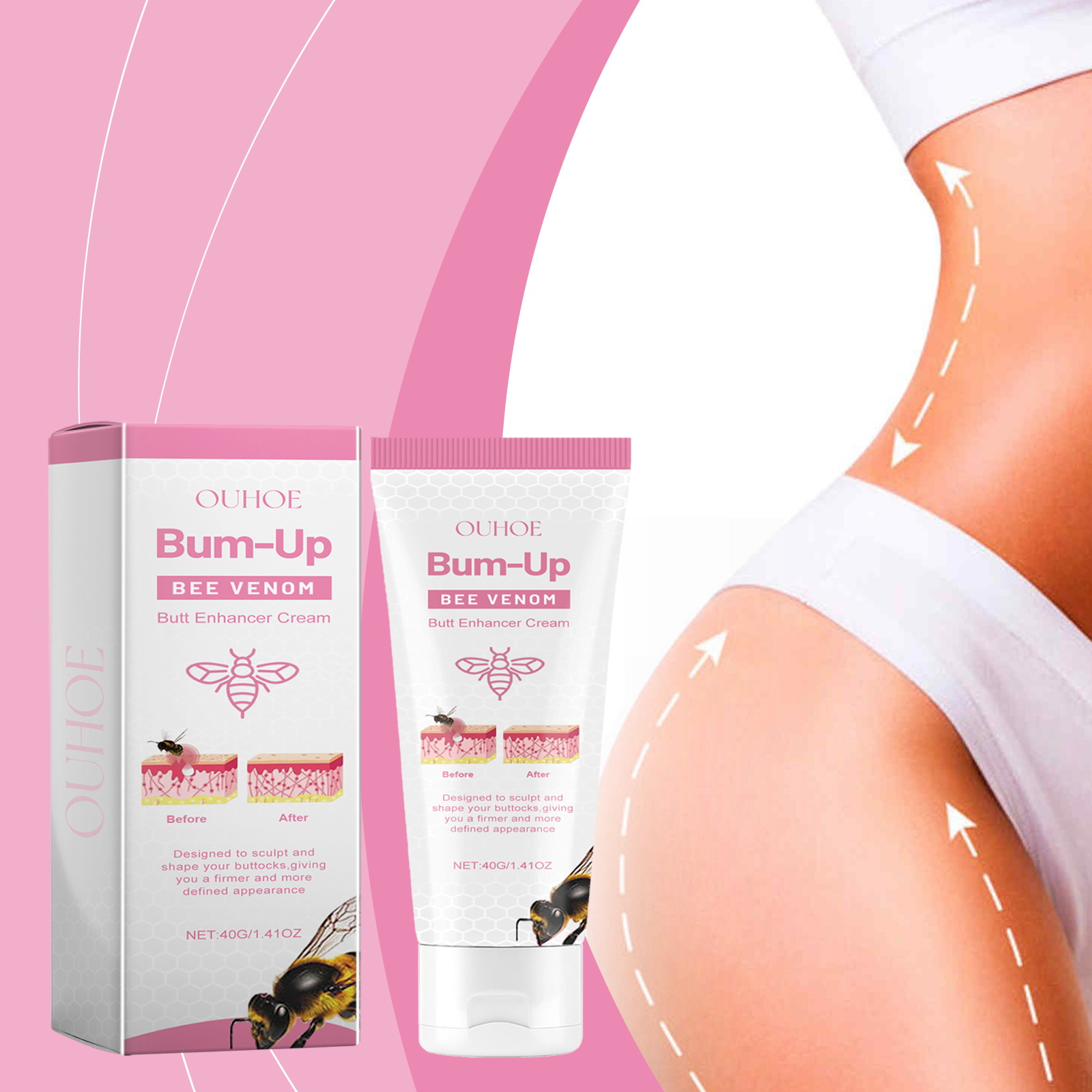 Our bee Venom butt firming cream contains bee venom, sodium hyaluronate, witch hazel extract. It can promote skin firmness and increase elasticity; Deep lock skin moisture, lasting moisture; Firming skin and thinning pores. Its application method is simple: 1. Clean the buttock skin and keep it dry; 2. Apply appropriate amount of this product evenly on buttock skin; 3. Gently massage in circular motions to allow the body to fully absorb. Bee venom butt firming cream improves skin firmness and smoothness. Provides moisture and moisture retention for buttocks.