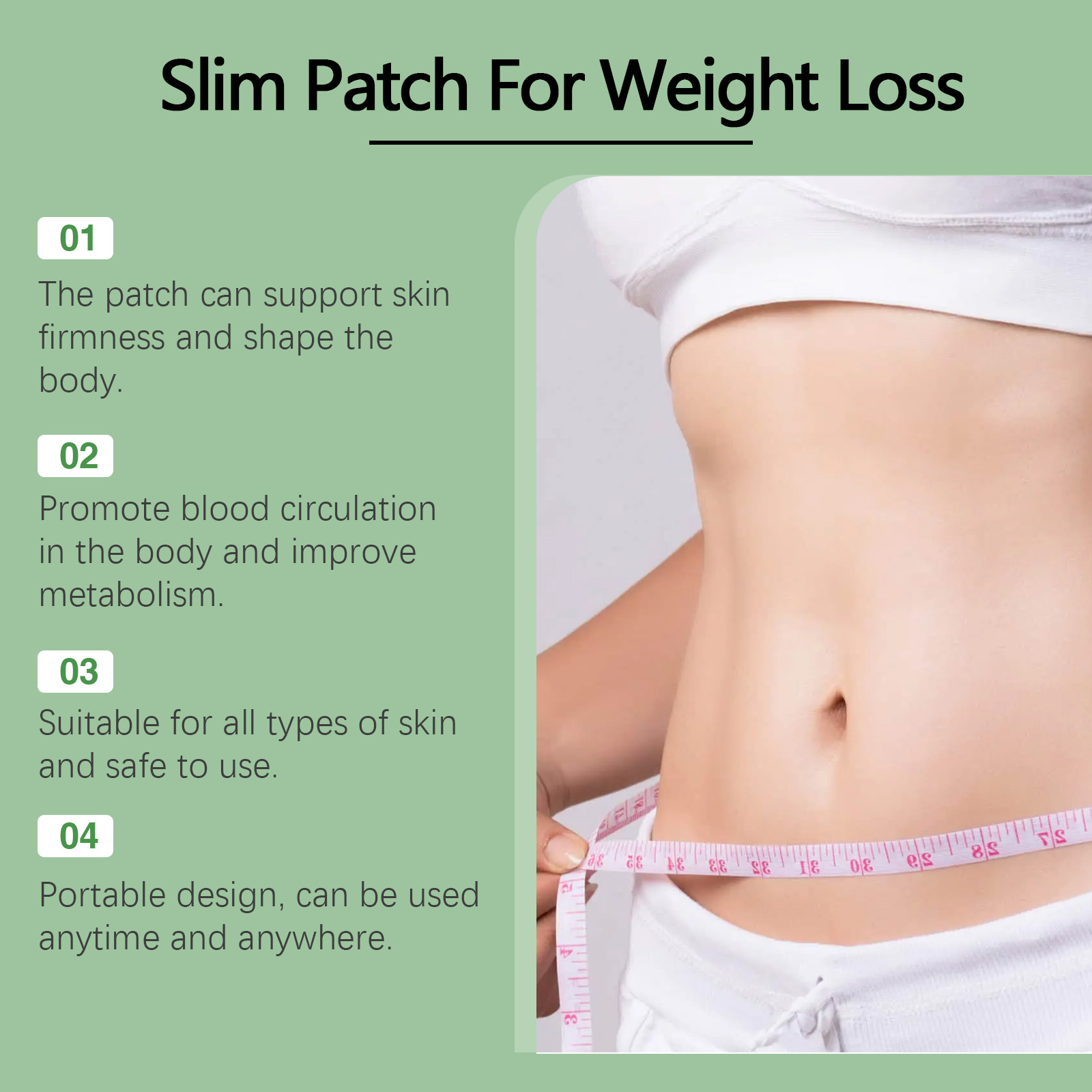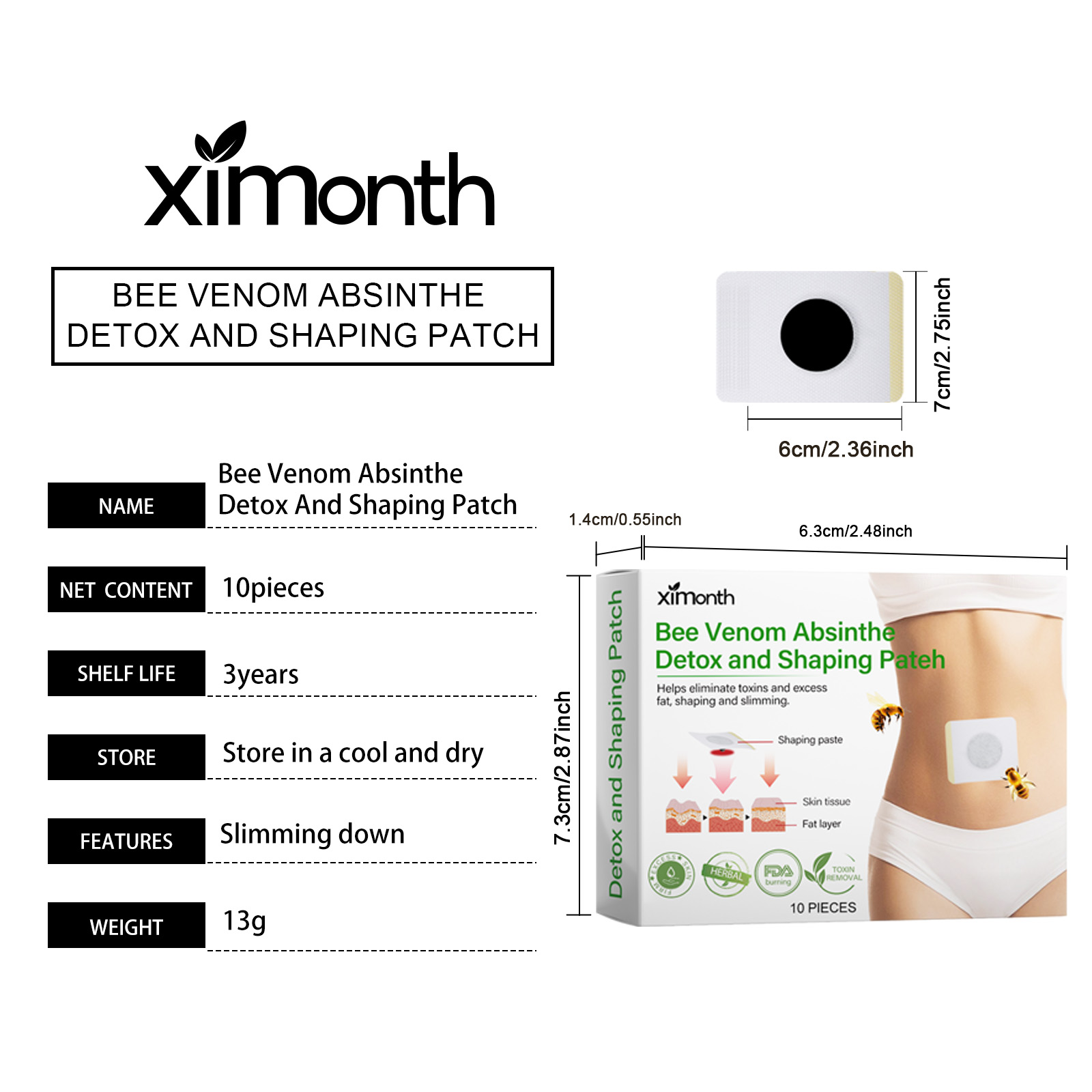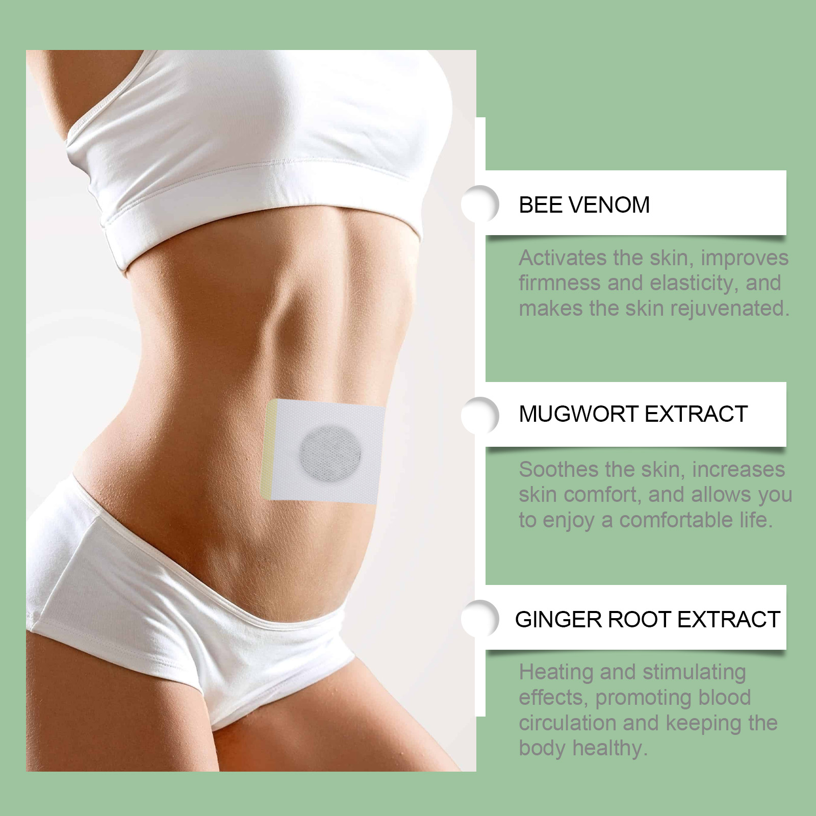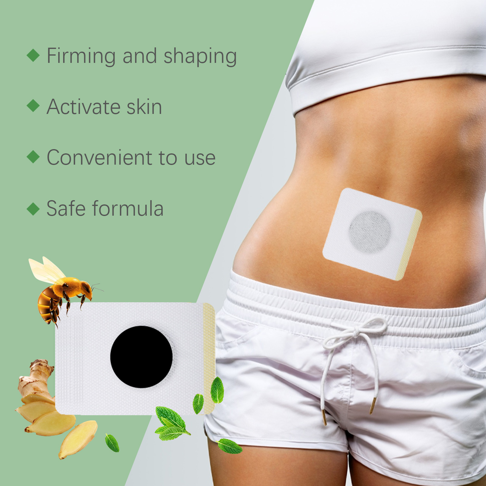 Our stickers contain bee venom, mugwort extract and ginger root extract. It can help you shape your ideal body shape and significantly improve your body shape. Promote skin blood circulation, enhance skin vitality, and show healthy luster. Its use method is simple: 1. Clean and dry the body skin; 2. Apply a patch to the skin, gently press the patch to ensure that the patch is attached to the body; 3. Wait 3-4 hours and then remove the patch. Bee Venom Shape Patches tighten the skin and shape the body. Promote blood circulation in the body and improve metabolism. Suitable for all kinds of skin, safe to use; Portable design for anytime, anywhere use. Easy to use, no extra time required, perfect for busy lives. Experience the cool feeling and feel comfortable after use.