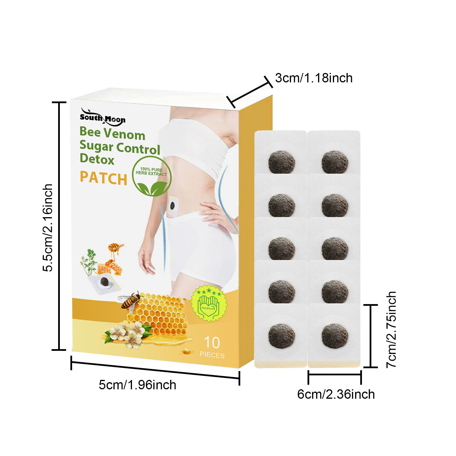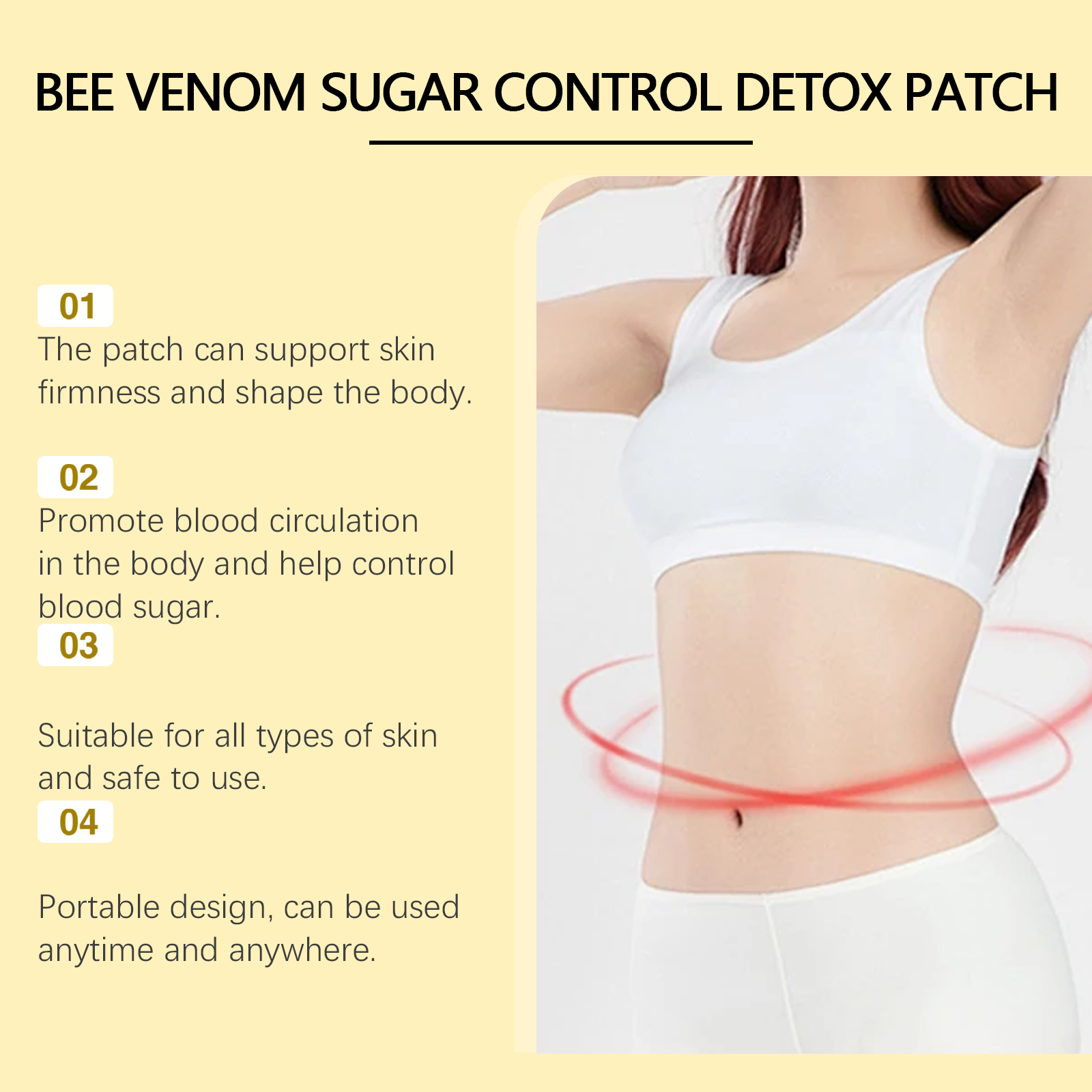 Our bee Venom Body shaping patch contains ginseng root extract and mulberry leaf extract. It can support skin firmness and shape the body. Its application is simple: clean dry body skin, take a patch and apply it to the abdomen, gently ensure that its weight is on the body, and wait 3-4 hours before removing the patch. It can also improve blood circulation in the body and help control blood sugar.