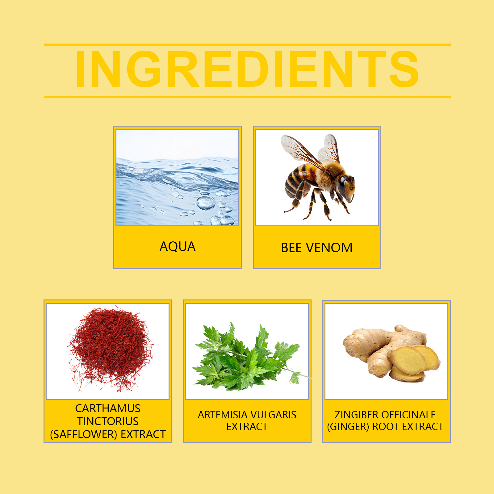 Our bee venom shaping spray contains wormwood extract and ginger extract. It can promote blood circulation and remove blood stasis. Boost metabolism and help with fat loss. Its application method is very simple: first clean dry skin, take an appropriate amount of this product evenly spray on the skin parts that need to be thinned. Massage gently until fully absorbed. And can promote fat burning, stimulate microcirculation, and help create a tight body shape.