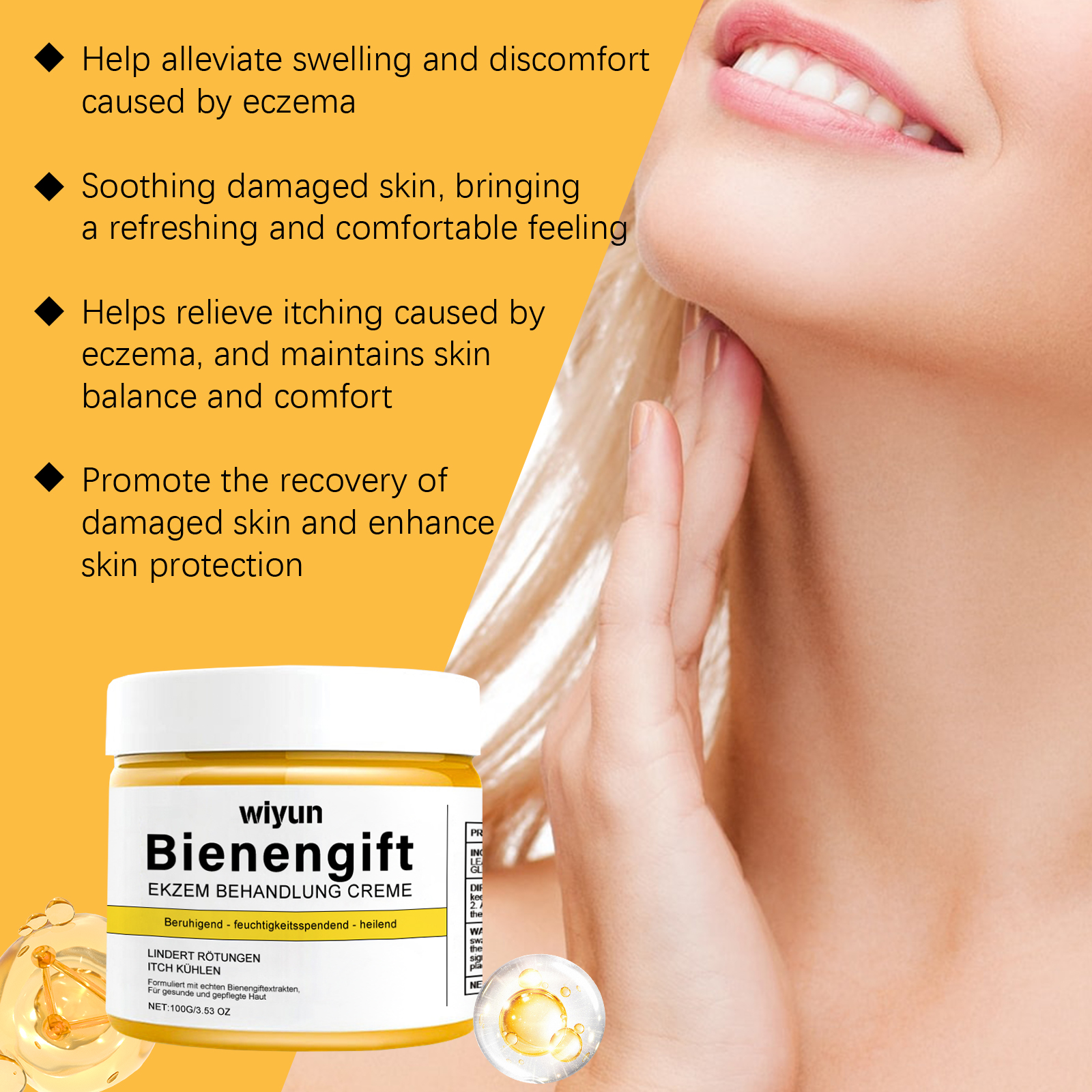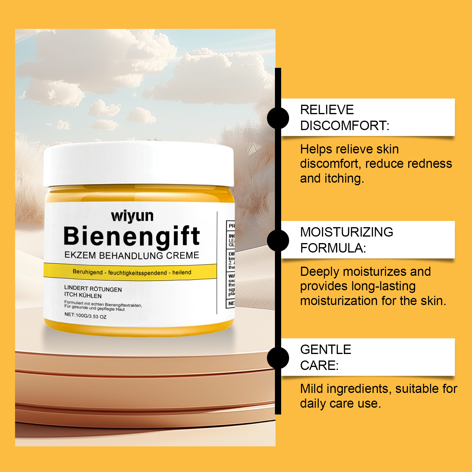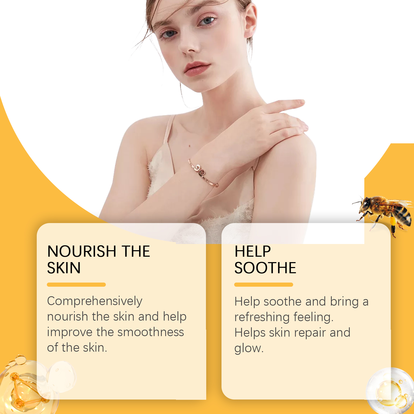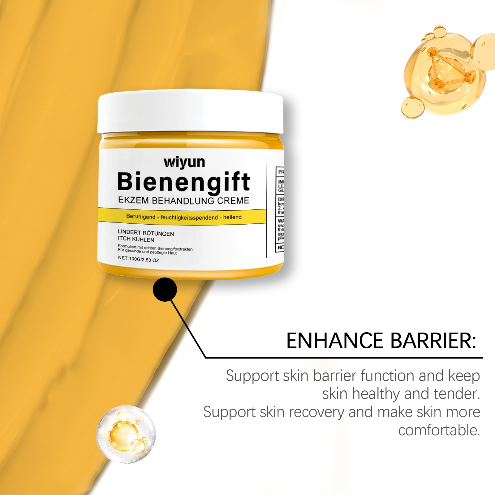 Our bee venom skin care cream contains bee venom and aloe vera leaf extract. It can fully nourish the skin and help improve skin smoothness. Helps soothe and gives a refreshing feeling. Helps skin repair and glow. The way to use it is simple: clean the skin and keep it dry. Apply appropriate amount of this product evenly to the affected skin area and wait for absorption. And can be designed for sensitive skin, comfortable and safe, suitable for the whole family. Restores soft touch to skin, feeling fresh and healthy.