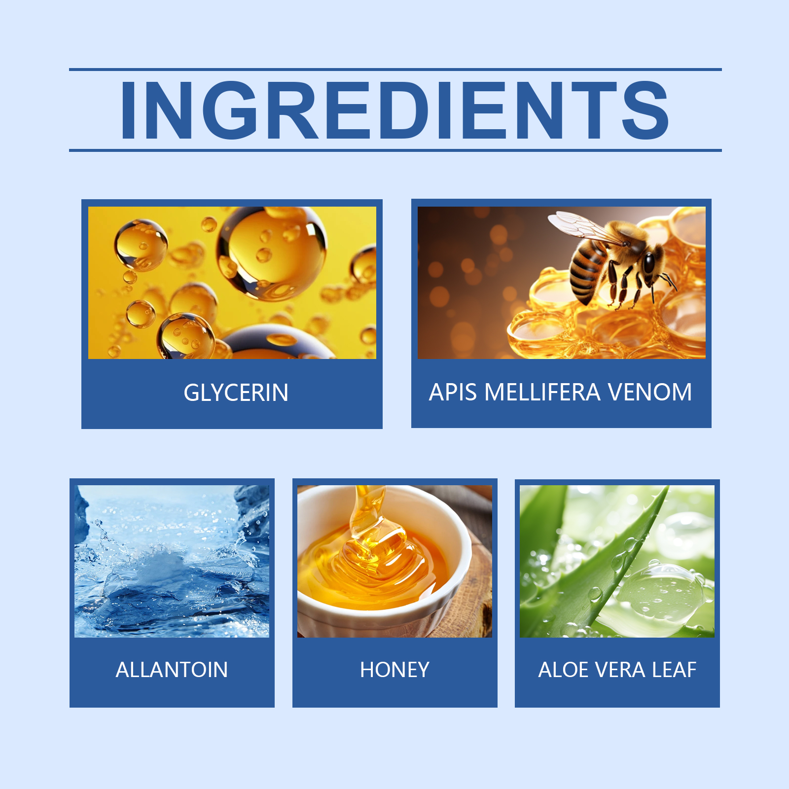 Our bee Venom skin care spray contains bee venom, honey, aloe vera leaves. It can form a moisturizing barrier, let the skin retain moisture, regulate the skin oil secretion, keep the skin fresh. The way to use it is simple: clean the skin and keep it dry. Shake the bottle and spray evenly onto the affected skin area, waiting for absorption. And can reduce redness, restore calm, beautiful skin, can face each day with more confidence.
