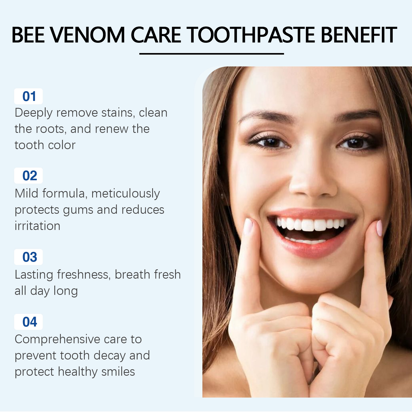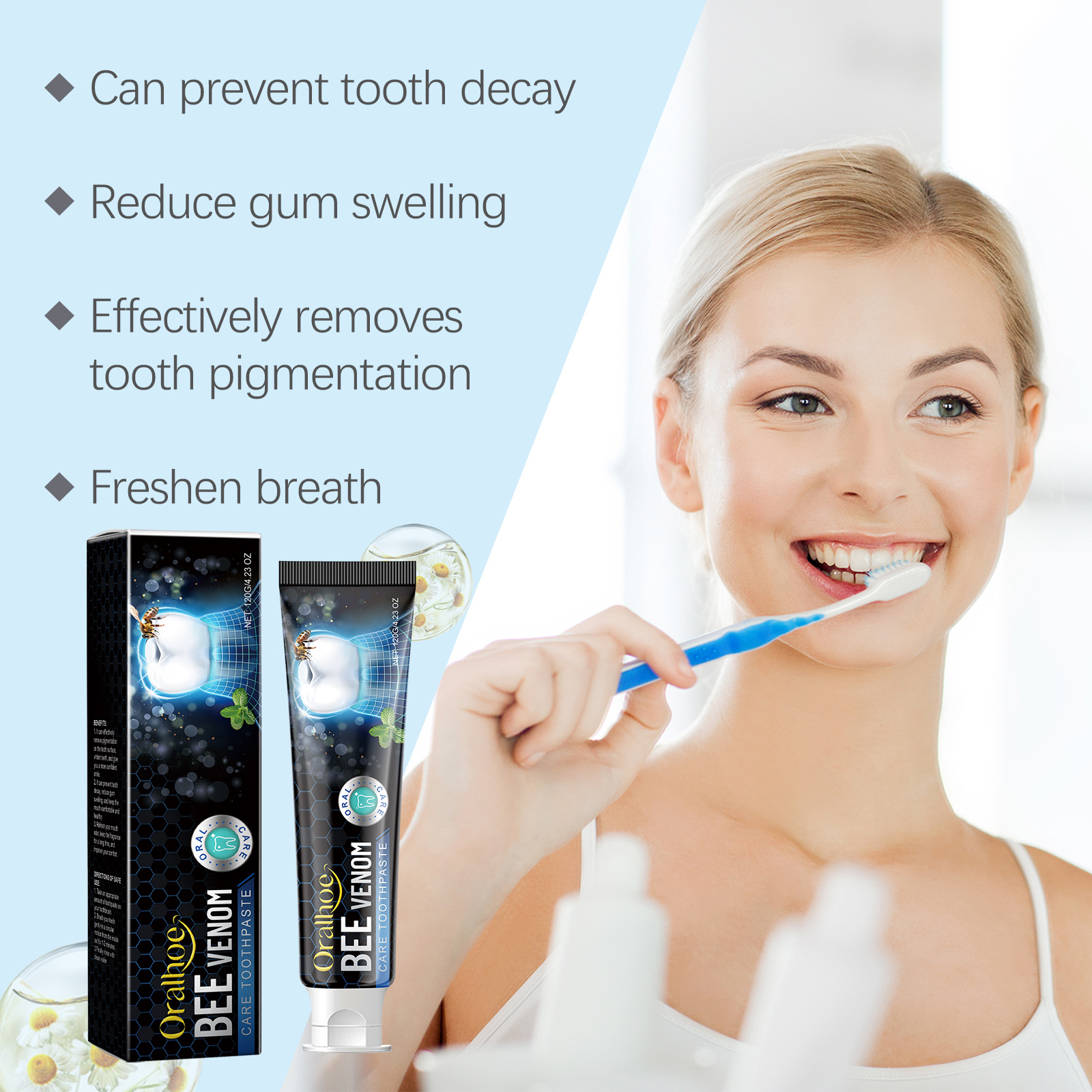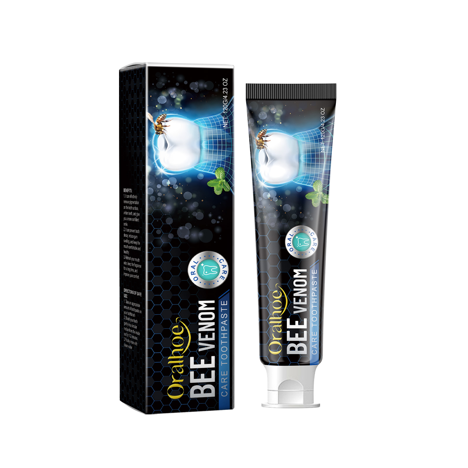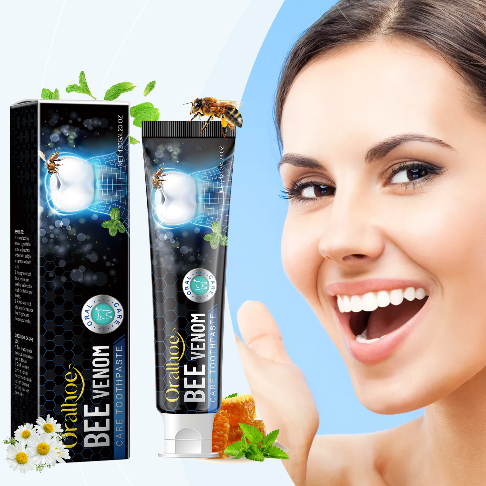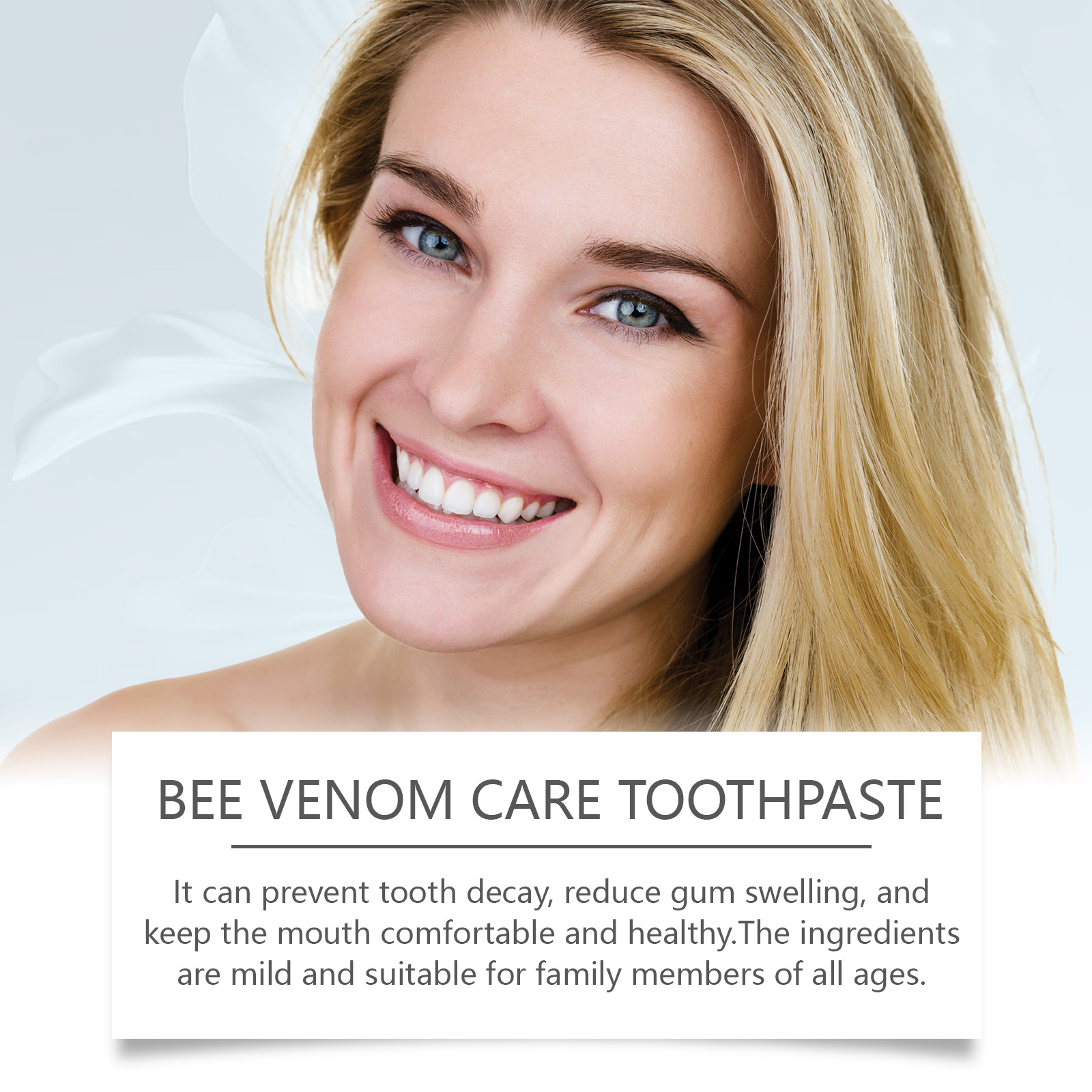 Our bee venom toothpaste contains bee venom, chamomile extract and garlic extract. It prevents tooth decay, reduces gum swelling, and keeps your mouth comfortable and healthy. Vitamin C helps with antioxidants and promotes healthy gums. Whitening and improving periodontal resistance; The ingredients are mild and suitable for family members of all ages. Its use method is very simple: 1. Put a proper amount of toothpaste on the toothbrush; 2. Brush your teeth in a gentle circular motion from inside to outside for 1-2 minutes; 3. Finally rinse with water. Bee venom toothpaste soothes gums, reduces discomfort during brushing and protects sensitive gums.