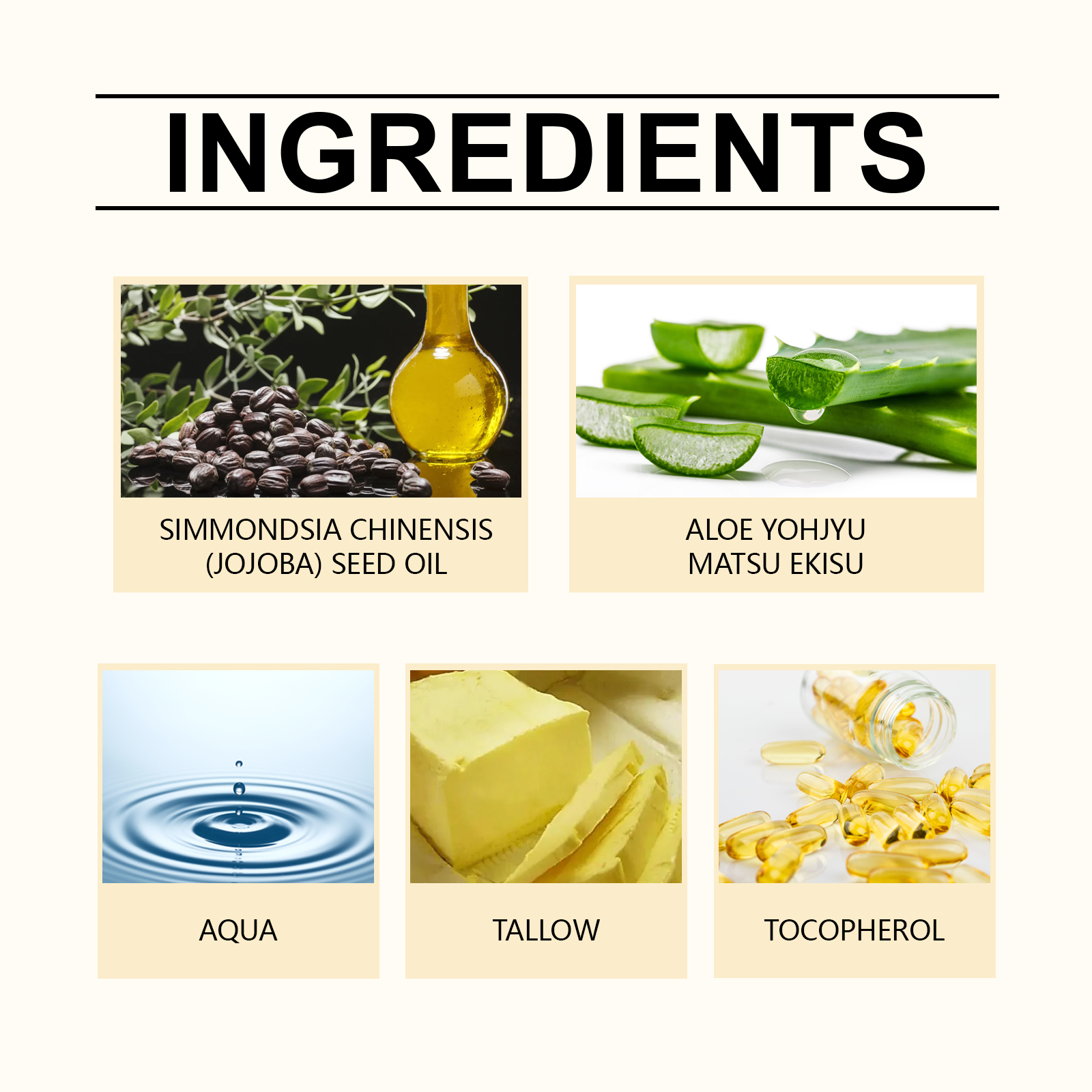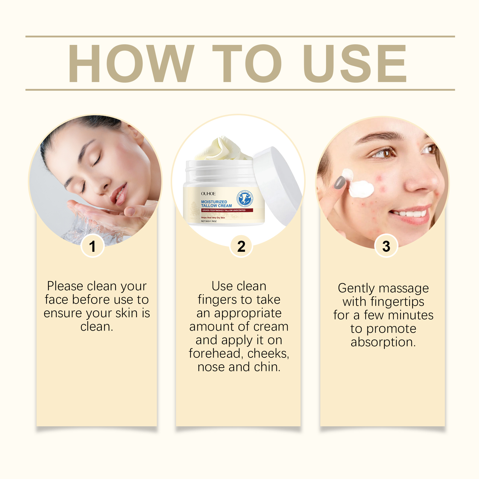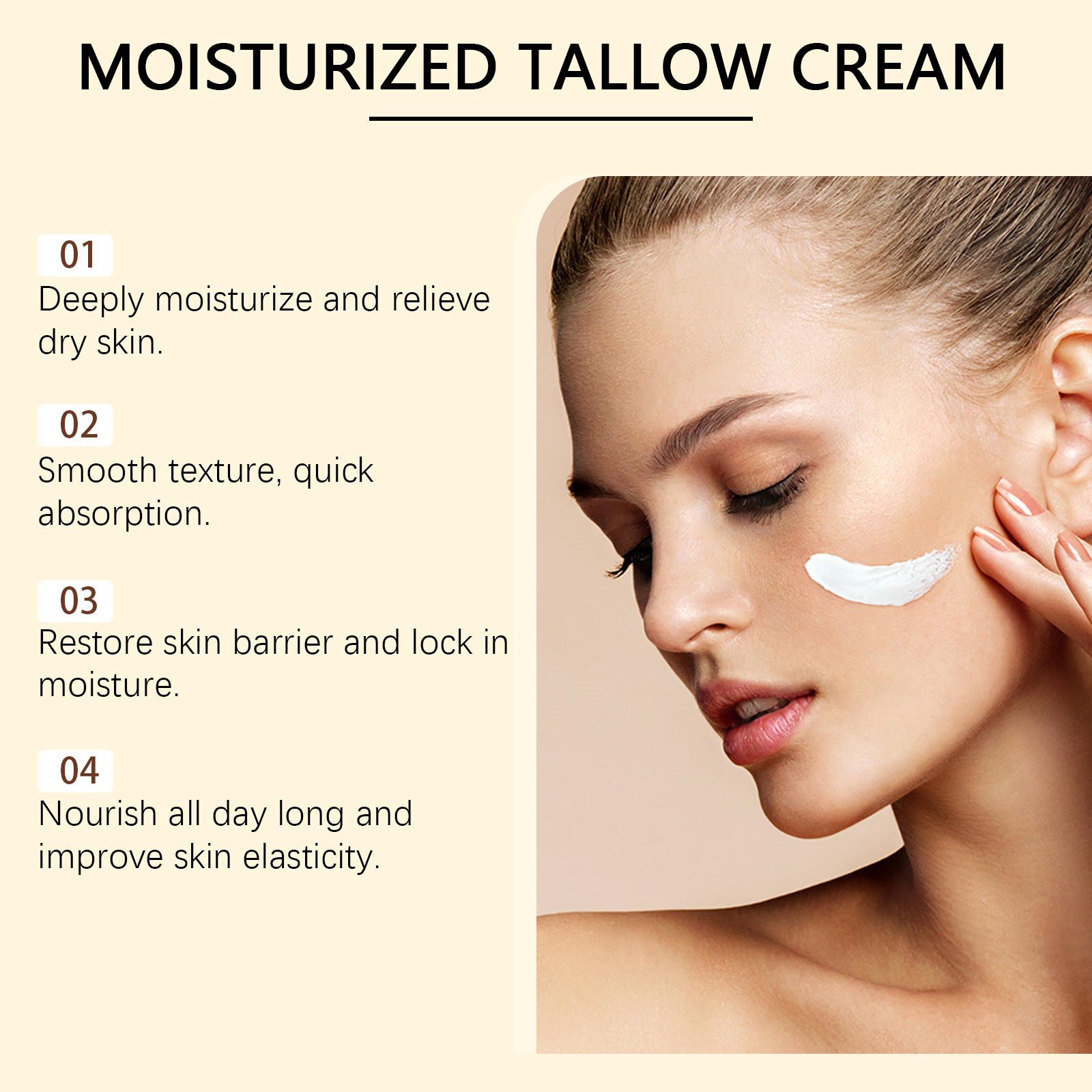 Our tallow moisturizer contains vitamin E, tallow and Jojoba oil. It can effectively moisturize the skin, help lock in moisture, and enhance skin smoothness. Its application method is very simple: 1. Please clean your face before use to ensure that your skin is clean. 2. Apply proper amount of cream to the forehead and cheeks with clean fingers. Nose and chin. 3. Massage gently with your fingertips for a few minutes to promote absorption. A highly effective moisturizing ingredient that provides long-term hydration and keeps skin hydrated throughout the day.