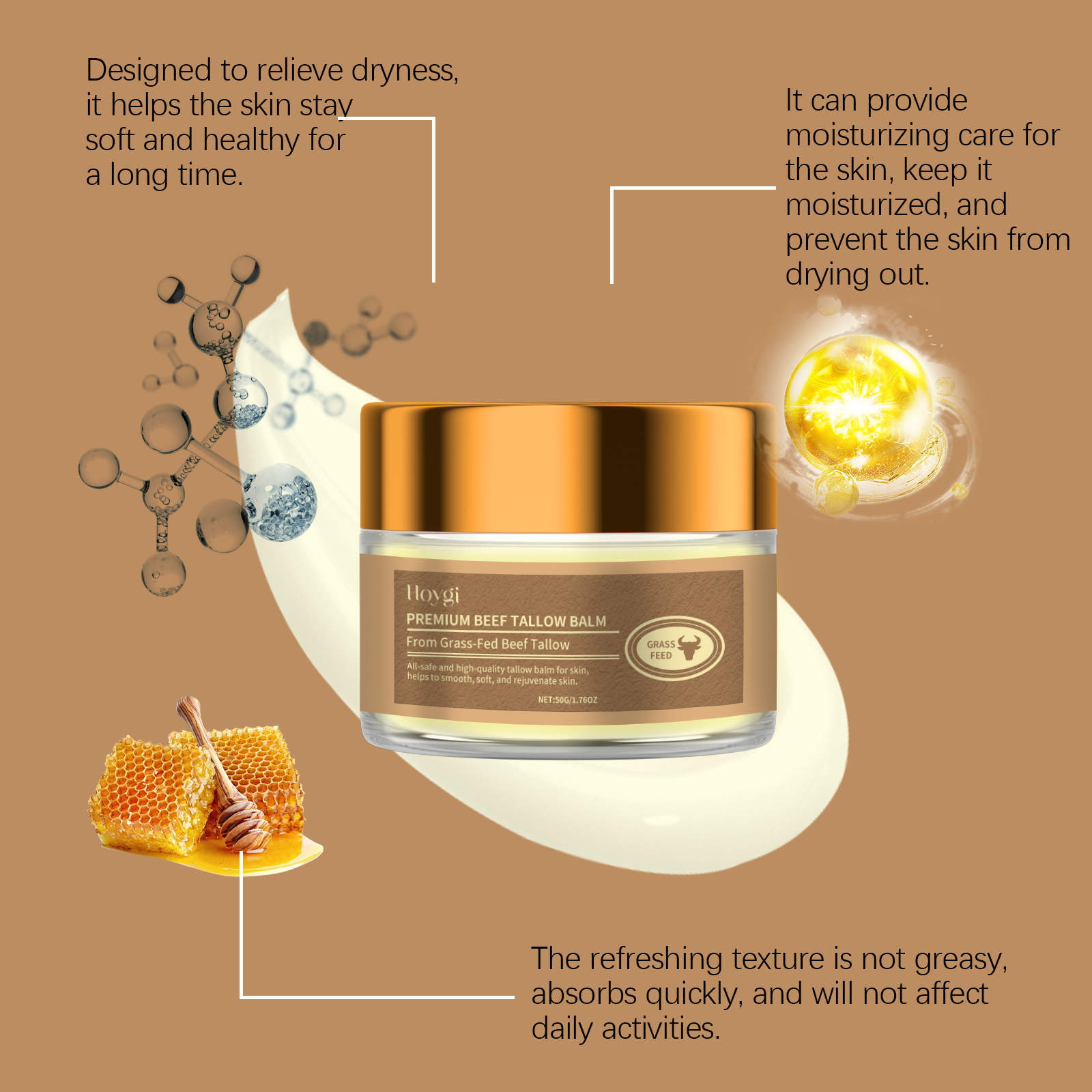 Our tallow moisturizer contains glycerin, tallow and honey. It can be light in texture and not sticky, can quickly penetrate the skin, keep the skin moist and full, and provide a comfortable experience. Makes the skin soft and delicate, helps to improve the skin, and enhances the skin's shine and elasticity. Its use method is very simple: take an appropriate amount of this product gently massage the skin, take an appropriate amount of this product in circles, keep dry, gently apply, so that it is completely absorbed by the face and body. And can form a thin protective barrier, reduce the damage of the external environment to the skin, and improve dry and rough.