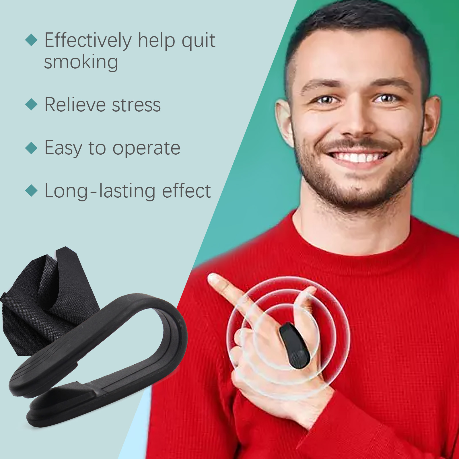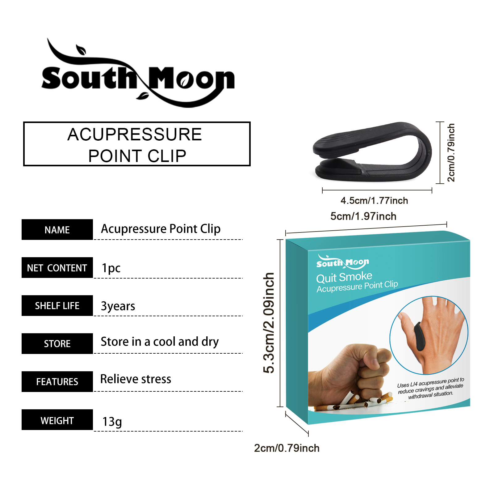 Our body clips contain nylon. It can relieve anxiety and stress caused by quitting smoking and improve mood through acupressure. How to use it is simple: Hold the clip with the curved side facing your palm. Clip it to your hand and gently press it on the acupoint for 5 minutes before removing it. And it reduces the urge to smoke.