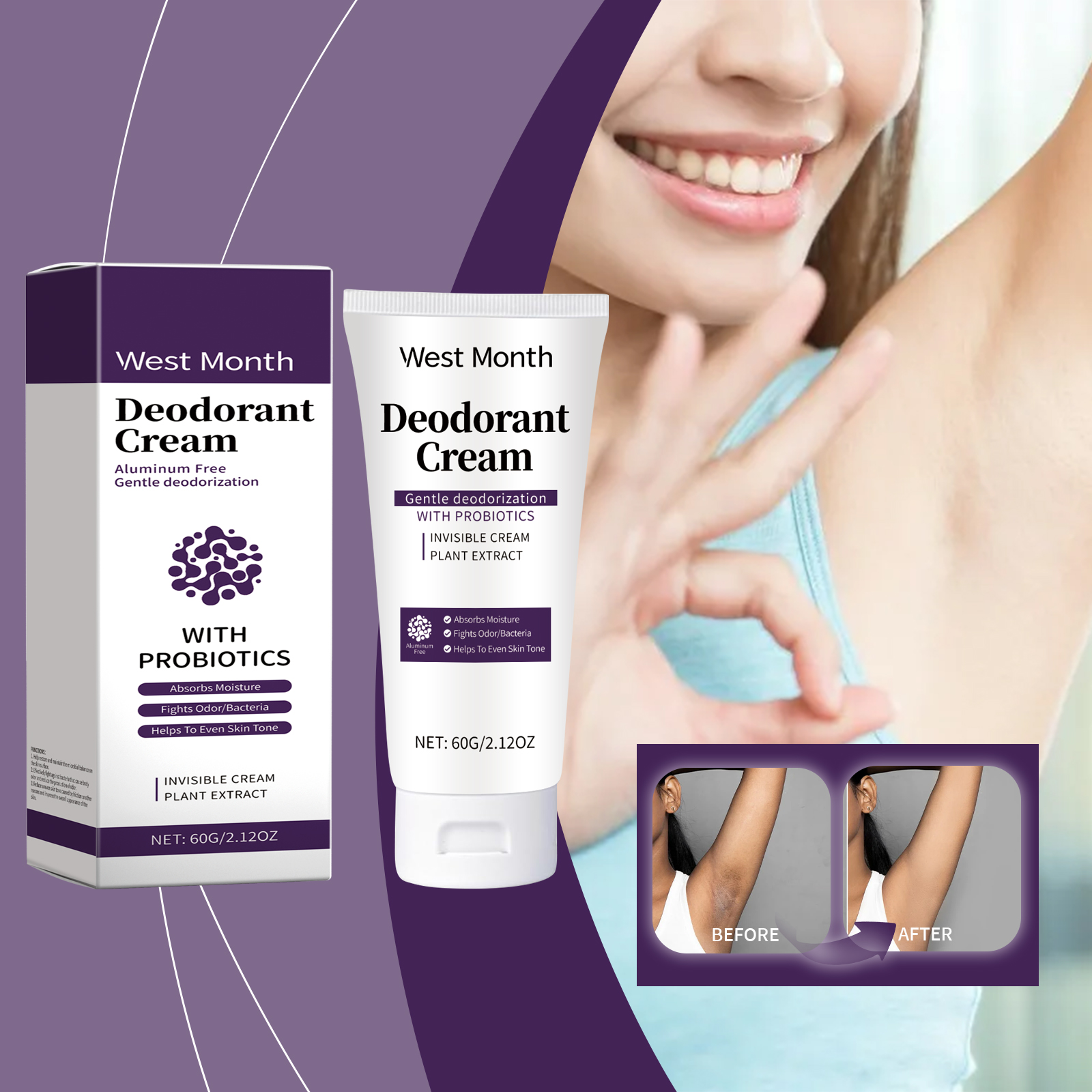 Our body care cream contains tapioca starch and niacinamide. It deodorizes for a long time and keeps you fresh and comfortable. Its use method is very simple: clean the skin, keep the skin dry, take an appropriate amount of deodorant cream, evenly apply to the parts that are easy to sweat, such as armpits, breasts, thighs, etc., gently massage until completely absorbed. And it locks in moisture from the skin.
