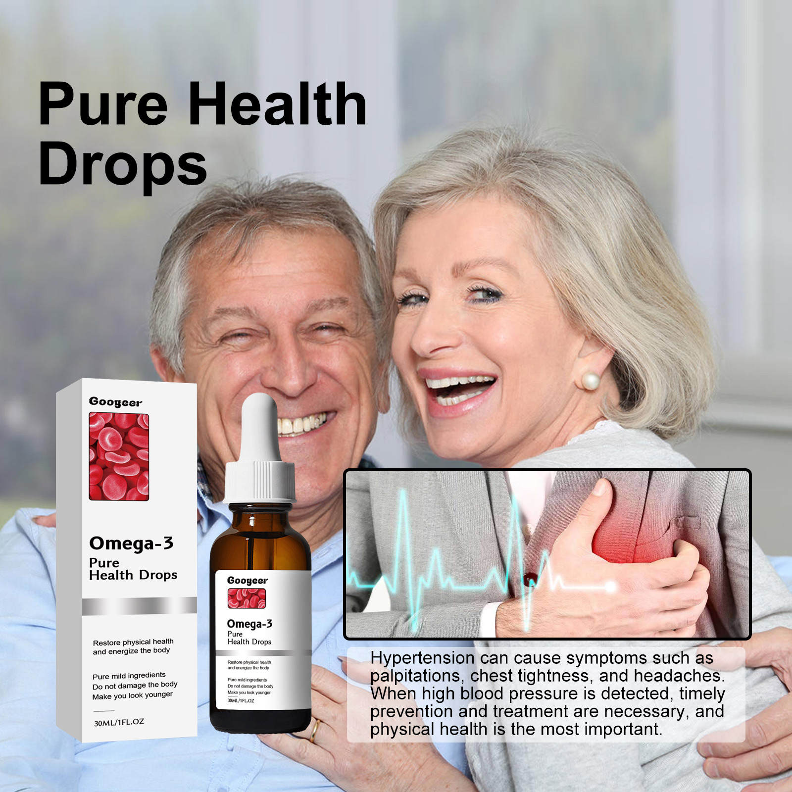 Our Omega-3 Pure Health Drops contain Turmeric Extract, Eucommia Ulmoides Extract, Omega-3 Fatty Acids. It can quickly solve blood pressure problems in the body. It is used to lower blood lipids, blood pressure, and prevent vascular problems such as thrombosis. The way to use it is very simple: shake it well before serving, 1-2 drops at a time. Can quickly and effectively restore physical vitality in the short term.