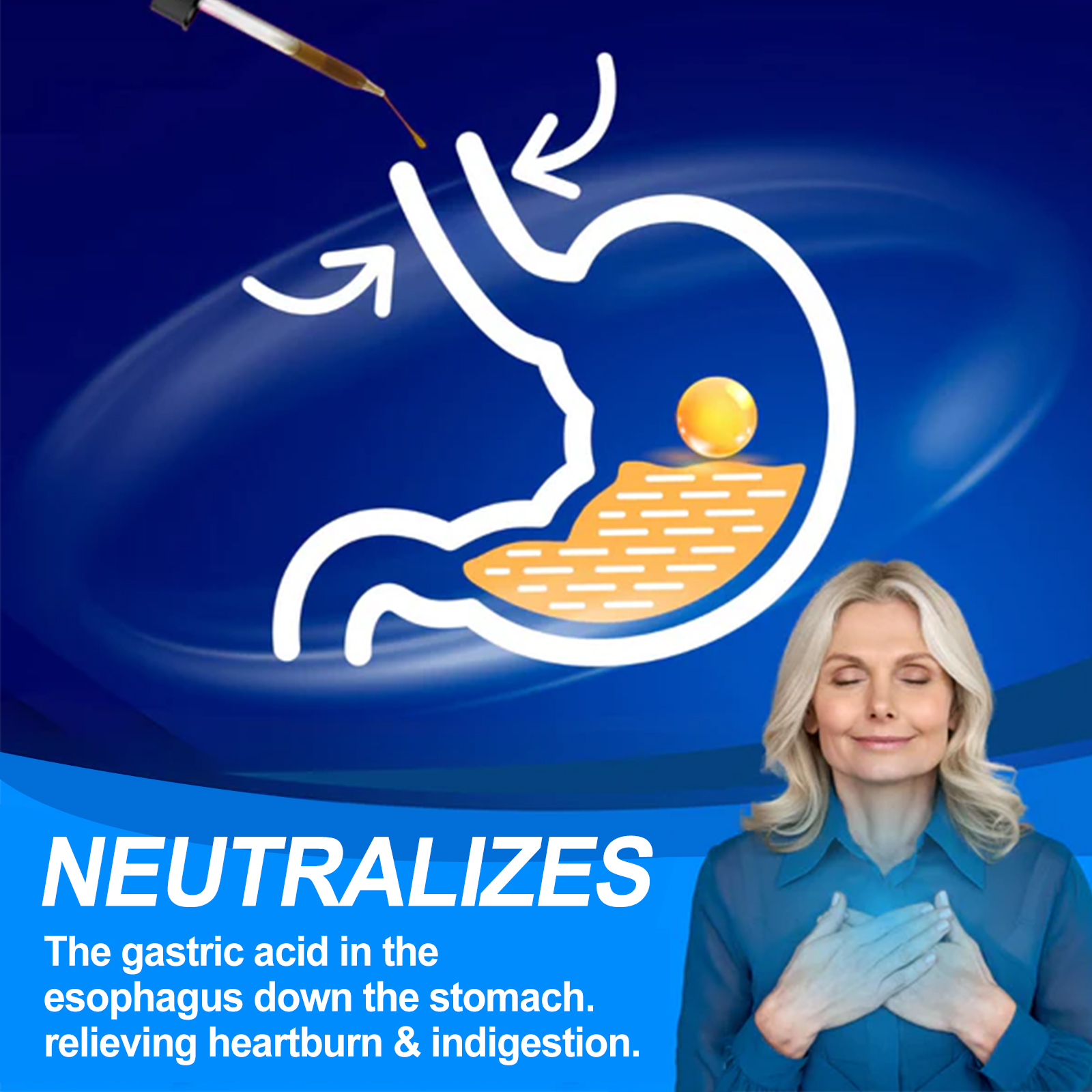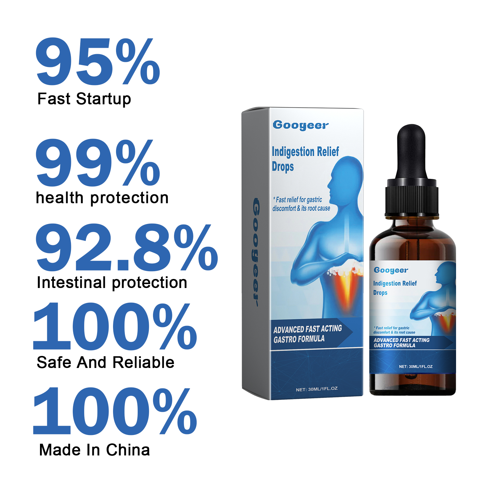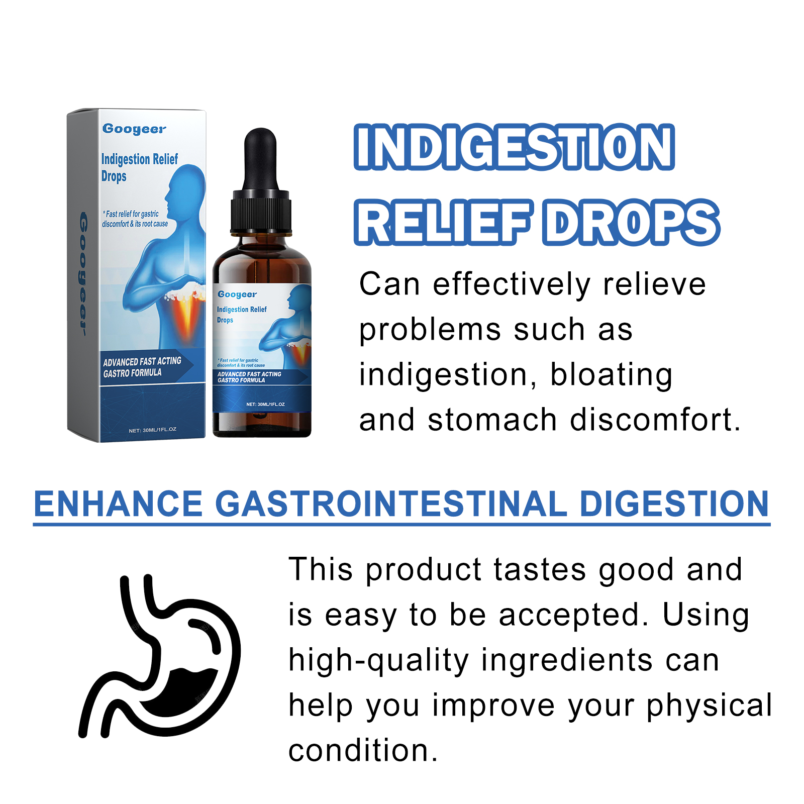Our Indigestion Relief Drops contain Dendrobium, Mullein Extract, Lemon Extract. It can promote digestion and relieve irritation, help prevent discomfort caused by excessive acid in the stomach and esophagus, relieve heartburn and indigestion, and help you promote good health. The way to use it is very simple: shake it well before eating, 1-2 drops each time, 1-2 times a day. It can effectively relieve problems such as indigestion, bloating and stomach upset.