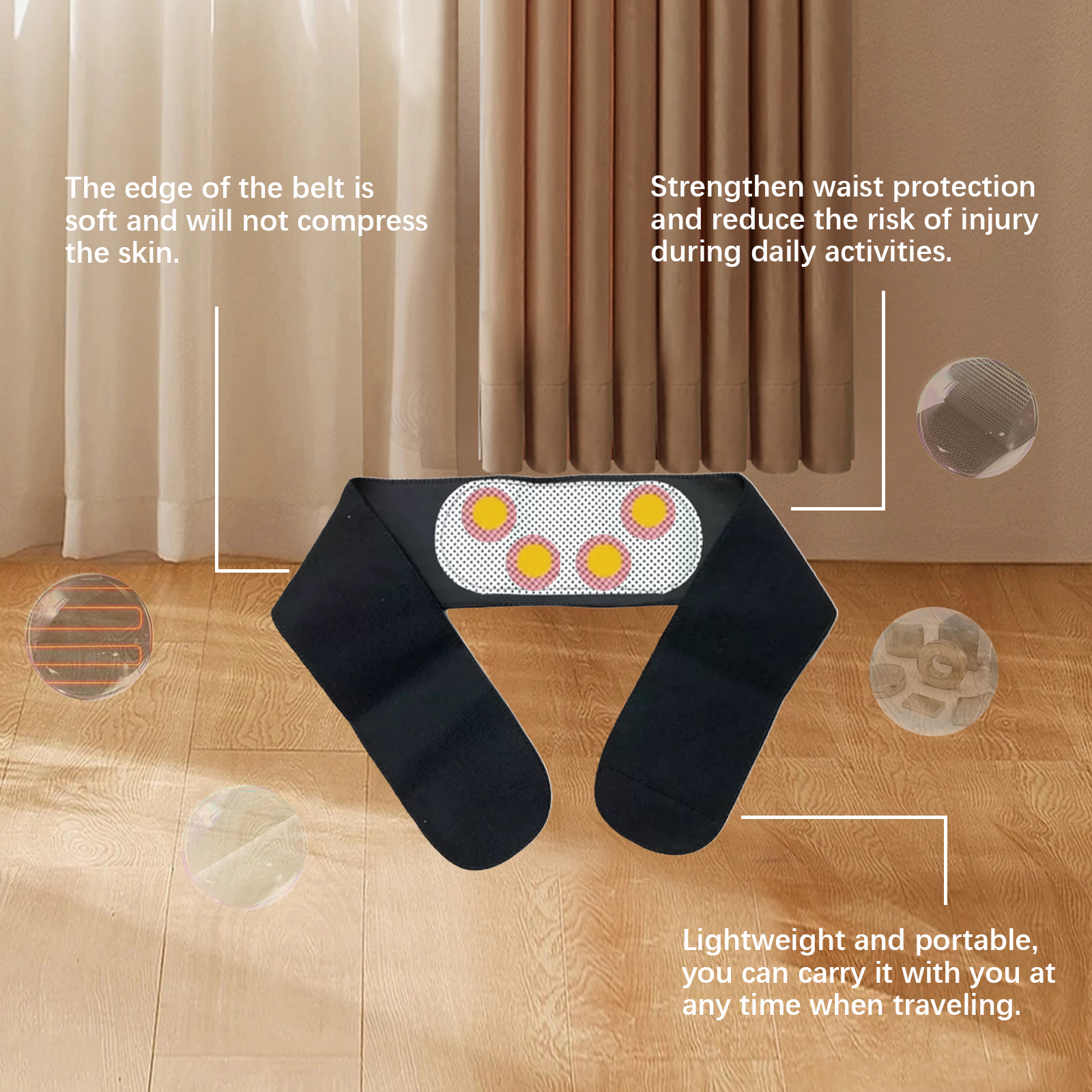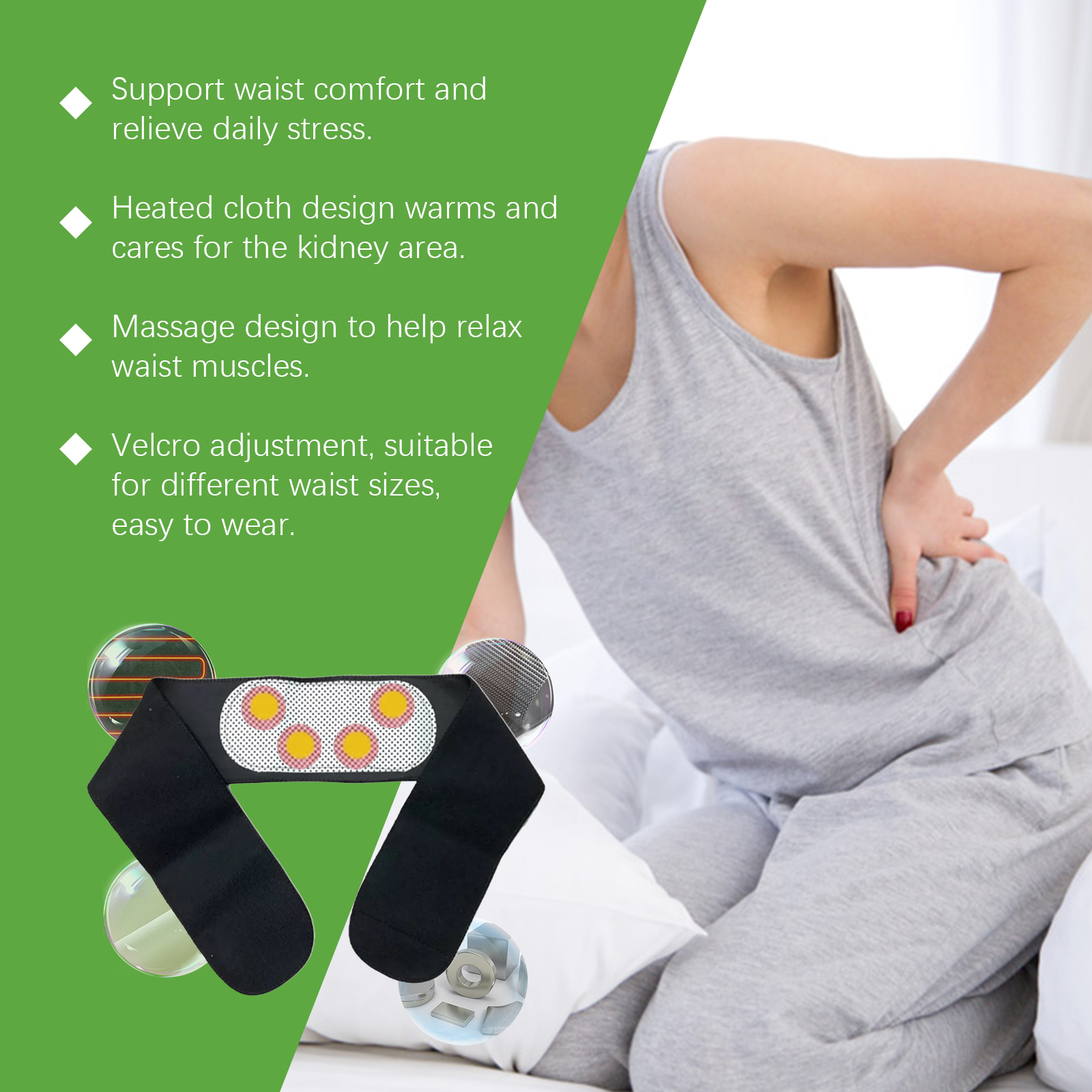 Our body care magnetic therapy contains 20% heating cloth and 5% magnet. It can be easily cleaned and maintained with high durability. Modern exterior design, fashionable when worn out. Its use is simple: Place the belt on the waist so that the massage point is in line with the waist and kidney area. Velcro the belt tightly around the waist. And can be applied to lower back pain, muscle tension and other conditions.