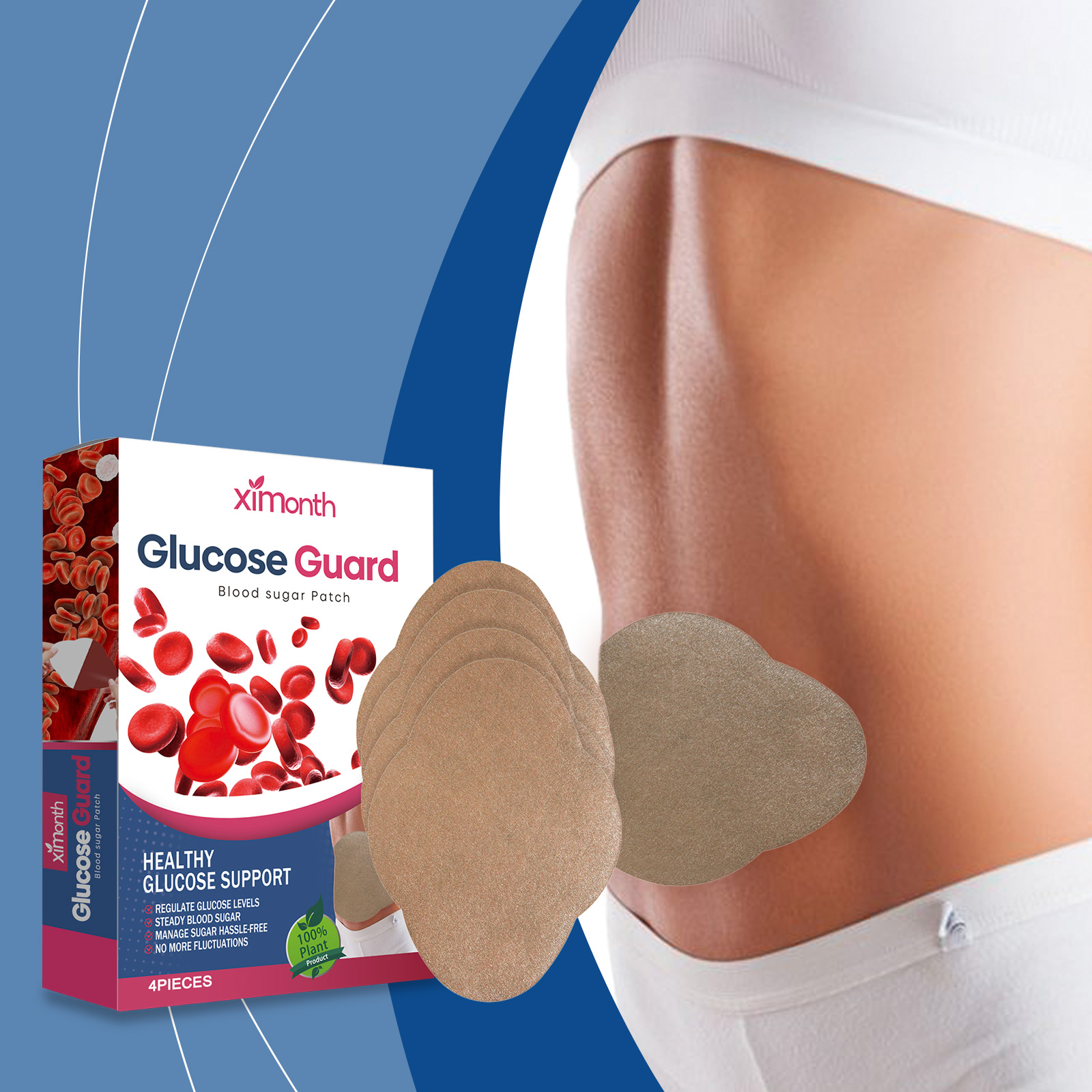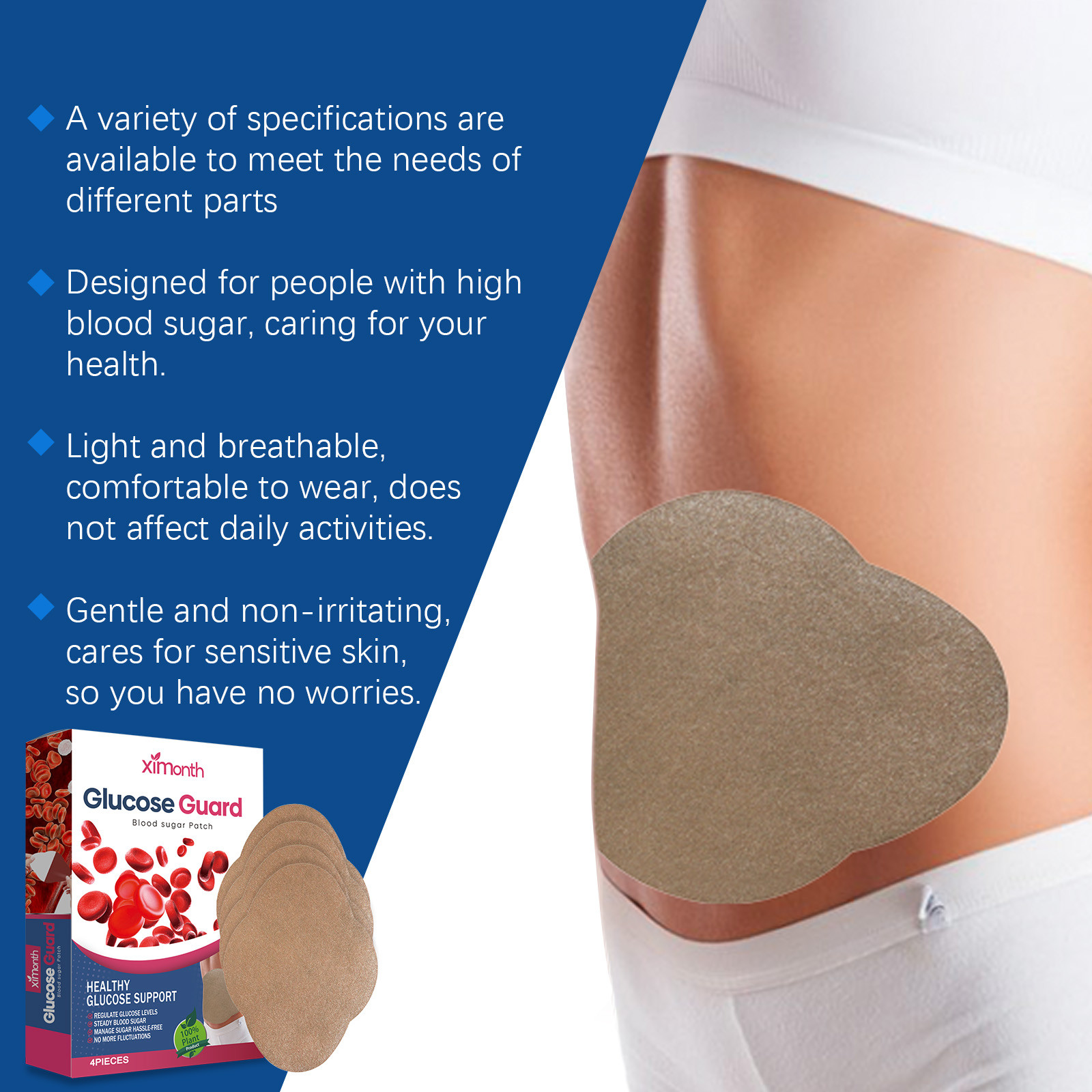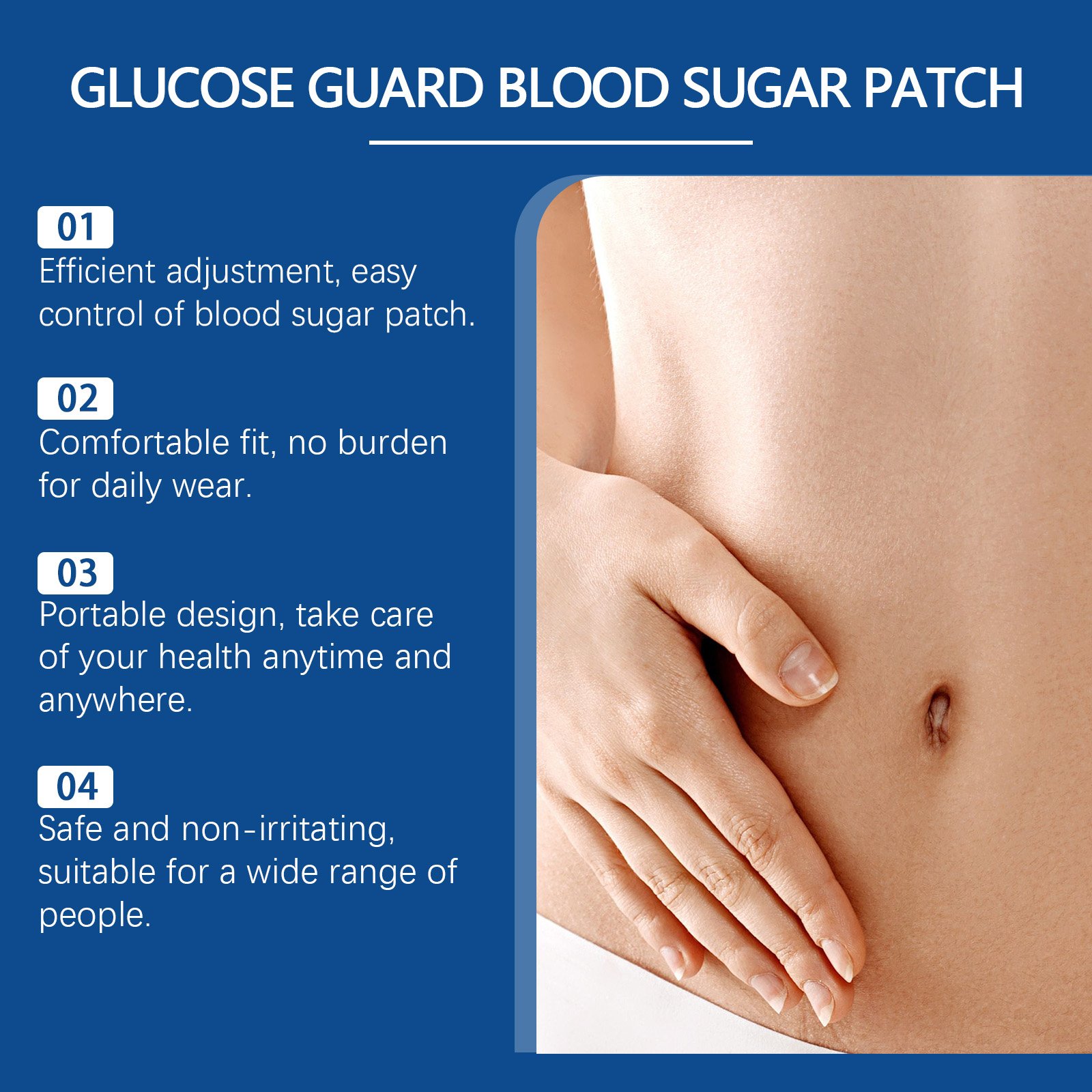 Our body care patches contain cinnamon bark extract, mugwort extract and peppermint oil. It improves blood circulation and helps regulate blood sugar. Soothe the skin and enhance the skin's ability to adapt to the blood sugar patch. Harmonize the aroma and bring physical and mental pleasure. The method of applying it is simple: 1. Clean the skin area of the abdomen and keep it dry. 2. Apply the patch to the skin on the abdomen, making sure the patch is snug to the skin. 3. Wait 2-3 hours and then remove the patch. Continue gentle regulation to avoid blood sugar fluctuations. The material is soft and comfortable to touch.