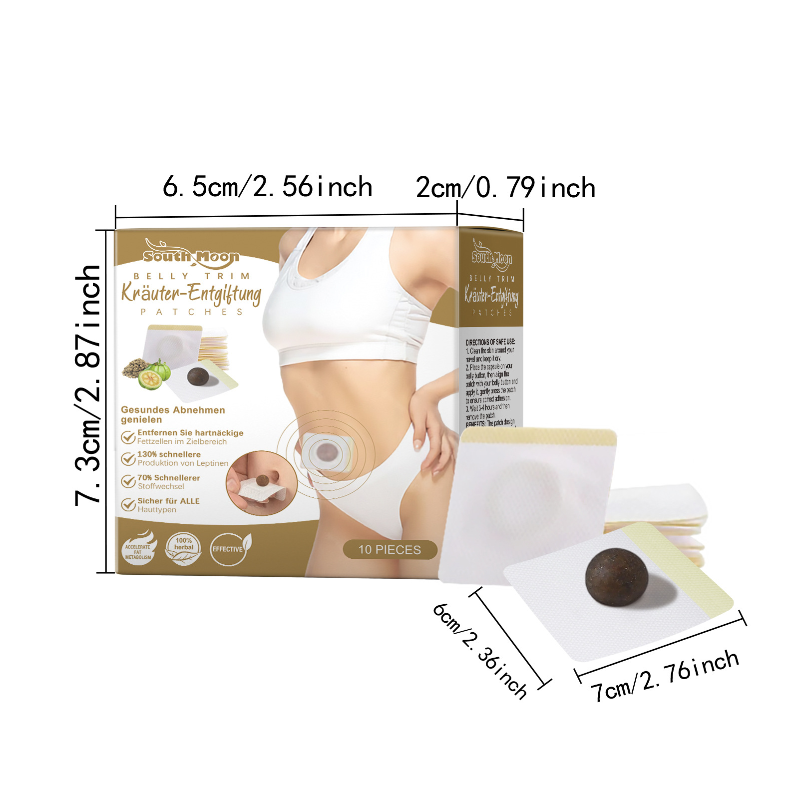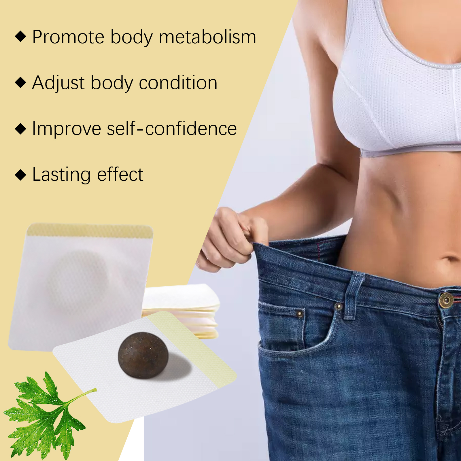 Our herbal detox patches contain glycerin and ginger root extract. It can help break down and reduce excess fat in the body and shape the body. The way to use it is simple: clean the skin around the belly button and keep it dry. Place the capsule on the belly button, then align the patch with the belly button and apply, gently pressing the patch to ensure proper bonding. Wait 3-4 hours and then remove the patch. After use, the skin feels firm and elastic, reduces sagging and improves appearance and texture.