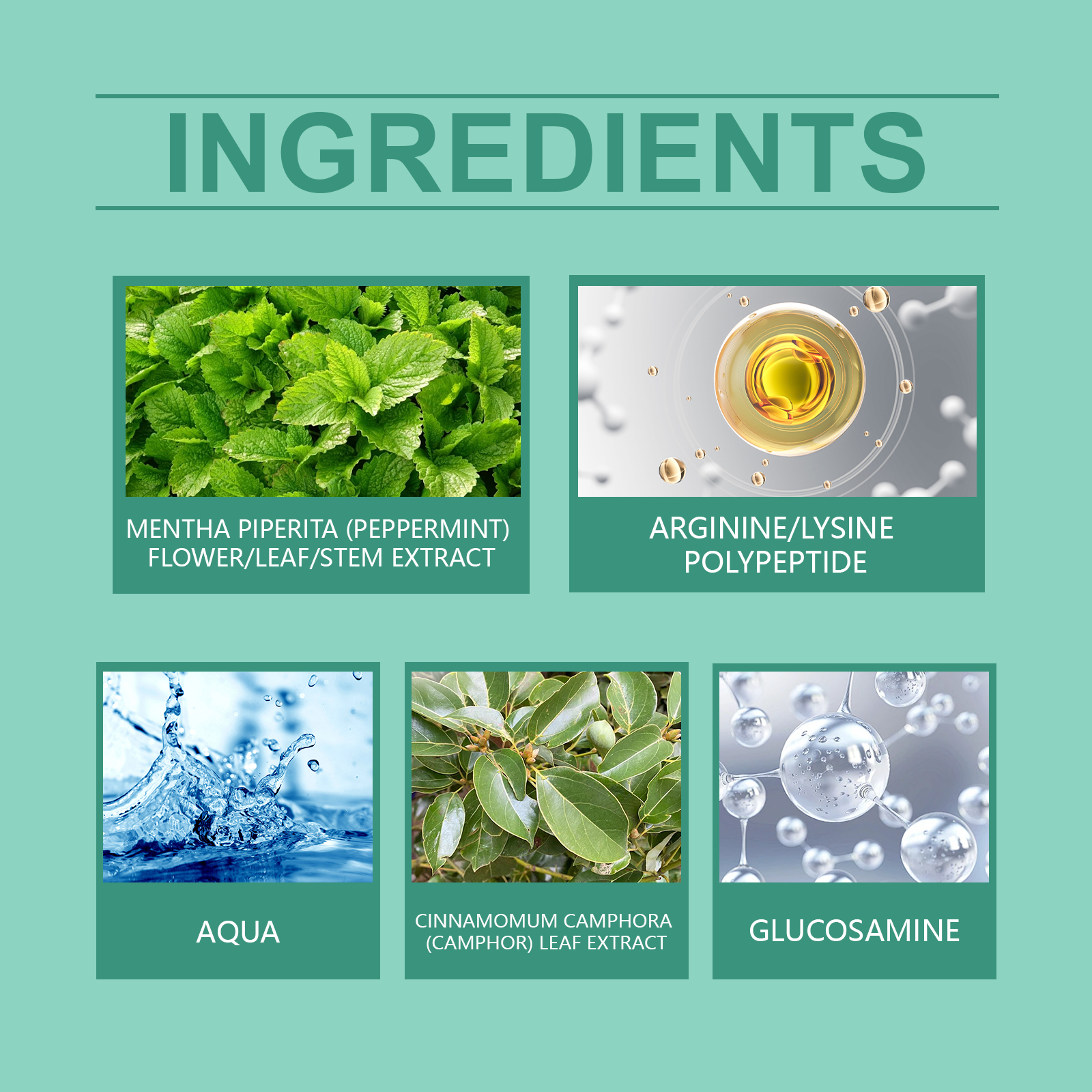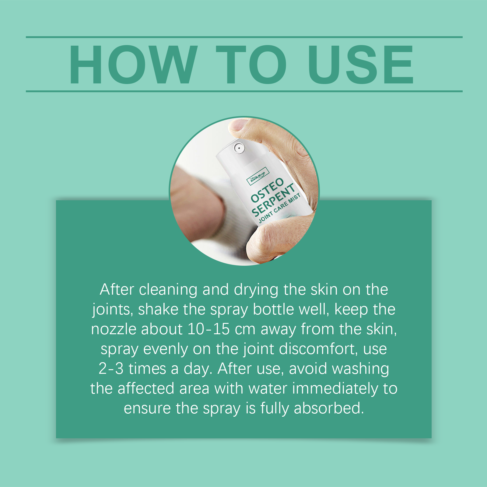 Our body spray contains camphor leaf extract, glucosamine. It can be absorbed quickly, leaving no sticky feeling. Its use method is very simple: after the skin on the joint is clean and dry, shake the spray bottle well, keep the nozzle about 10-15 cm away from the skin and spray evenly on the joint discomfort, use 2-3 times a day. Avoid flushing the affected area with water immediately after application to ensure full absorption of the spray. And menthol and camphor ingredients provide a long-lasting cooling sensation.