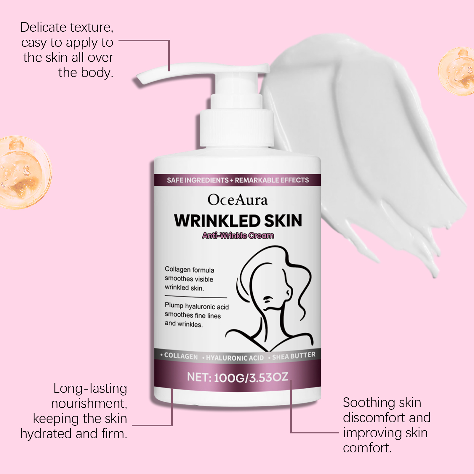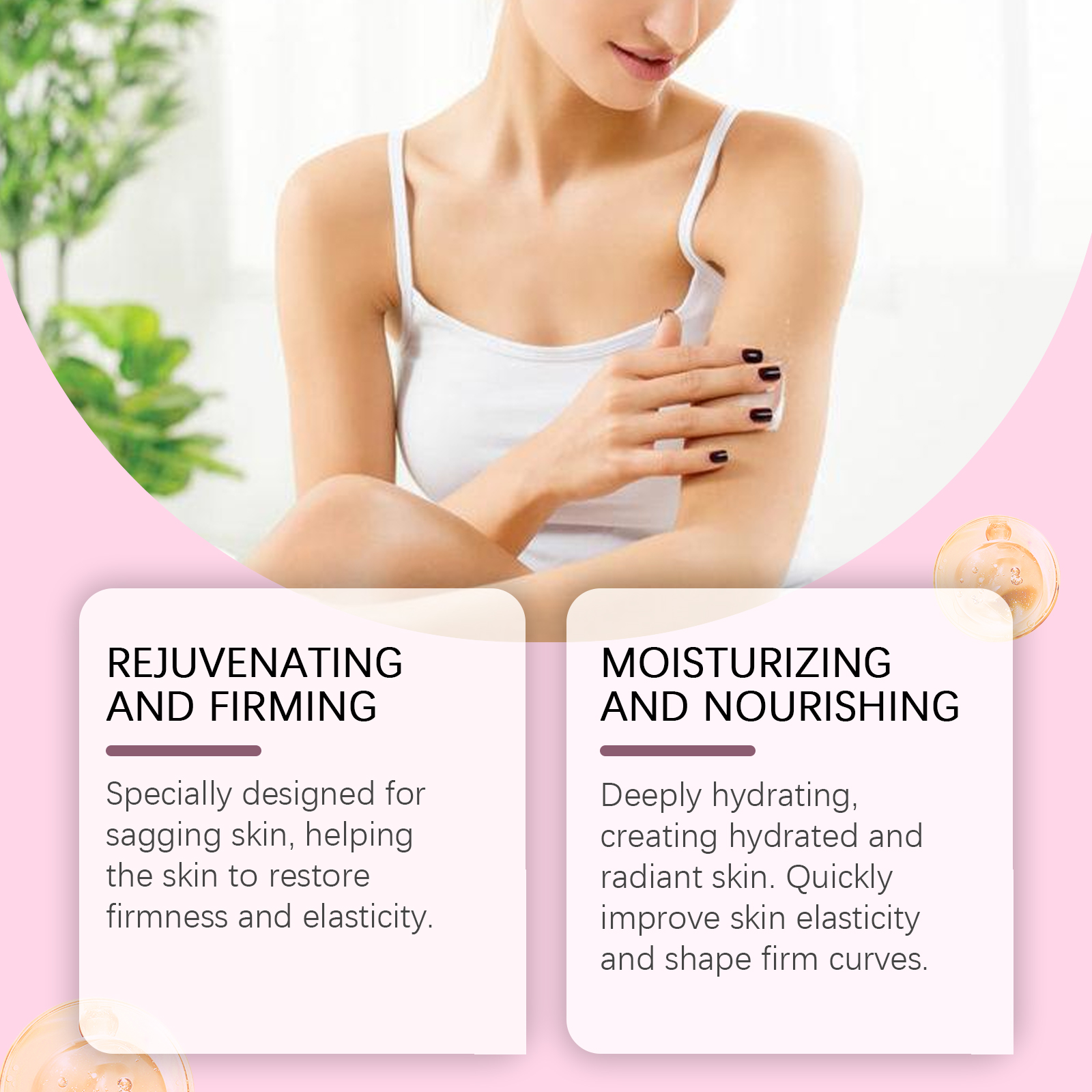 Our body firming cream contains glycerin, collagen, shea butter. It is designed for loose skin to help restore firmness and elasticity. Deep moisturizing, create moist and shiny skin, quickly improve skin elasticity, create tight curves. The way to use it is simple: clean the skin and keep it dry. Take appropriate amount of cream and apply evenly to the skin. Massage gently in circular motions to allow it to be fully absorbed. And it can moisturize for a long time, leaving your skin hydrated all day long. The formula is gentle and suitable for all skin types.