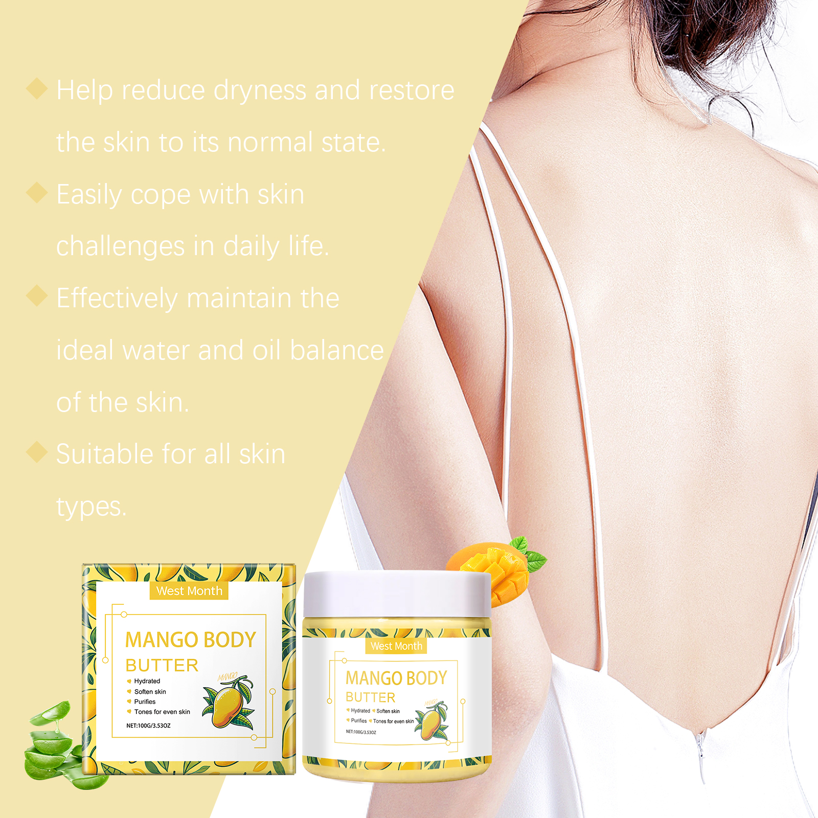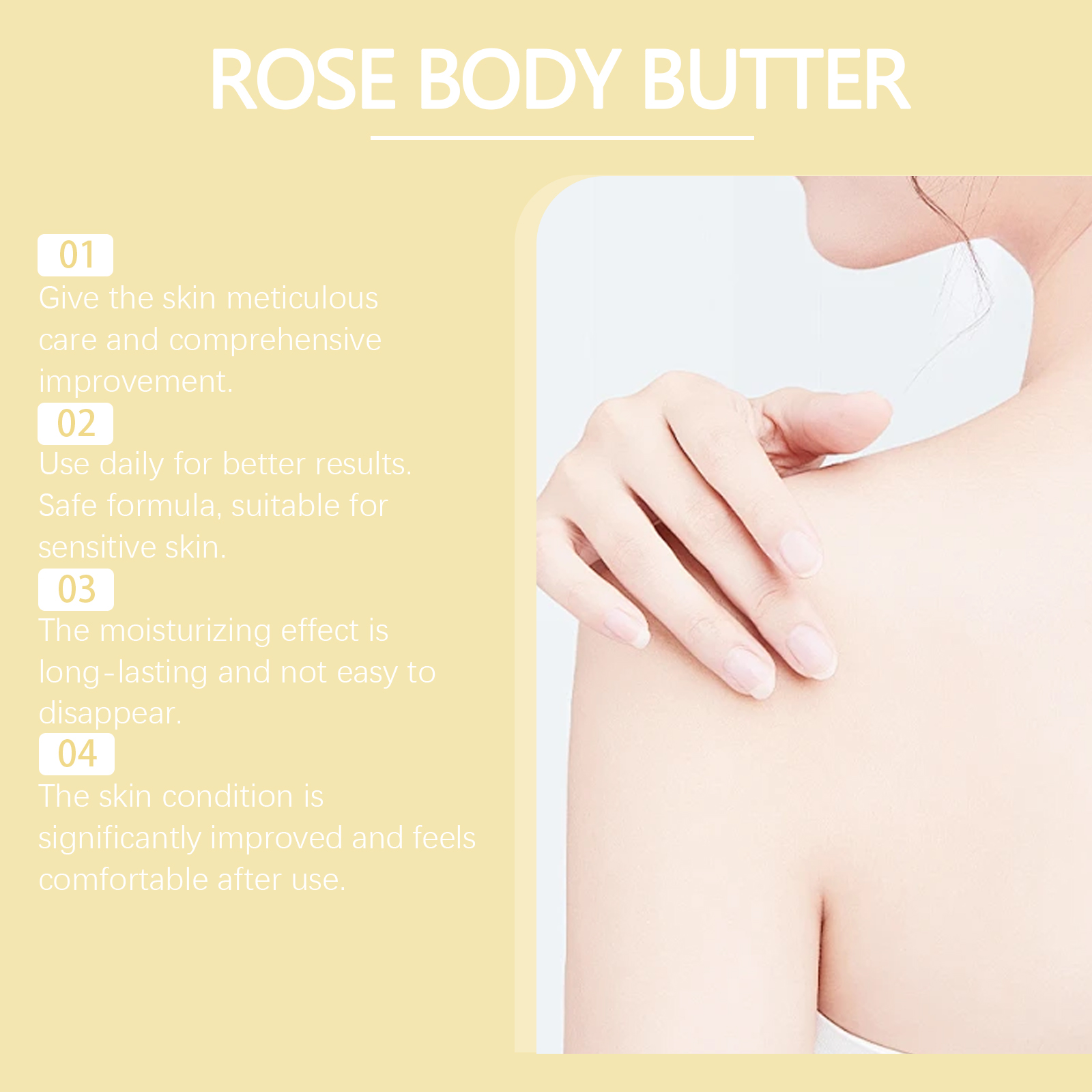Our moisturizing body cream contains aloe vera leaf extract and shea butter. It continuously releases moisture into the skin. Effectively reduce the rough texture and restore the delicate touch of skin. The way to use it is simple: clean the skin. Apply appropriate amount of this product evenly on the body skin. Massage gently in circular motions to promote absorption. And can strengthen the skin's ability to resist the external environment.