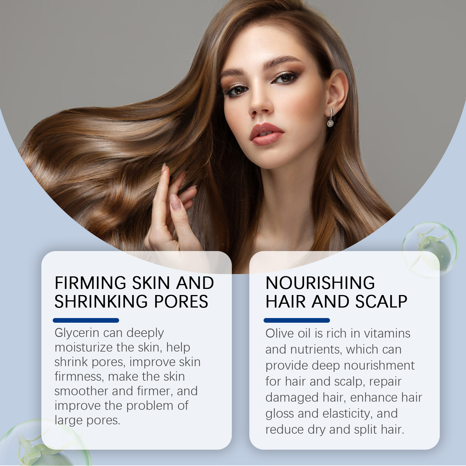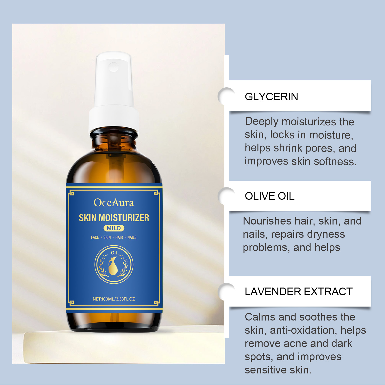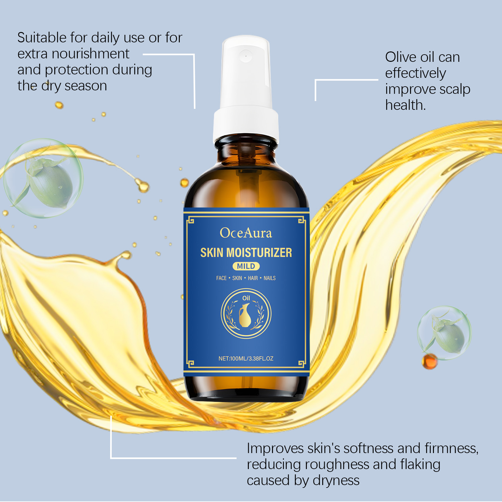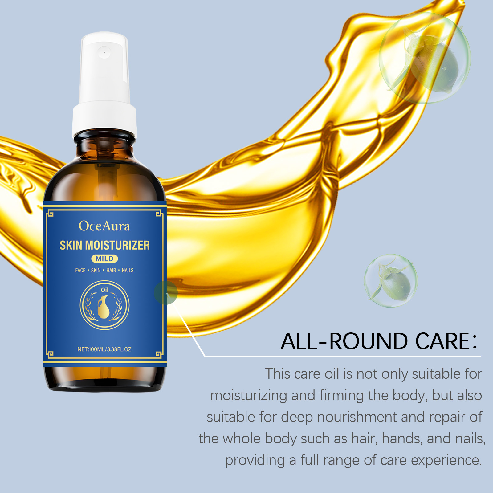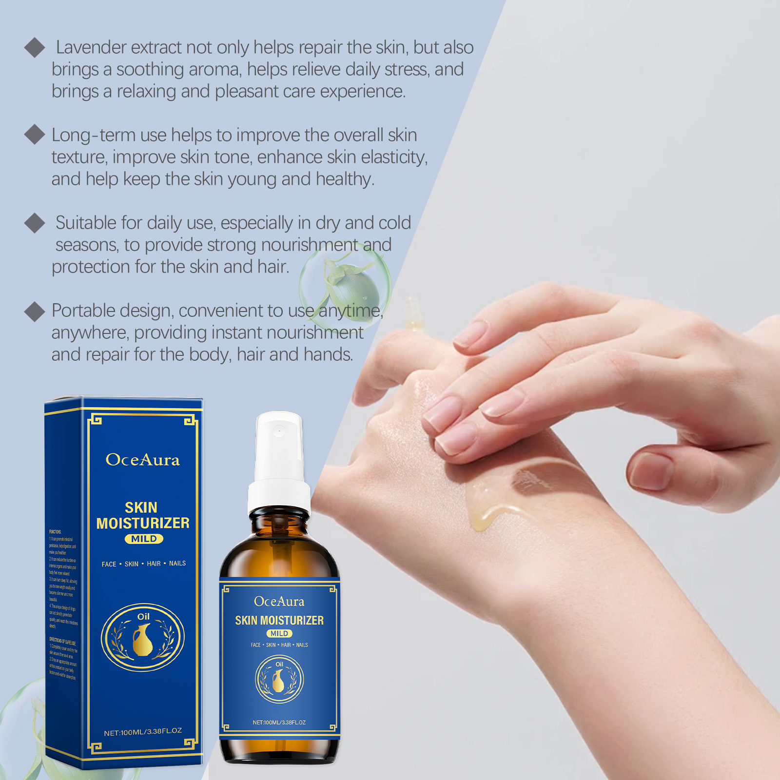 Our body moisturizing oils contain glycerin and olive oil. It can deeply moisturize the skin, help to shrink pores, improve skin firmness, make skin smoother and firmer, and improve the problem of enlarged pores. Rich in vitamins and nutrients, olive oil can provide deep nutrition for hair and scalp, repair damaged hair, enhance hair shine and elasticity, and reduce hair dryness and breakage. Its use is very simple: For hair: clean and dry hair, apply appropriate amount of this product to hair, gently massage until absorbed. For skin: Clean and dry skin, apply appropriate amount to face and body, gently massage until absorbed. For nails: Clean and dry hands, apply appropriate amount of this product around the nails and gently massage until absorbed. And lavender extract has soothing and restorative effects that help moisturize and protect dry hand skin, repair fragile nails and cuticles, and make hands softer and smoother.