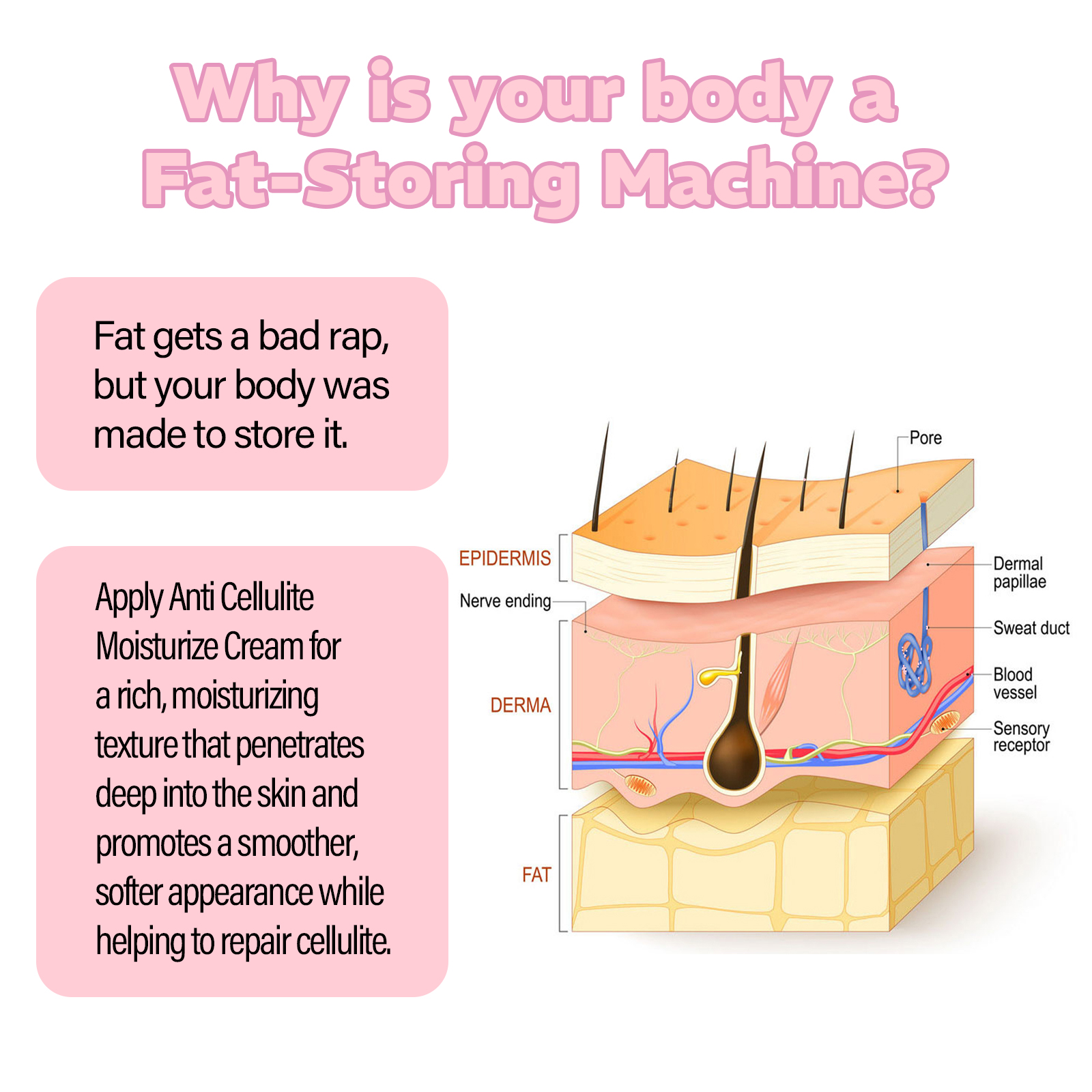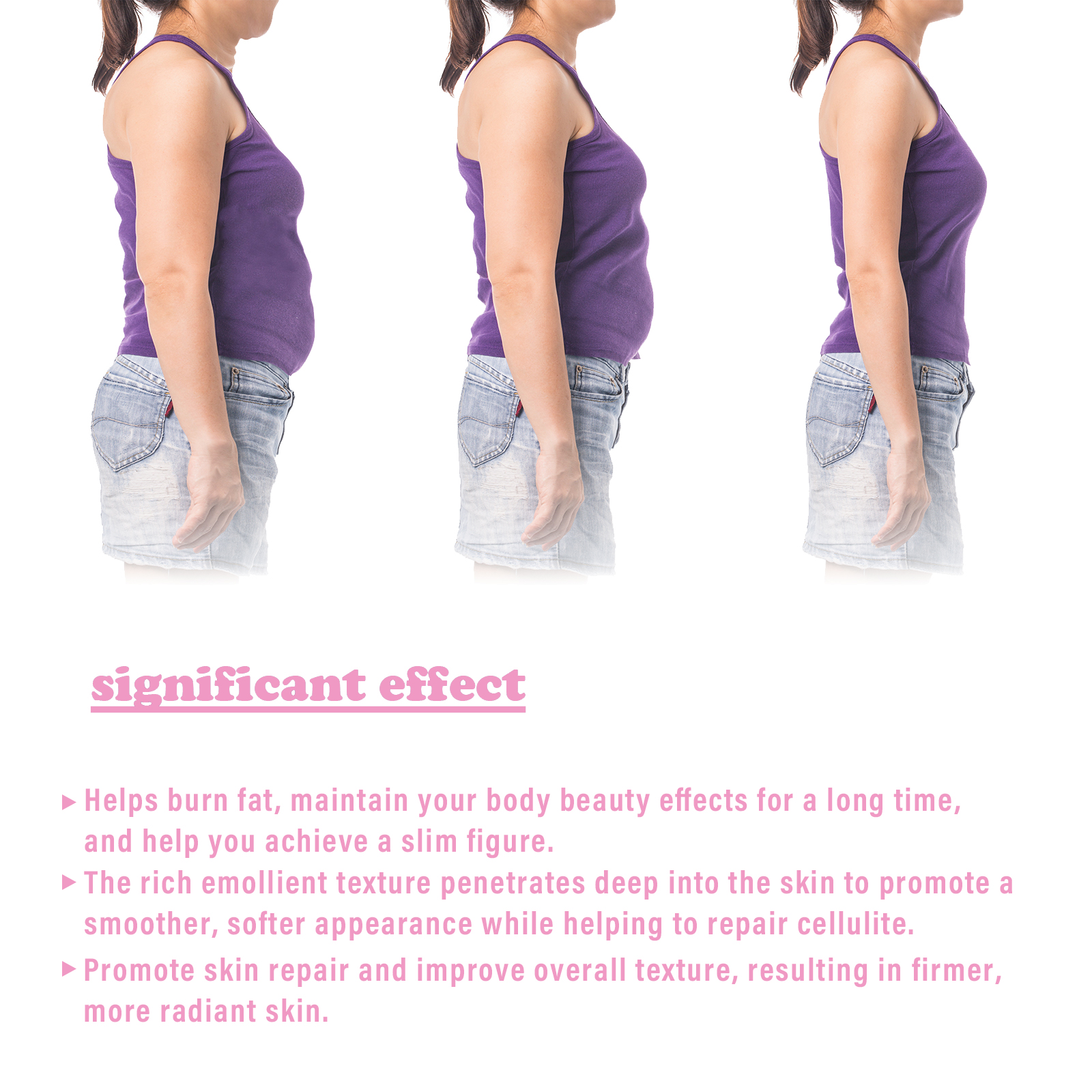Our Anti Cellulite Moisturize Cream contains Butyrospermum Parkii(Shea) Oil, Squalene, Arbutin. It can help burn fat, maintain your body beauty results for a long time, and help you achieve a slim figure, which can penetrate deep into the skin to promote a smoother, softer appearance while helping to repair cellulite. Its use method is very simple: after cleansing, take appropriate amount of this product on the abdomen, thighs and other parts, gently massage until absorbed. It can promote skin repair, improve the overall texture, and make skin firmer and more radiant.